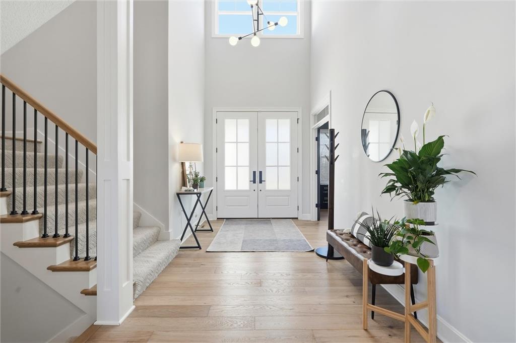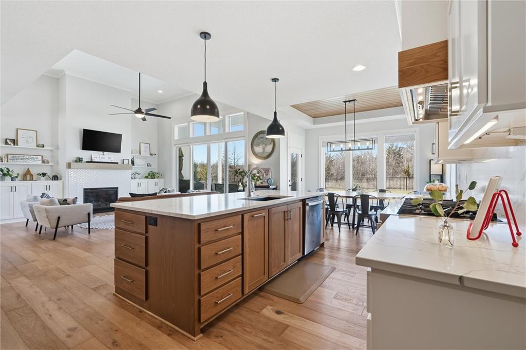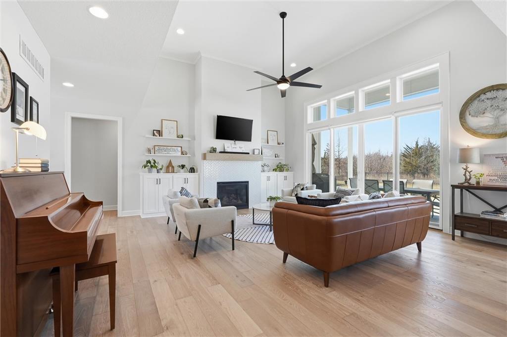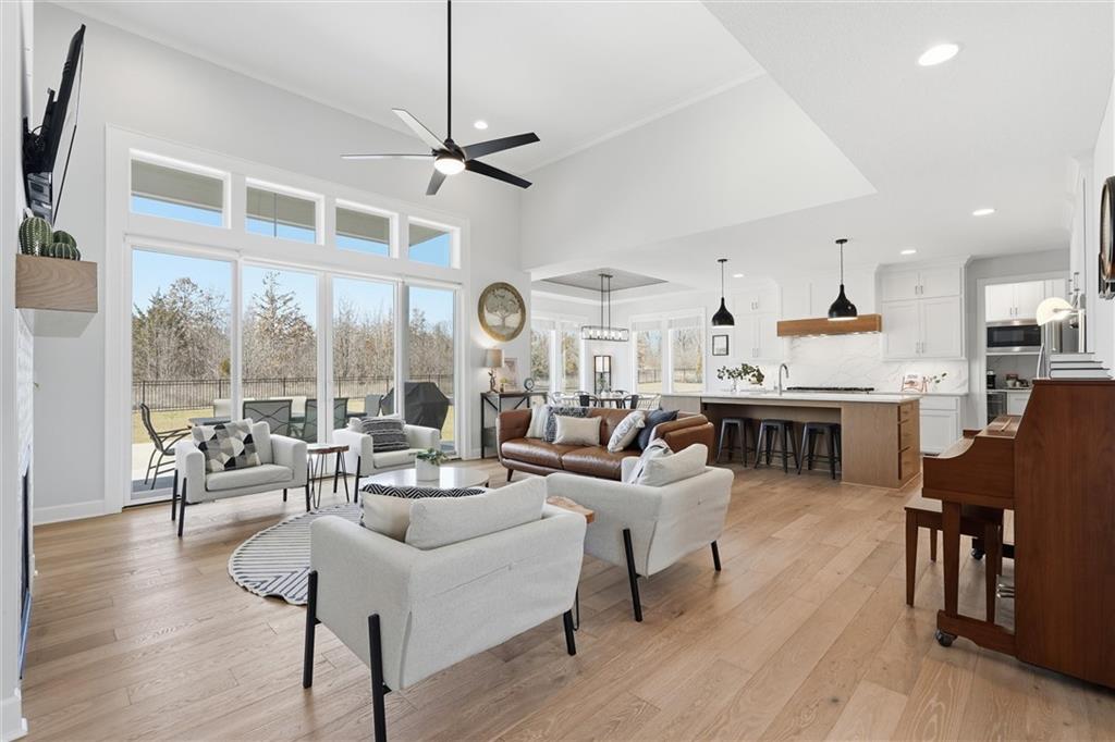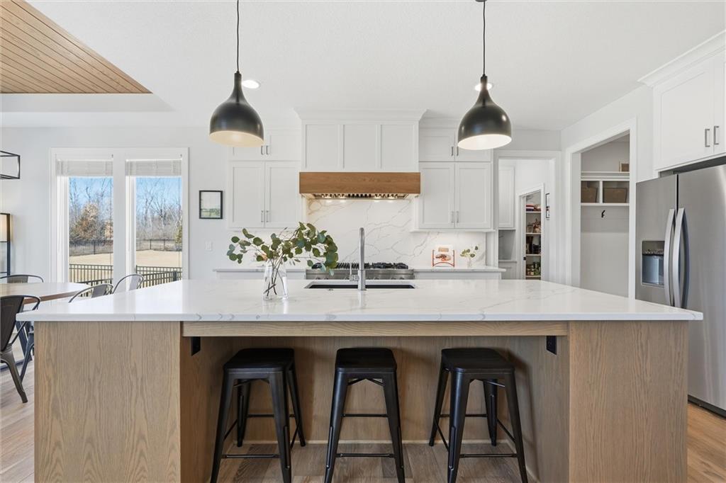 Why wait for new construction when you can move into a beautifully designed 1.5-story home completed in 2022? Enjoy the benefits of newer construction in a quiet, established neighborhood without ongoing construction traffic and noise. This thoughtfully designed layout offers seamless flow and high-end finishes for everyday living and elevated entertaining. Sellers are motivated and welcome serious offers. A double-door, two-story entry opens to a light-filled main level featuring a luxurious primary suite with private bath and connected laundry room, a dedicated office with French doors, and a striking two-story great room that creates a grand yet inviting atmosphere. At the heart of the home, the gourmet kitchen showcases a 48” JennAir 6-burner gas range, double ovens, floor-to-ceiling cabinetry, deep lower cabinets with pull-outs, and a spacious butler’s pantry adjacent to a walk-in pantry—ideal for hosting and everyday efficiency. Upstairs, three bedrooms with en-suite baths provide comfort and privacy. The finished lower level expands the living space with luxury vinyl plank flooring, a wet bar, guest bedroom, full bath, and versatile bonus room. Situated on a premium fenced lot backing to green space, the home offers open views and beautiful year-round sunsets, along with an expanded concrete patio and walkway with room for a future pool. Additional highlights include a tankless water heater, generous storage, zoning to Blue Valley School District, approximately 10 minutes to St. Thomas Aquinas High School, and convenient access to shopping, dining, and recreation throughout South Johnson County. Community amenities include a pool, playground, and walking trails. A thoughtfully designed home blending quality craftsmanship with comfort in a highly desirable setting.