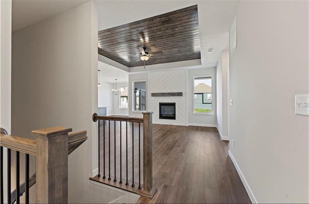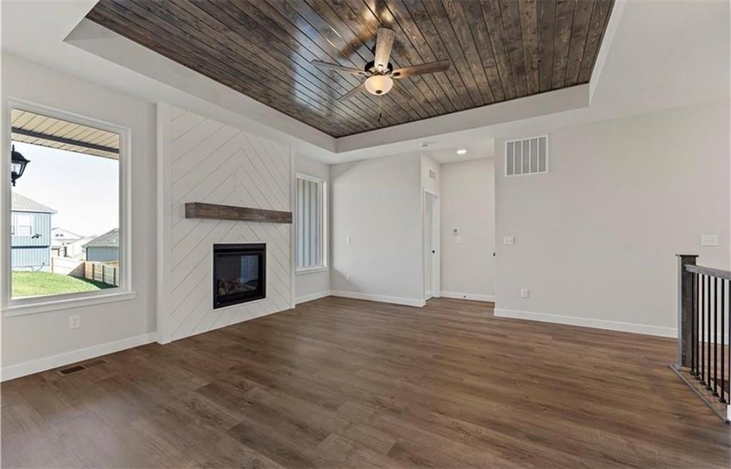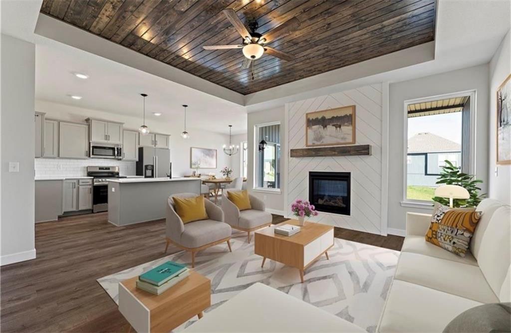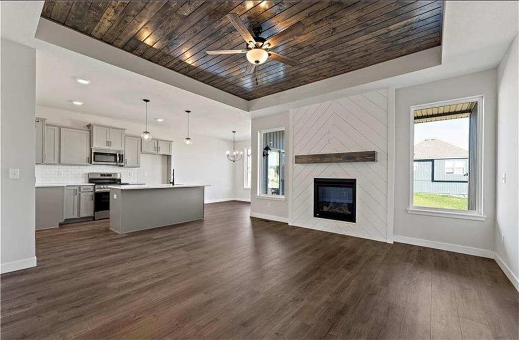 Welcome to The Kinley in Woodhaven! This spacious 3-bedroom, 2-bath ranch sits on one of the community’s premium lots, backing to beautiful greenspace and walking trails. Enjoy added privacy from your covered deck—perfect for relaxing or entertaining. The open-concept kitchen features quartz countertops, a large center island, walk-in pantry, and luxury vinyl plank flooring that flows throughout most of the main living areas. Bedrooms offer comfortable carpeting, creating a warm and inviting retreat. This home truly has it all with thoughtful design and quality finishes throughout. Woodhaven is one of the fastest-growing communities in Platte County, offering incredible future amenities including a pool, play area, walking trails, covered pavilion, and pickleball courts.