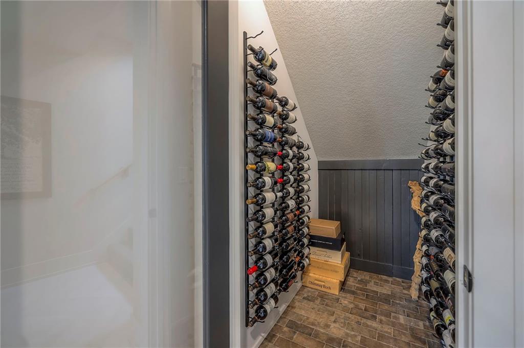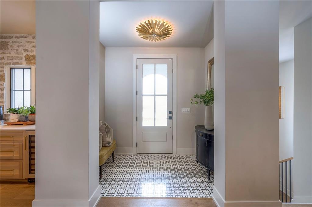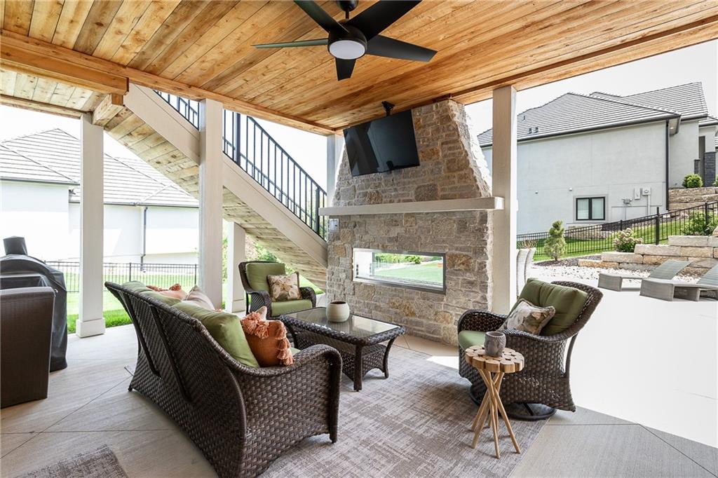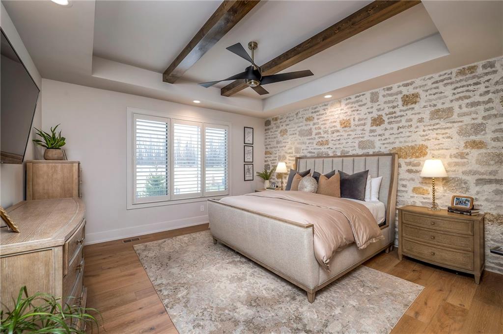 Welcome to this stunning, thoughtfully designed home where elevated finishes and exceptional entertaining spaces come together beautifully. The dramatic living room showcases soaring 18-foot ceilings, custom built-ins, and charming arched fireplace, all complemented by wide-plank hardwood flooring that flows seamlessly throughout the main living areas. Plantation shutters throughout the home and elegant arched doorways add timeless architectural character, style, and privacy. The designer kitchen is both sophisticated and functional, featuring a gas range, quartzite countertops, striking stone feature wall, wine fridge, and abundant workspace for everyday living or hosting. Just off the kitchen, a spacious butler’s pantry provides additional storage and convenience, complete with a second oven, making entertaining effortless. The kitchen opens directly to a large covered deck with low-maintenance Trex decking, creating the perfect indoor-outdoor connection. The luxurious primary suite is a private retreat, highlighted by a beamed ceiling and stone feature wall, and complemented by a spa-inspired bath offering LED mirrors, quartzite countertops, a soaking tub, and an oversized walk-in shower. The laundry room is conveniently located just off the primary suite for added everyday ease. The walk-out lower level is designed for unforgettable gatherings, featuring a media room and an impressive entertaining bar with waterfall-edge quartzite countertops, microwave, drink fridge, and wine fridge. Step outside to the patio, partially covered for year-round enjoyment, complete with a see-through stone fireplace and hot tub, creating an inviting outdoor living space perfect for relaxing or hosting guests.