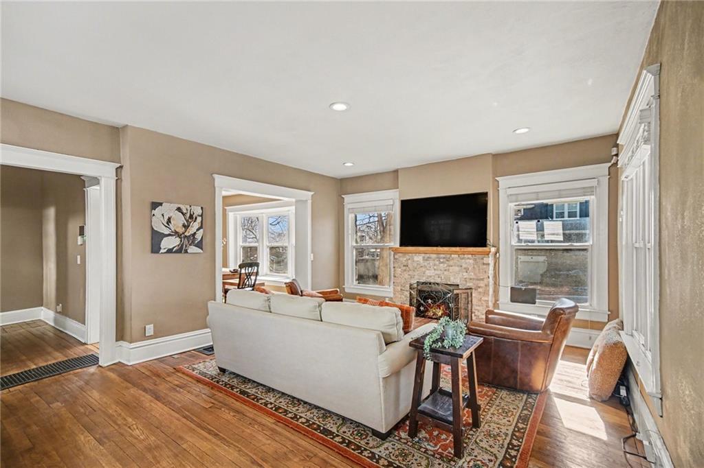 Back on the market, no fault of sellers. You now have a chance to buy this beautiful three story historic home in the heart of KC! Contingency offer fell through, but inspections and appraisal already done for you. This home is full of that old charm and character but has the convenience of updated kitchen, 3 full bathrooms and NEW double covered decks. This huge corner lot with rod iron fence has a separate front driveway and a rear 2 car garage, which is rare! Walk into an open main floor with a fireplace living room, bay windows with seat for the dining and kitchen that walks out to the deck. 2nd level has 3 large bedrooms with huge closets, (back bedroom has deck walkout with french doors) a full bath and large laundry room. Top floor is your primary suite with a massive bedroom, bathroom and even a dry sauna room! The basement is unfinished but 828 sq ft of clean usable space for storage, hobbies or a gym. You are near all things fun in KC!!! Things I personally love about this house.... huge windows everywhere-so much natural light! Dramatic staircase, trim, and crown molding. Every level has gorgeous hardwood floors that have a 100 yr old story to tell. Large yard perfect for all the gardening and flower beds your heart could desire. And oh the parties and entertaining that can happen on the 675 sq ft of decks with twinkling lights left for you to enjoy. Roof, Hot water, HVAC 7 yrs old, Newer windows and interior/ exterior paint touched up for move in ready convenience! Everyday as you come and go, just a block away you will feel transported back in time to the roaring 20's with impressive mansions and The Colonnade along Gladstone Blvd where all the whos who lived. You will love this home, hurry before its gone!
