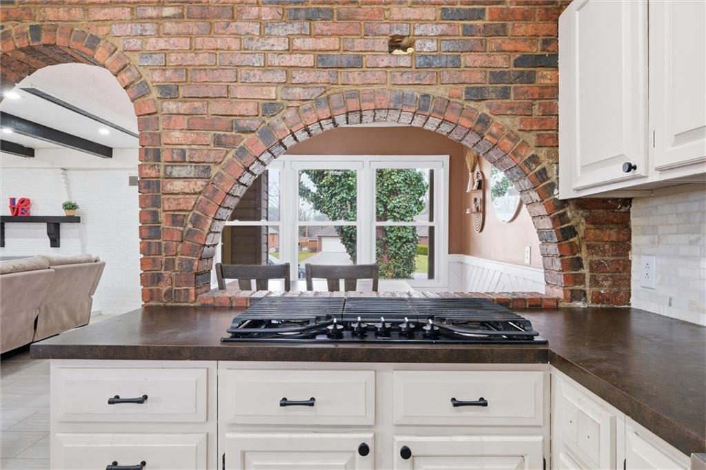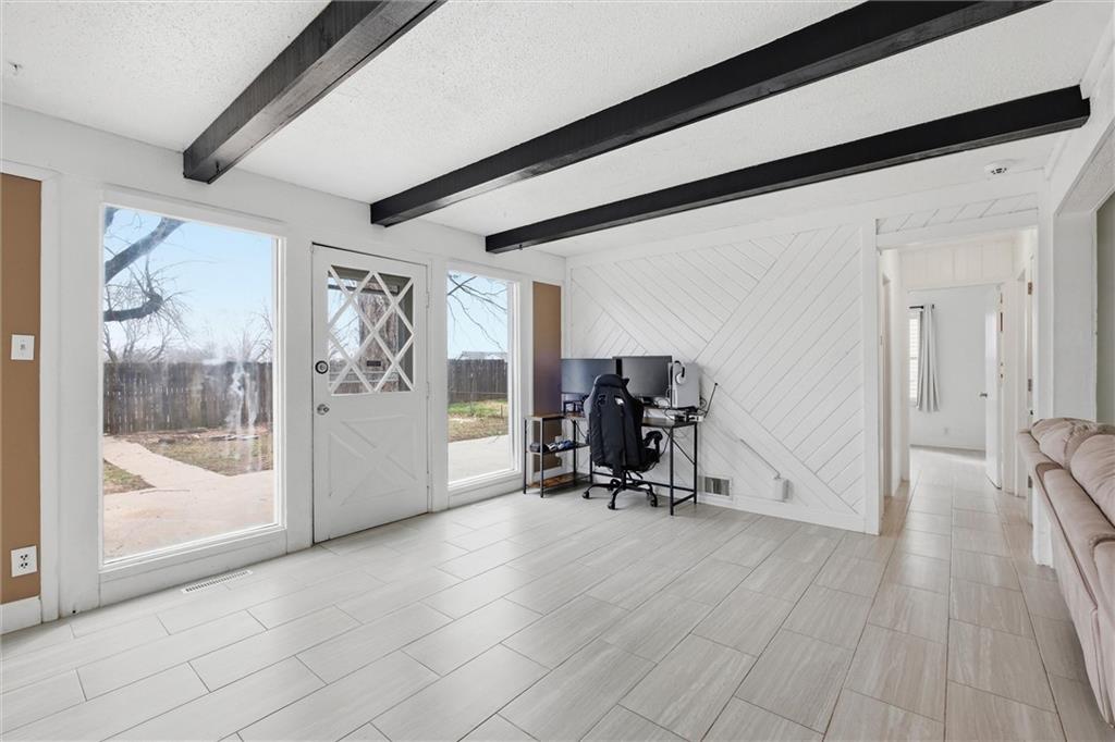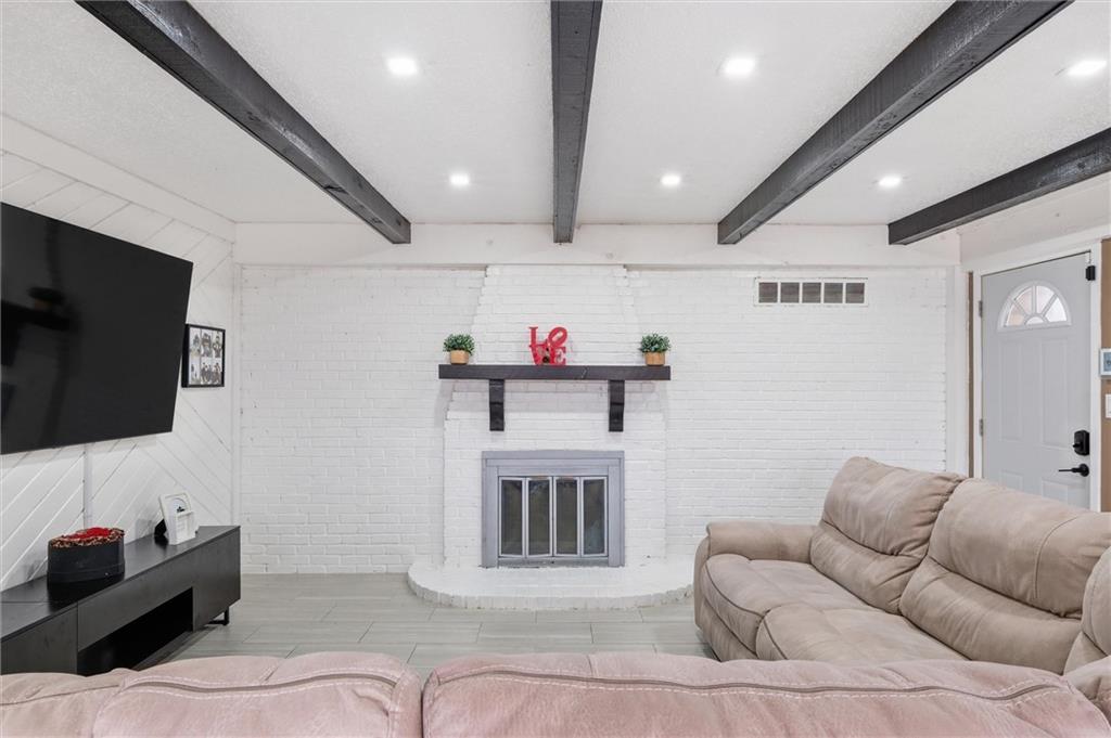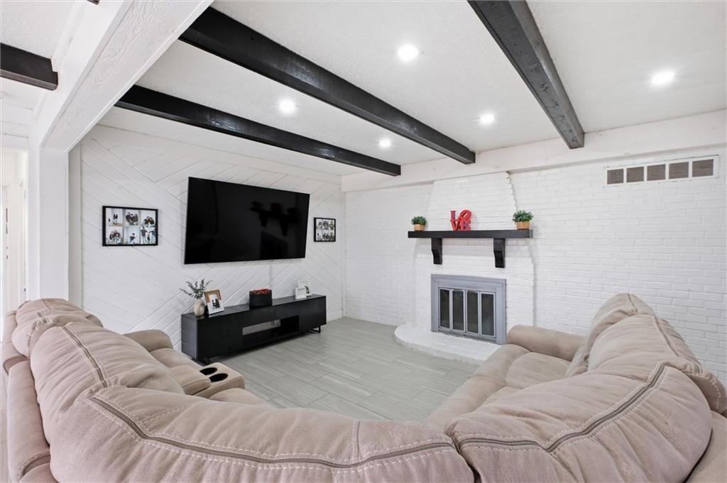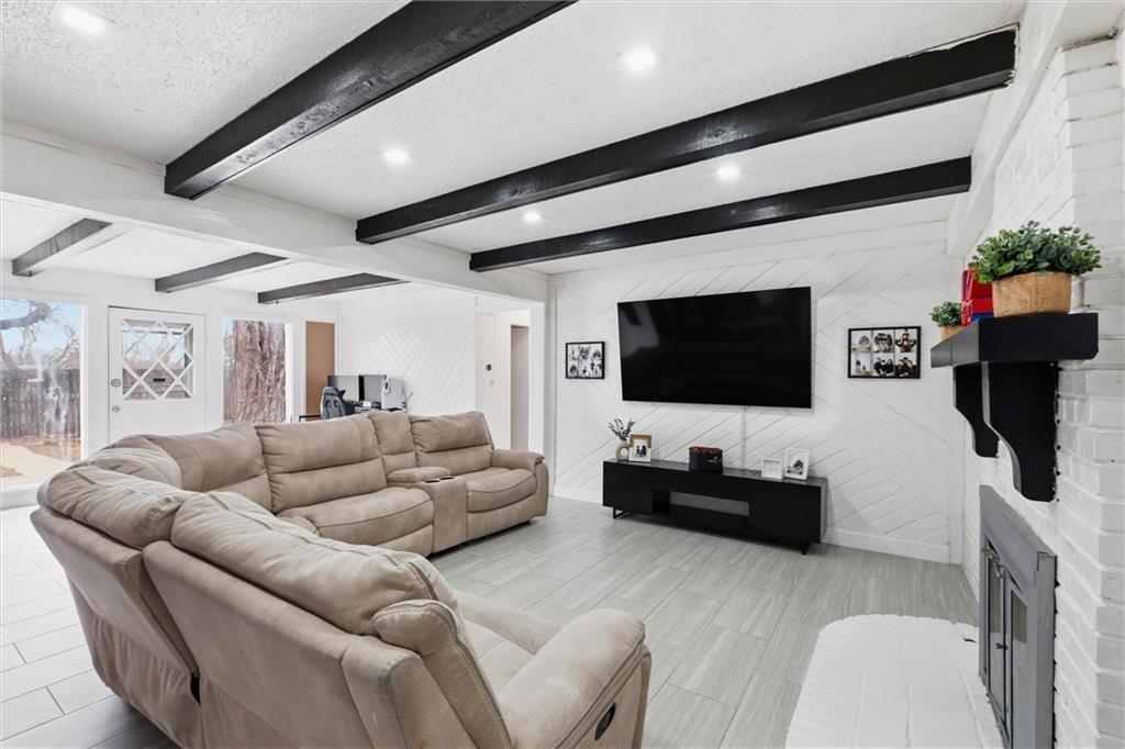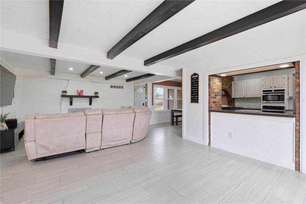There are homes that reveal themselves slowly, and 6621 Woodson Road is one of them. From the street, it reads as a well-kept mid-century ranch on an established Raytown block, sitting on a quarter-acre lot with a circular drive and a brick chimney rising above the roofline. The exterior does not oversell what is inside. The main living area opens to a space that has been quietly and deliberately transformed. Dark stained beams cross the ceiling above chevron-patterned shiplap walls, and a painted brick fireplace with a heavy black mantel grounds the room. The tile flooring runs clean and continuous through the main level, connecting each space without interruption. The kitchen is the room people remember. A gas cooktop peninsula sits beneath a full-height arch of exposed original brick, open on both sides with a second arch framing the dining space beyond. It is an architectural detail that belongs in a different conversation than the price of this home. The appliance suite includes a wall oven, built-in microwave, dishwasher, and stainless side-by-side refrigerator. The primary bath received the same level of attention. Floor-to-ceiling marble-style tile, a frameless glass enclosure, a ceiling-mounted rain head, a recessed mosaic niche, and a backlit vanity mirror. It is finished with a specificity that does not happen by accident. Two bedrooms sit on the main level. A full bath serves the lower level, which offers nearly 900 square feet anchored by a second brick fireplace, a dedicated laundry room, and a non-conforming bedroom. The garage features tall overhead clearance for recreational equipment and a large lofted storage area above. The backyard is open, treed, and ready to be used. A concrete patio runs along the rear with direct access from the living area.