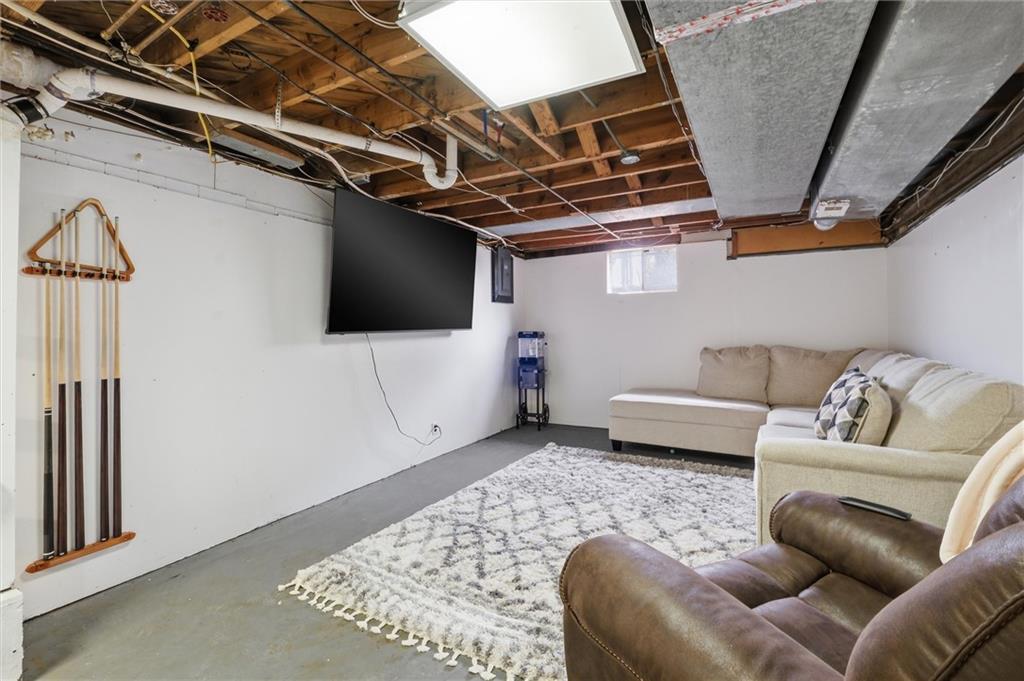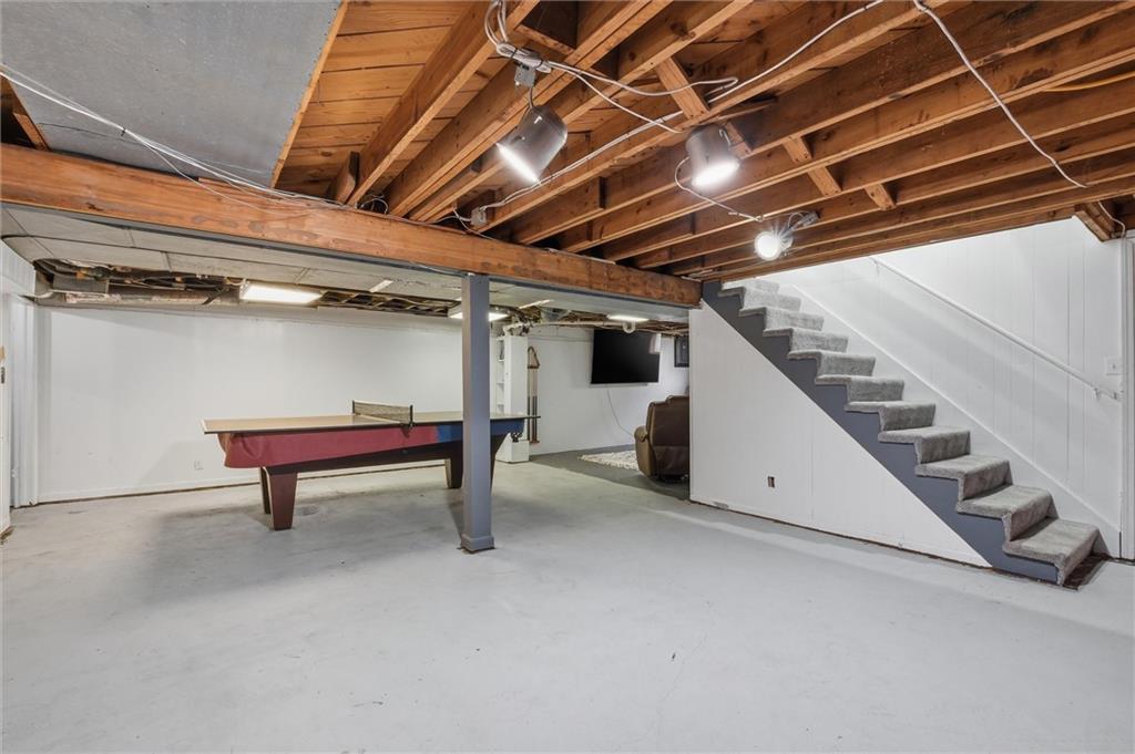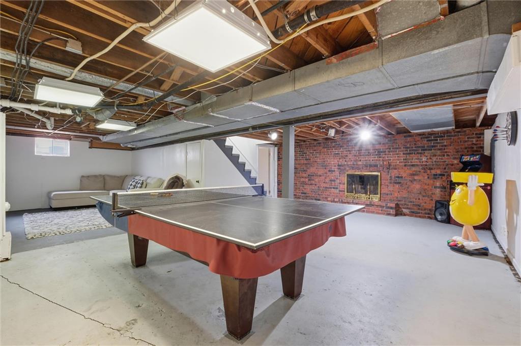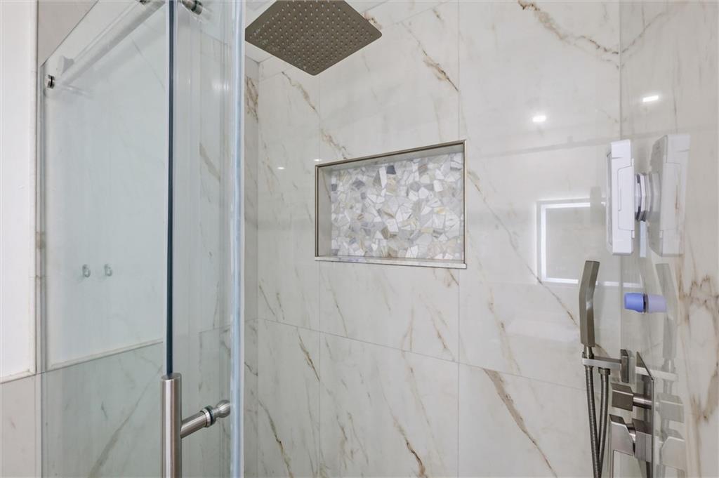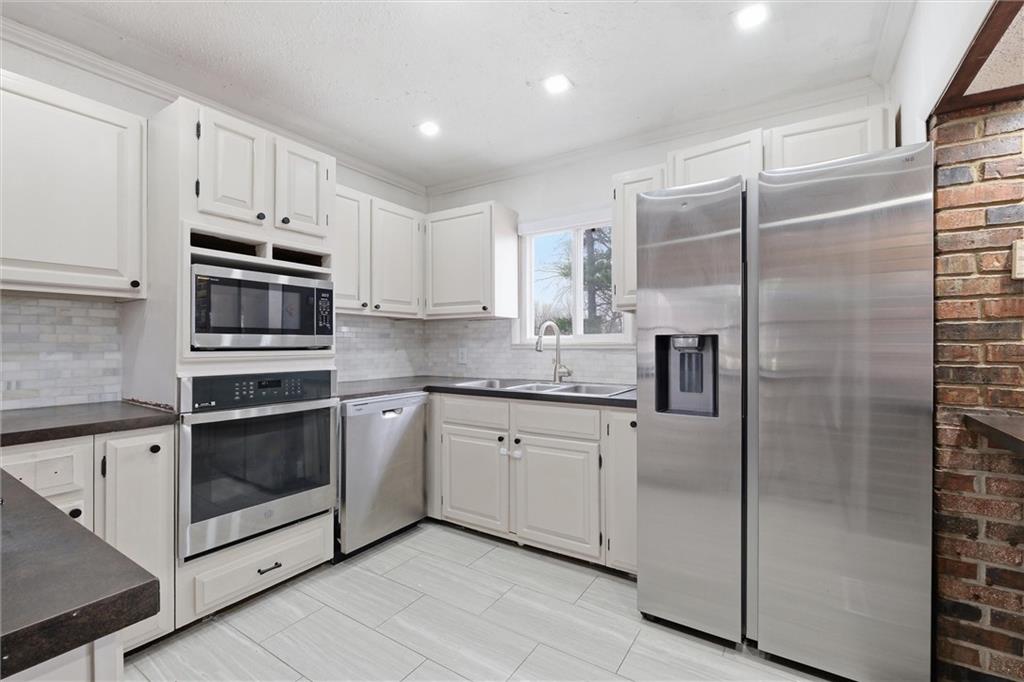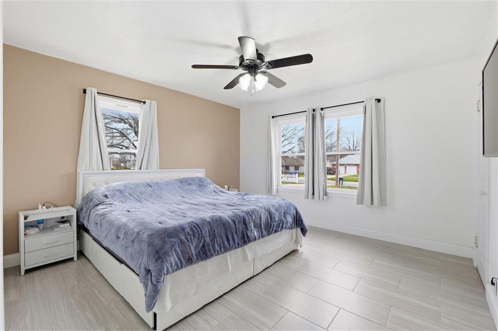 There are homes that reveal themselves slowly, and 6621 Woodson Road is one of them. From the street, it reads as a well-kept mid-century ranch on an established Raytown block, sitting on a quarter-acre lot with a circular drive and a brick chimney rising above the roofline. The exterior does not oversell what is inside. The main living area opens to a space that has been quietly and deliberately transformed. Dark stained beams cross the ceiling above chevron-patterned shiplap walls, and a painted brick fireplace with a heavy black mantel grounds the room. The tile flooring runs clean and continuous through the main level, connecting each space without interruption. The kitchen is the room people remember. A gas cooktop peninsula sits beneath a full-height arch of exposed original brick, open on both sides with a second arch framing the dining space beyond. It is an architectural detail that belongs in a different conversation than the price of this home. The appliance suite includes a wall oven, built-in microwave, dishwasher, and stainless side-by-side refrigerator. The primary bath received the same level of attention. Floor-to-ceiling marble-style tile, a frameless glass enclosure, a ceiling-mounted rain head, a recessed mosaic niche, and a backlit vanity mirror. It is finished with a specificity that does not happen by accident. Two bedrooms sit on the main level. A full bath serves the lower level, which offers nearly 900 square feet anchored by a second brick fireplace, a dedicated laundry room, and a non-conforming bedroom. The garage features tall overhead clearance for recreational equipment and a large lofted storage area above. The backyard is open, treed, and ready to be used. A concrete patio runs along the rear with direct access from the living area.