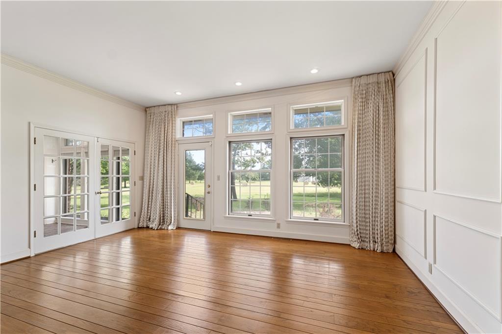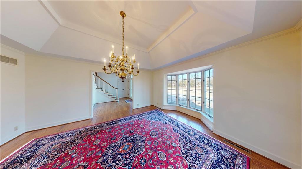 Take advantage of the rare opportunity to own a stately, full brick home perfectly positioned on 2.3 sprawling acres (m/l) just outside the city limits of Nevada, MO. The grand arched glass entryway opens into a light-filled foyer, offering a stunning view of the winding staircase that sets the tone for the home's architectural character. The main level has been elevated with brand-new wide-plank wood flooring, custom-milled in South Carolina, flowing from the entry and encompassing the formal dining room, kitchen, breakfast nook, walk-in pantry, and hallway. Host gatherings in the formal dining room under a tray ceiling and elegant chandelier, with a bay window framing the lush front lawn. The living room is a breathtaking sanctuary of comfort and style. Soaring high ceilings are accented by crown molding and wainscoting, creating an atmosphere of timeless sophistication. At the heart of the room sits a cozy fireplace, while a wall of windows bathes the space in natural light and offers serene views of the sunroom and the classic brick patio beyond. The library is a true retreat featuring a coffered ceiling, custom built-in shelving, a second fireplace, and a wet bar with glass shelving—the ultimate setting for a home office or quiet evening. Enjoy slow mornings under the beamed ceilings in the breakfast area, or step into the sunroom with classic brick flooring, accessible from both the living and breakfast areas. The primary suite, located on the main-level offers walk-in closets and a spacious en-suite bath with with double vanities, a garden tub, and separate shower. Designed for convenience, the main-level also includes two half-baths, a laundry room, and a walk-in pantry providing ample storage and effortless functionality. The upper level provides two additional bedrooms and bathrooms. While the full, unfinished basement includes a third fireplace, providing a versatile space where the possibilities are endless.