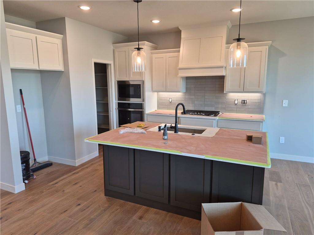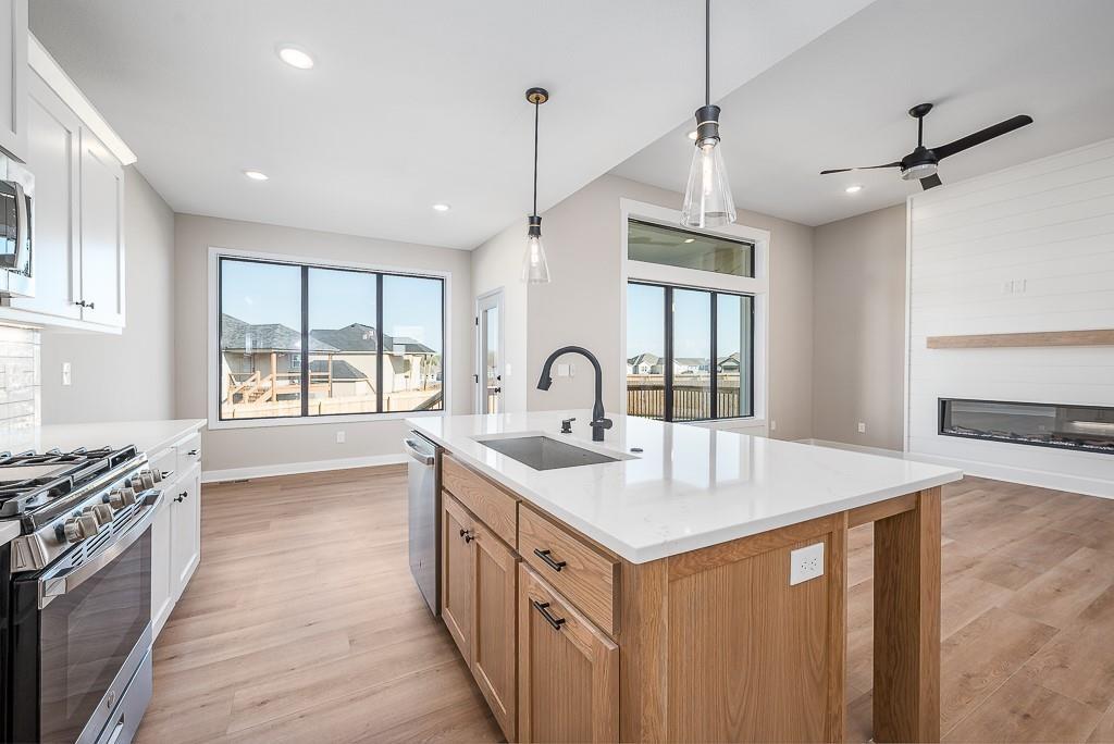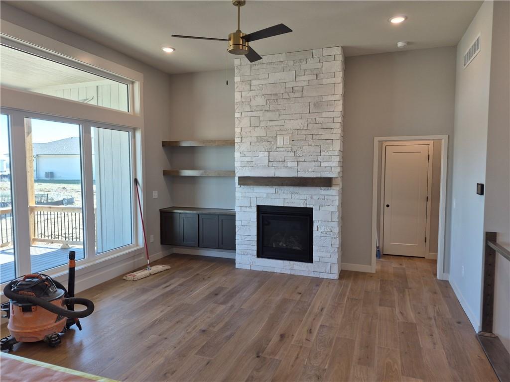 Lot 40. Colorado by Pfannes Homes. This home is estimated to be complete by April! FINISHED PHOTOS OF A PRIOR MODEL. This great home in a GOLF COURSE community with lawn maintenance/snow removal provided has all the upgrades! 3 car garage with the main 2 car section that is 25' deep and the 3rd car is 24' deep! This large garage also includes a mini-split to keep it comfortable. The open main living area includes a fireplace with cabinets, additional kitchen cabinets at the island, and a nice dining area. Oversized pantry! Plenty of light with windows all across the back. Large corner lot! Primary suite includes 17 x 14 bedroom, luxury bath and nice closet. The second bedroom is good sized with full bath and linen closet. The Lower level includes family room with wet bar, full bath. two bedrooms and plenty of storage. Quartz in kitchen and bathrooms, tile floors in laundry and baths and wood floors in entry, living, dining and kitchen. Zoned HVAC to keep the lower level comfortable and a low maintenance composite deck. Don't miss this opportunity to live in the Communities of Falcon Lakes, just off K7 with an easy 30 minute commute to the airport, 10 minutes to the Legends Entertainment and Shopping District and 30 minutes to Lawrence. Acclaimed Basehor-Linwood schools! Provided lawn maintenance includes mowing/trimming/blowing, weed/feed, landscape/tree trimming, sprinkler turn on/turn off. Snow removal over 2".