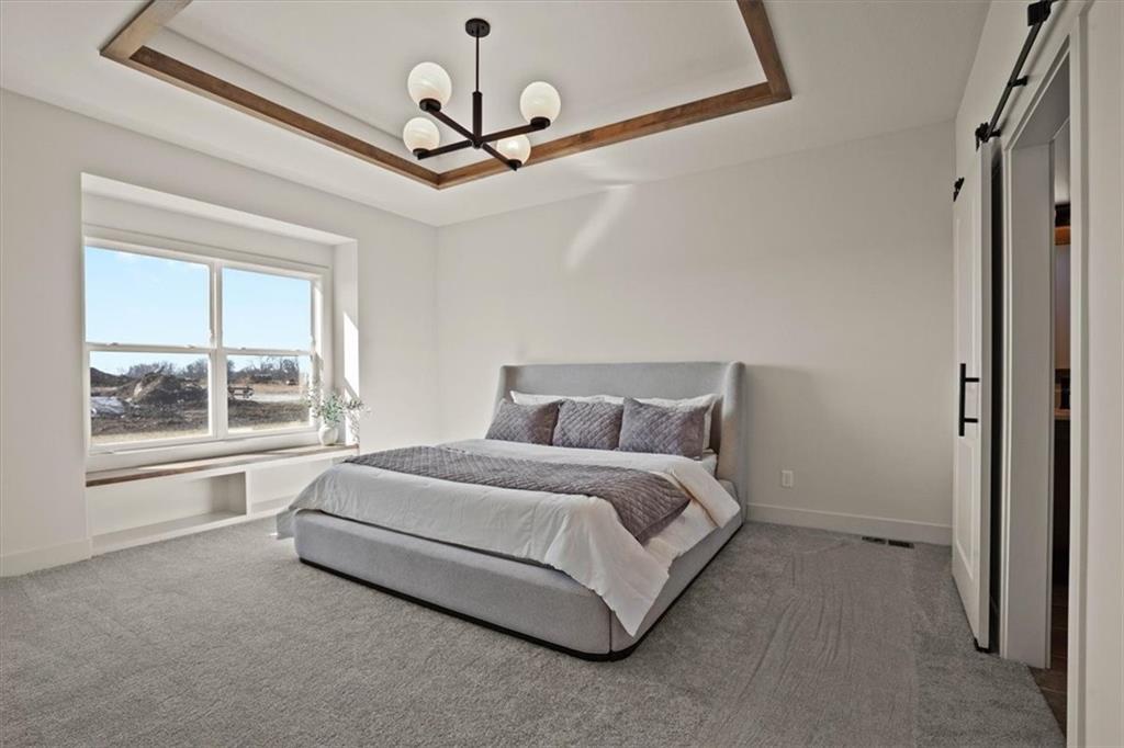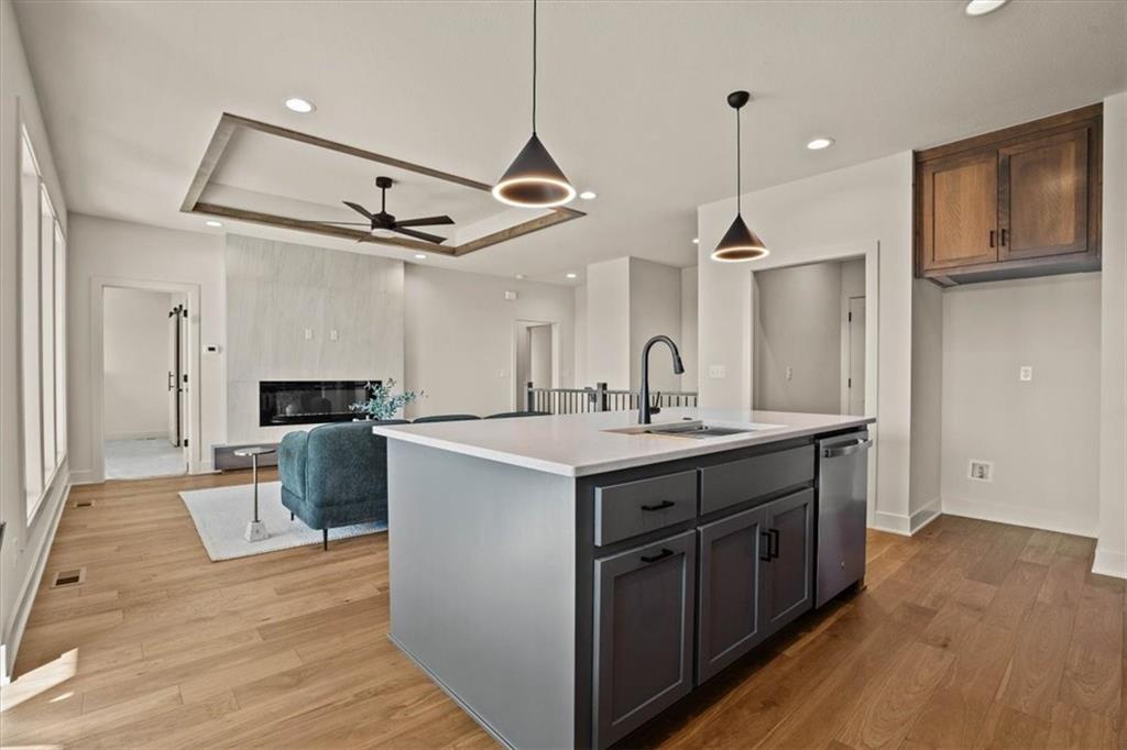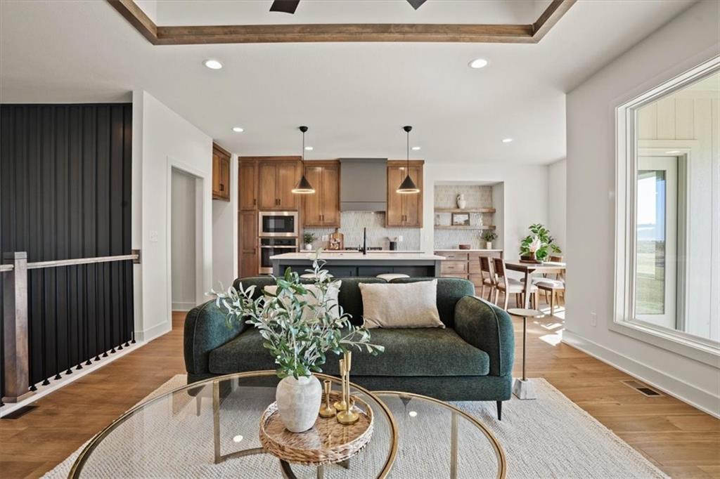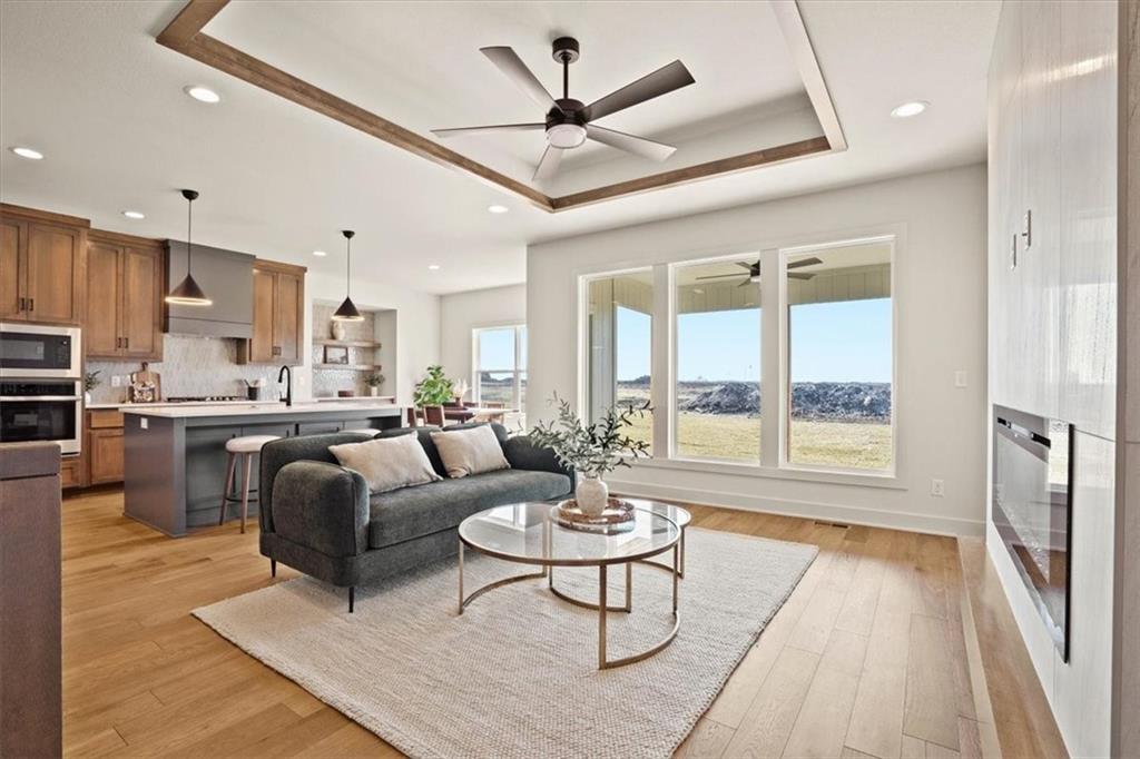 Experience the perfect blend of modern sophistication and functional design with the Greystone model by Elevate Design + Build, nestled in the exclusive Prairie View of the Good Ranch. This stunning 4-bedroom, 3-bathroom reverse 1.5-story home is situated on a corner lot, offering the rare combination of a quaint, tranquil atmosphere and close proximity to Raymore’s premium shopping, dining, and highway access. The heart of the home features a sun-drenched, open-concept living area anchored by a striking floor-to-ceiling fireplace and a gourmet-inspired kitchen. Culinary enthusiasts will love the sleek finishes, expansive walk-in pantry, and seamless flow to the covered rear deck—perfect for sunset views over the rolling meadows. The main level thoughtfully hosts both the luxurious primary suite and a secondary bedroom, while the finished lower level provides a generous recreation room, two additional bedrooms, and ample storage. Residents of Prairie View enjoy the rich heritage of the Good Ranch, complete with scenic woodlands, and the peace of mind that comes with living in the highly-rated Raymore-Peculiar School District.