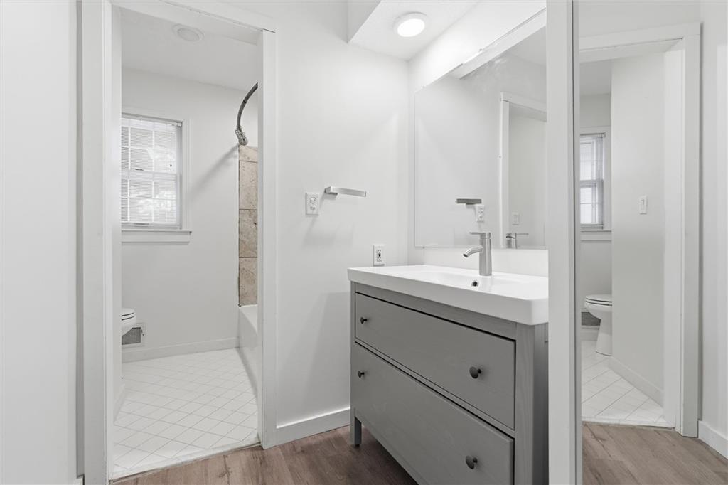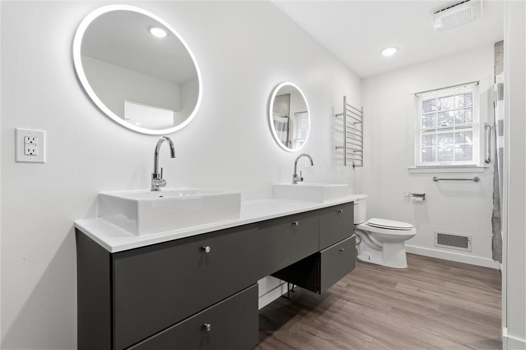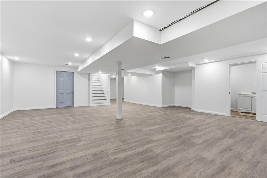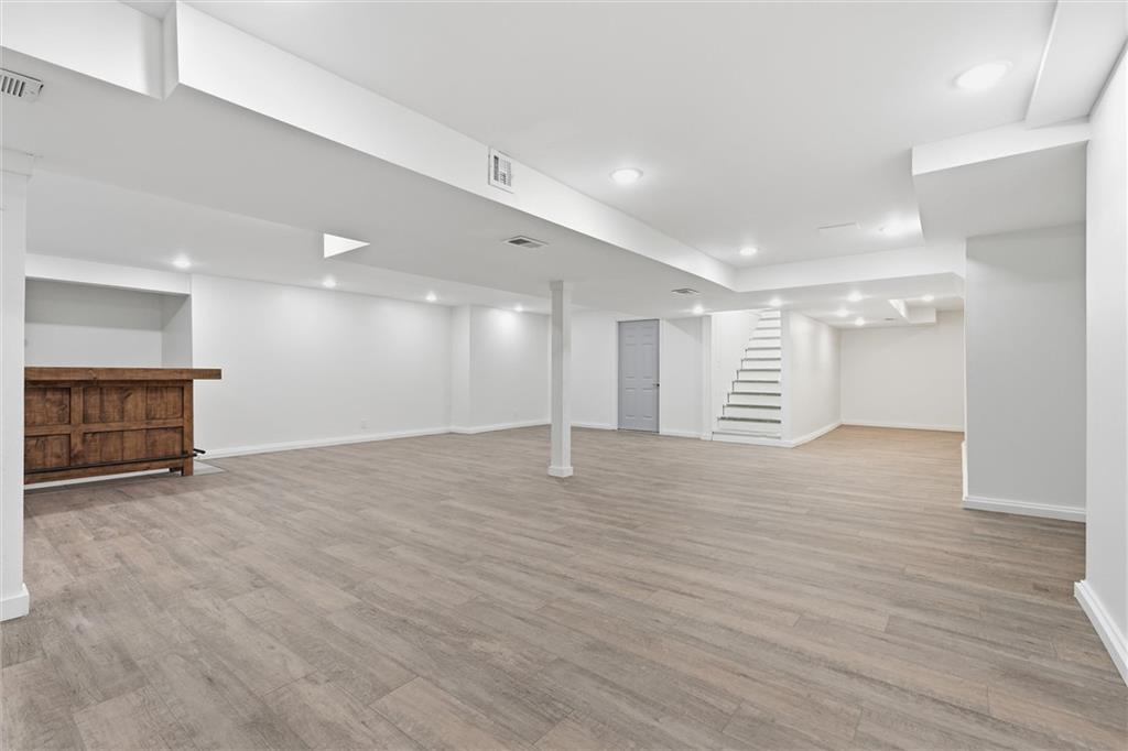 Discover this stunning custom home in the highly sought-after Village of Oakwood, where modern elegance blends seamlessly with timeless charm. This residence has been transformed into a sophisticated, move-in-ready retreat. Tucked at the end of a quiet no-thru street, the home offers exceptional privacy and tranquility. A bold exterior and impressive entry door entry make a striking first impression. Inside, engineered hardwood flooring, fresh white paint, recessed lighting, and updated fixtures create a bright, contemporary atmosphere throughout. The contemporary kitchen is both stylish and functional, featuring ample workspace and storage—plus all appliances stay. A conveniently located walk-in pantry and main-level half bath add everyday practicality. Enjoy the comfort of a main-floor primary suite, complete with a custom vanity, stunning spa-like tiled shower and expansive closet system. A second bedroom on the main level includes its own walk-in closet, and the laundry room offers additional storage with a custom wall cabinet. The updated hallway bathroom maintains the home’s clean, modern aesthetic. Large living room space with views of the backyard plus formal dining space and secondary living room/office space complete the main floor. Upstairs, two additional spacious bedrooms each feature mini-split units for personalized climate control, ensuring year-round comfort. Finished basement adds a great communal space for media area, brand new modern kitchen with center island, separate bar space plus two more bedrooms and full bathroom! Step outside to a beautifully fenced backyard featuring a charming upper stone patio, perfect for entertaining, along with a covered lower patio that offers shade and relaxation on warm summer days. Located within walking distance to Oakwood Manor Elementary and just minutes from local amenities and highway access, this thoughtfully renovated home delivers style, comfort, and convenience in one exceptional package.