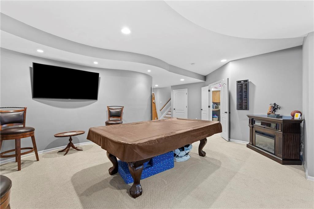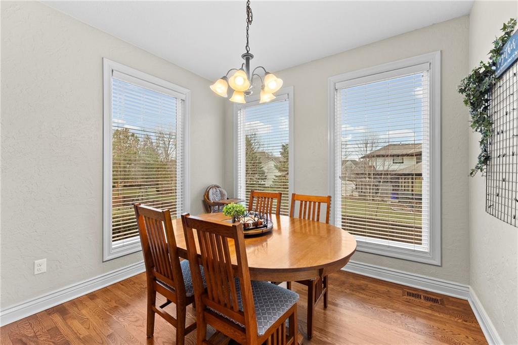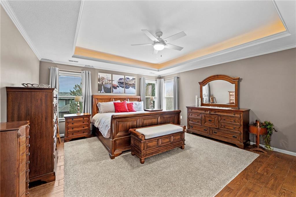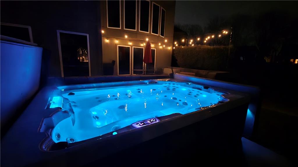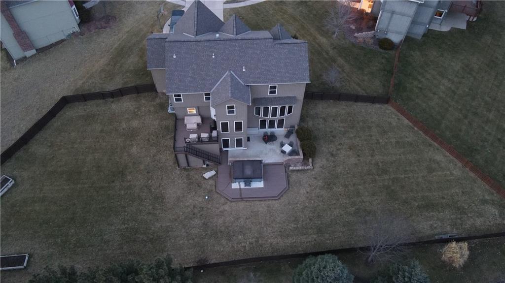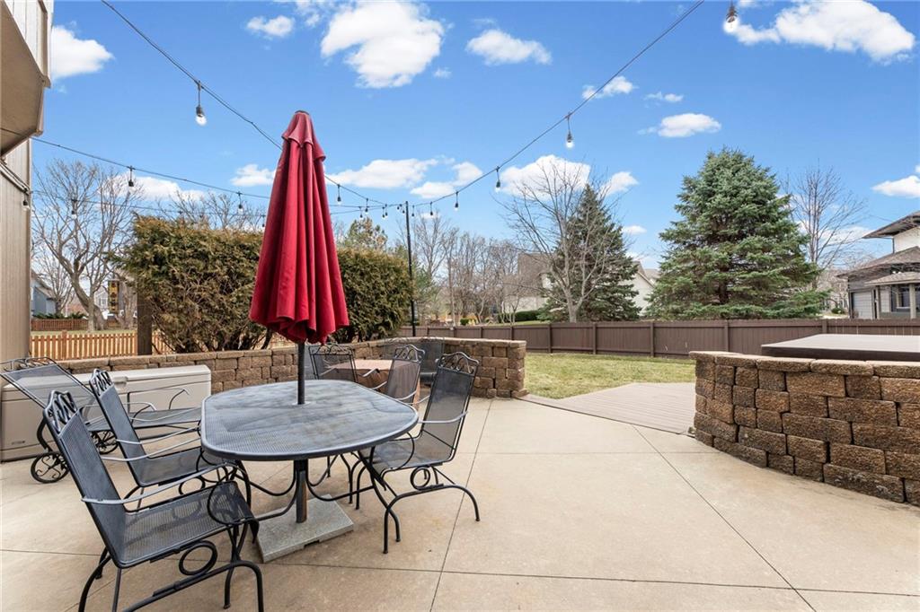 Situated on an almost half-acre fenced cul-de-sac lot, this beautifully maintained home offers space, style, and thoughtful updates throughout. Recent improvements include newer interior and exterior paint, updated hardwood floors, newer carpet, and designer stair carpet that adds a custom touch. The kitchen is both functional and inviting with granite countertops and abundant cabinetry. The main floor office offers built-ins for an ideal work-from-home setup. Upstairs, the spacious primary suite features a tray ceiling with lighting and fan, along with a luxurious bath that includes a double vanity, jetted tub, and an oversized walk-in closet. Secondary bedrooms are generously sized with walk-in closets and includes a Hollywood bath with granite countertops. One bedroom has a private bath and includes a built-in trundle bed and shelving, making it perfect for guests or a versatile flex space. The finished walk-out lower level expands the living space with a large family room, additional bedroom, full bath with jetted tub and shower, plus a workout room or private office. Outdoor living shines with an expanded composite deck featuring iron spindles, plus a stunning oversized hot tub with multicolored lighting that opens directly onto the patio — perfect for relaxing or entertaining. A storage area beneath the deck offers plenty of space for lawn equipment. Additional highlights include: Two newer HVAC systems, dual water heaters, a newer roof, and a 3-car garage with insulated doors and extensive shelving. The neighborhood offers outstanding amenities including a pool, playground, and walking/biking trails, and is located within the award winning Blue Valley School district with convenient highway access.