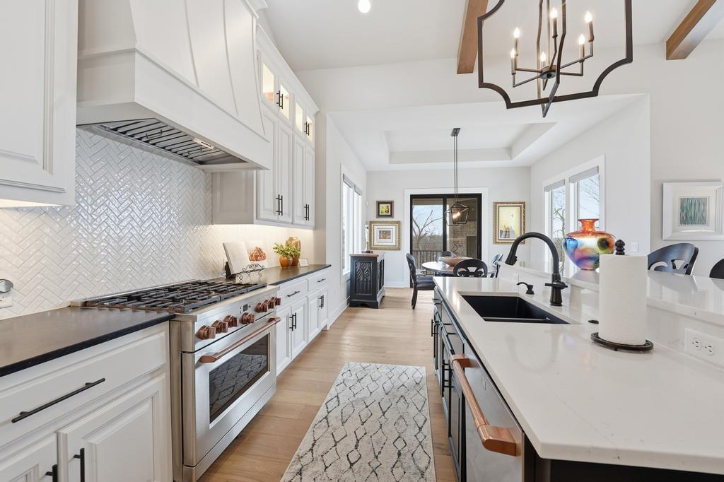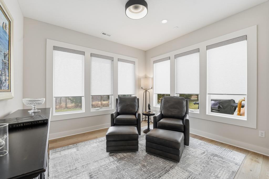 Almost new and lightly lived in, this custom-built home offers elevated design, thoughtful upgrades, and effortless living in the resort-style community of Cedar Creek. Perfectly positioned backing to Hole #5 tee box of the award-winning private Shadow Glen Golf Course, the setting offers both beauty and privacy. Inside, the light-filled, open floor plan showcases modern wide-plank luxury wood flooring, LED lighting throughout, & motorized shades. As you enter the home, your eyes are immediately drawn to the large wall of windows overlooking the golf course in the great room with vaulted ceiling, stunning fireplace and built-ins. The gourmet kitchen features a large quartz island, walk-in pantry, and GE Café appliances with striking copper hardware including a gas range, refrigerator, microwave, beverage fridge, and dishwasher. The laundry room offers a convenient sink and built-ins. Designed for comfort, you can relax on the screened-in porch with fireplace and TV. The spacious primary suite has wood floors and lighted tray ceiling. The spa-inspired bath has a large tiled shower, soaking tub, under-cabinet lighting, and a large walk-in closet with built-ins & dedicated makeup/vanity area. A second main level bedroom also features luxury wood flooring. The stunning lower level, complete with modern fireplace and a full wet bar featuring honed quartz counters, wine fridge, microwave, dishwasher, sink, and ice maker is perfect for gatherings with friends and family. Two additional bedrooms in the lower level with a shared bath are perfect for guests. A huge finished storage closet with custom built-ins provides exceptional organization. Additional upgrades include a recirculating water system, two 50-gallon water heaters, electric vehicle charger hookup, epoxy garage floor, sealed driveway, buried drains, and striking stucco and stone exterior. Maintenance-provided services include lawn care and snow removal. This is refined, low-maintenance luxury living at its best.