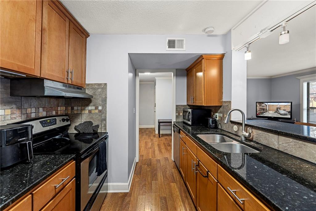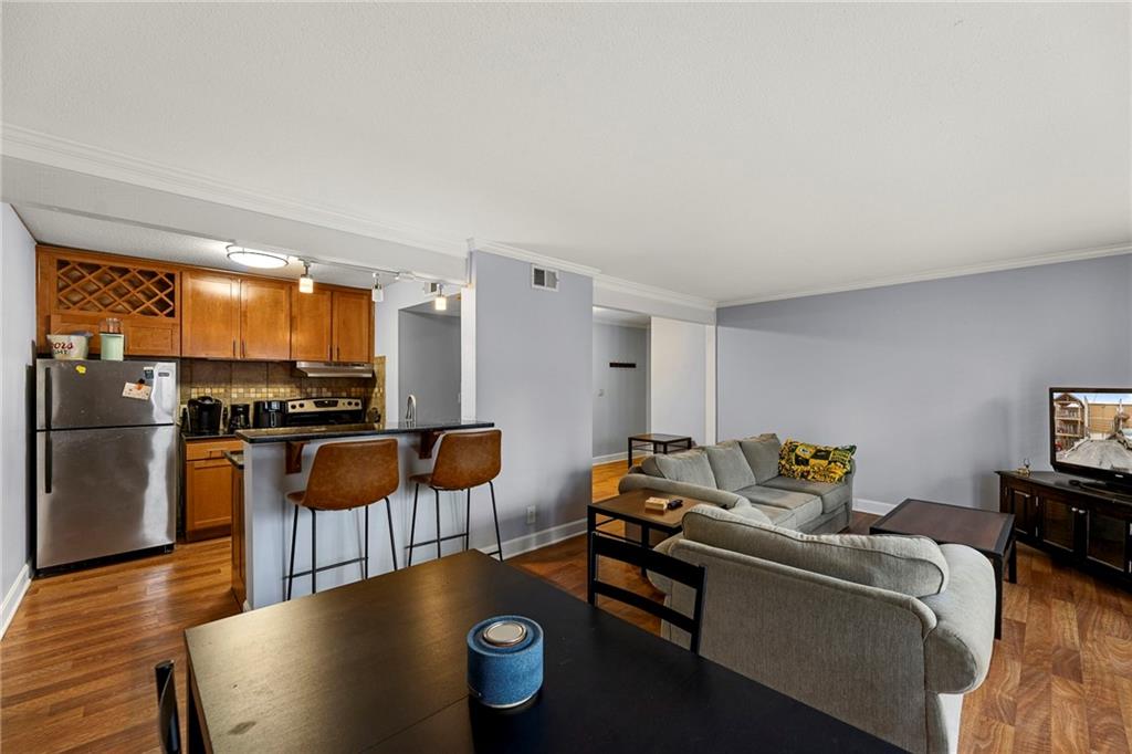 Welcome to Plaza Hills—where location and lifestyle meet in the heart of Kansas City. This light-filled condo offers two spacious bedrooms, two full bathrooms, and one of the largest floor plans in the community. Located in a secure, gated complex just one block from the Country Club Plaza, this upper-level unit features an open-concept layout ideal for everyday living and entertaining. The updated kitchen showcases ceiling-height cabinetry for exceptional storage including a wine rack, granite countertops, stainless steel appliances, and a classic subway tile backsplash. Luxury vinyl plank and hardwood flooring, fresh interior paint, and updated fixtures create a bright, modern feel throughout. All appliances, including the in-unit washer and dryer, stay with the home. French doors open to a private covered deck overlooking the pool—perfect for morning coffee or relaxing evenings. A reserved parking space directly behind the building adds everyday convenience (LL). Residents enjoy premium amenities including a fitness center, secured package delivery, and a beautiful community pool. Ideally positioned between the Country Club Plaza and Westport, and minutes from the Nelson-Atkins Museum of Art, this condo offers unbeatable access to Kansas City’s best dining, shopping, and entertainment.