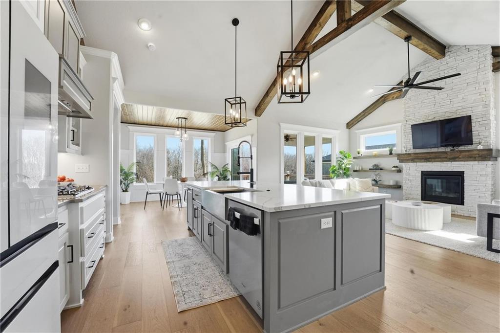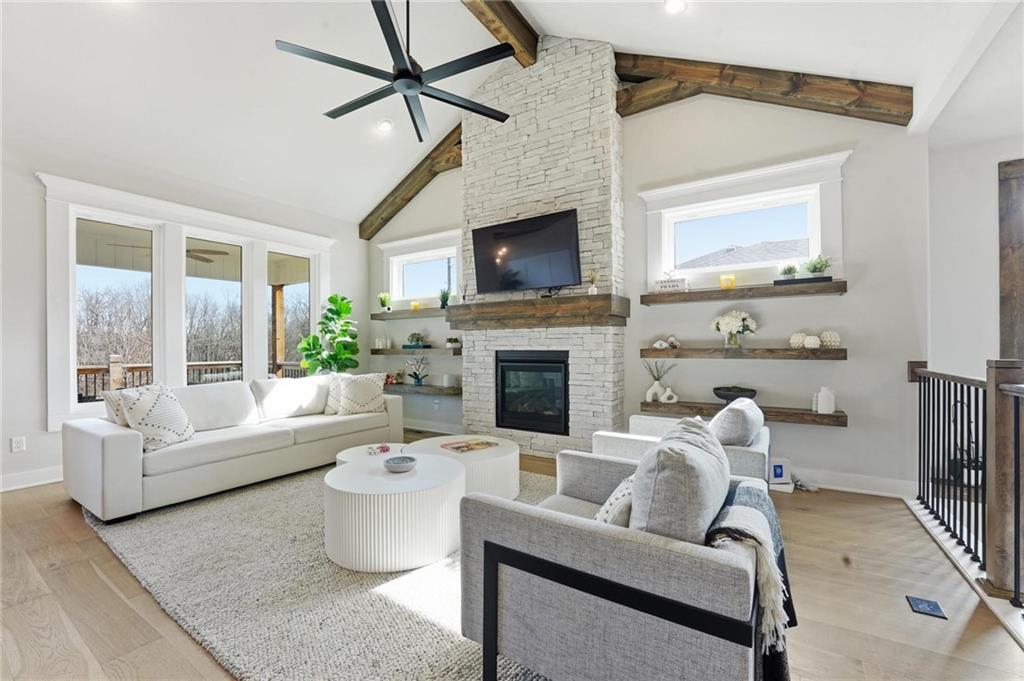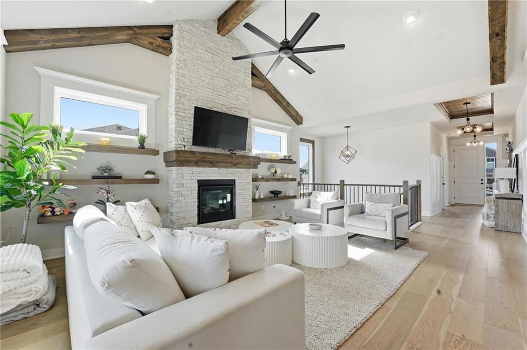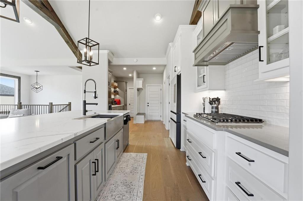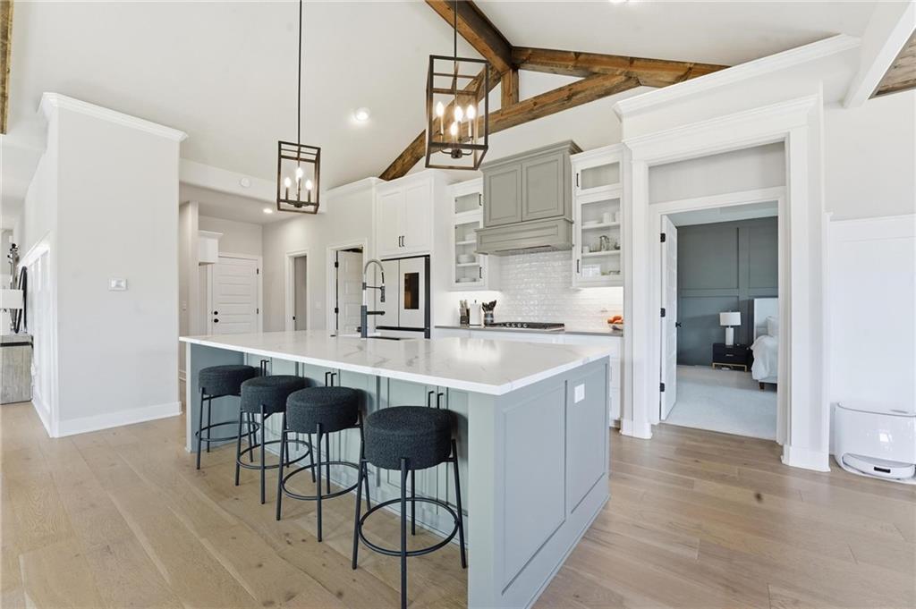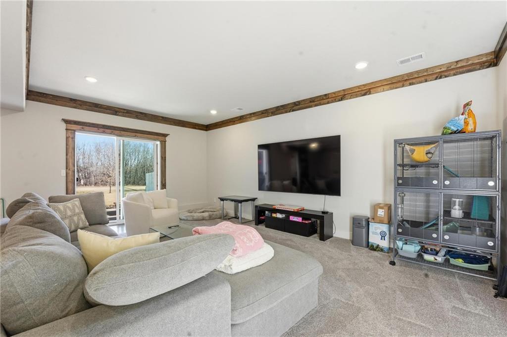 Better than new in this barely lived in TruMark Custom Home... This is the Kyle IV with loads of beautiful finishes! No need to wait for new and blinds are installed and home is furnished and ready to move into! New Kyle IV is listed for $795k! The layout is perfect! Floorplan is open! Finishes are beautiful! Meticulously maintained, front pocket office with built-in shelving. Front, spacious bedroom flooded with daylight. Greeted with a welcome entryway. Unique features, including beams, wood ceiling finishes. custom blinds, hardwood floors, nice lighting and hardware and more! The TVs stay for convenience. Kitchen and dining areas are perfect in size, come with loads of quartz counter space, huge island, a butler's pantry, boot bench and access to laundry room. Primary Suite with gorgeous ensuite that you must see! Bathrooms come with quartz countertops and stylish finishings. Covered deck with stairs down to yard and lower level walkout. The lower level has 3 more conforming bedrooms, recreation room, full bathroom. Security system and sprinkler system are already installed. Why wait for new when this flawless home is waiting just for you!