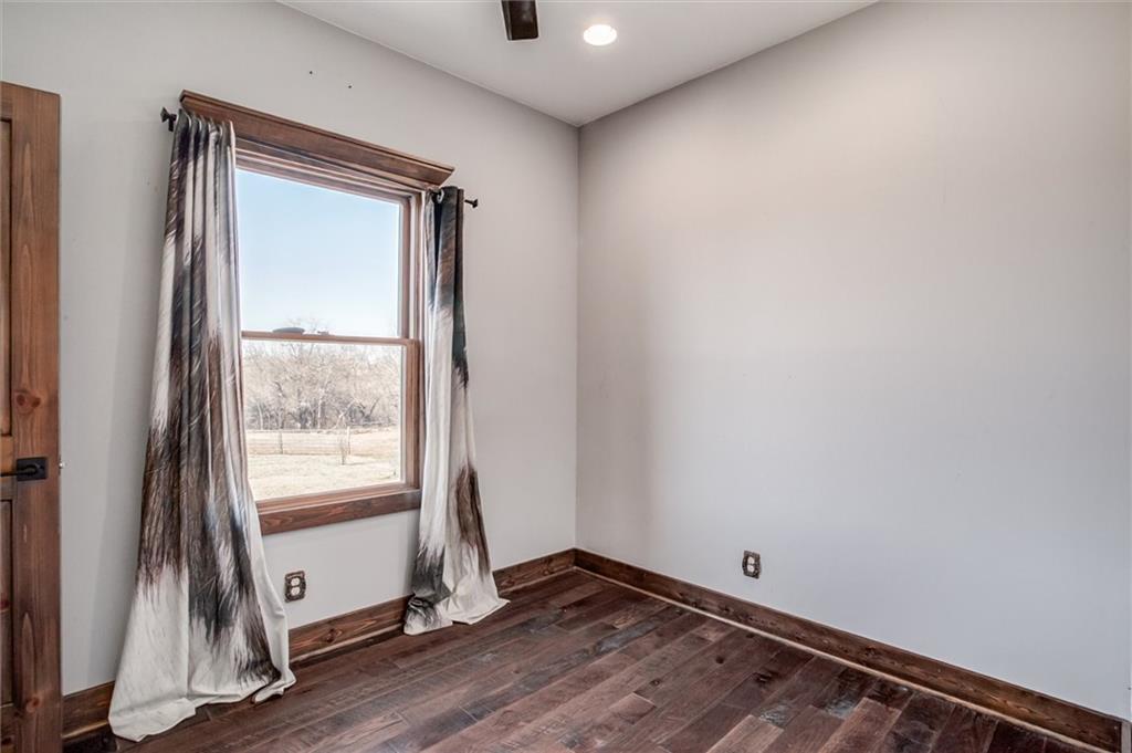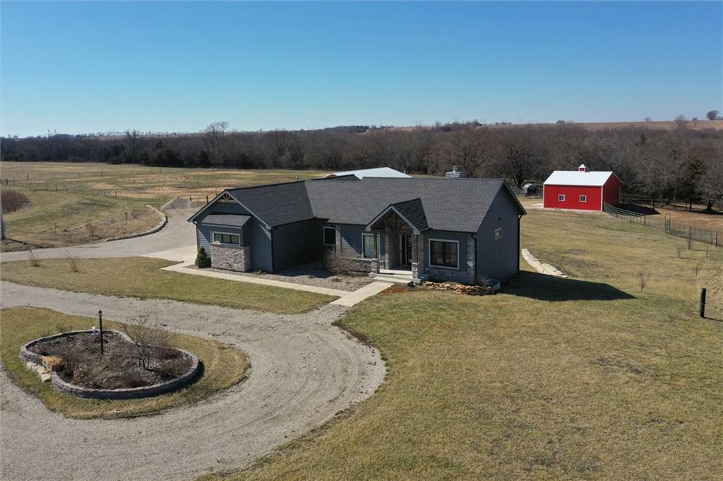 Gorgeous dream home located on 20 +/- picturesque acres. Expect to be impressed upon entering this 4 bedroom, 4 bath ranch. Open floor plan, reclaimed hardwood floors throughout main living area, vaulted ceilings, an abundance of natural light, solid wood doors and upgraded lighting. Great room featuring floor to ceiling stone fireplace, open to stunning kitchen boasting GE Cafe appliances, custom cabinetry with marble pulls and knobs, granite countertops, pot filler, gas stove and walk-in pantry. Large island and dining space to accommodate all of your family and friends making it perfect for hosting gatherings. Step outside to your private deck for enjoying the fabulous sunsets. Great master suite with vaulted ceiling, double vanity, separate shower, relaxing soaking tub and huge walk-in closet. Two additional spacious bedrooms on main level as well. Full finished walk-out lower level complete with wet bar, huge family/rec room, plenty of windows, 4th bedroom, full bathroom, safe room, plus unfinished space for storage. The property also features a 30x50 insulated shop with 200 AMP power, concrete floor, large wood burning stove, 2 separate garage doors (in/out) plus three 16x20 bays with lighting. Newly added 30x34 2 stall stable with commodity area and 30x10 lean to for additional equipment storage or animal cover. The cutest custom chicken house stays too. This remarkable property is not only beautiful, but it virtually has it all! Perfect farm space for cattle or horses, abundance of wildlife, trails through the timber down by the creek and fish in the pond. It is a sanctuary retreat by day and night all year long! Serene environment to call home! All located on hard-surface road. Easy commute to Lawrence, 15 minute commute to Baldwin City and Topeka!