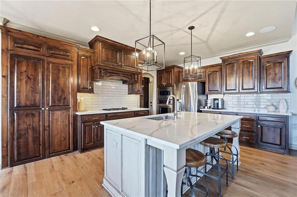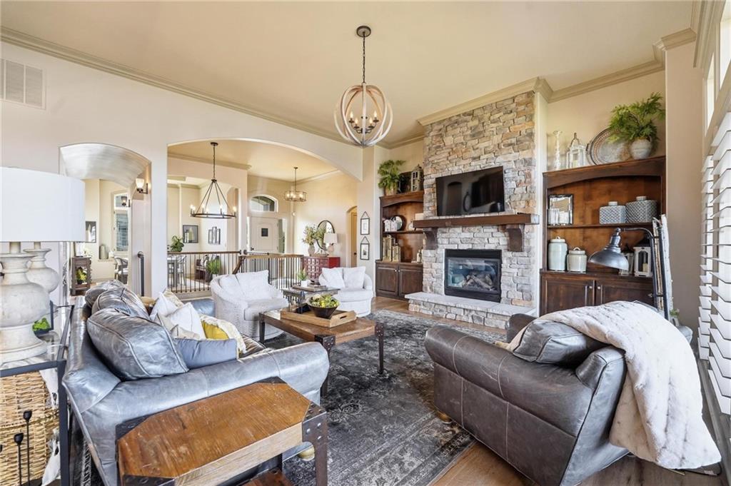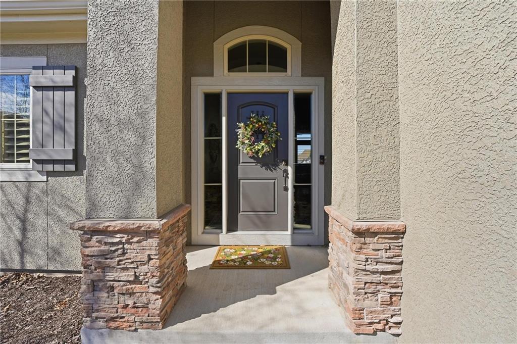 MAGNIFICENT REVERSE 1.5 ON A CUL-DE-SAC IN COLTON LAKES SOUTH IN THE AWARD-WINNING BLUE VALLEY SCHOOL DISTRICT! This stunning home perfectly blends warm, inviting contrasts with clean, modern design, all showcased in a desirable open floor plan ideal for everyday living and entertaining. Light-filled Great Room is anchored by a dramatic floor-to-ceiling stacked stone fireplace with custom built-ins—creating a striking focal point and the perfect place to gather. Chef’s kitchen is sure to impress with quartz countertops, a generous center eat-in island, walk-in pantry and stainless steel appliances, including a gas cooktop, built-in oven and microwave. An adjacent breakfast nook and formal dining room offer versatile spaces for hosting guests or enjoying cozy nights at home. Retreat to the luxurious primary suite featuring direct access to the covered deck—for your morning coffee or evening unwind. Spa-inspired en-suite boasts a double vanity, whirlpool tub, separate walk-in shower and a spacious walk-in closet with convenient in-suite laundry. Second bedroom, full bath and mudroom complete the thoughtfully designed main level. Finished walk-out lower level expands your living space with a large family room, wet bar, three additional bedrooms, two full baths and a second laundry area—ideal for guests or multi-generational living. Professionally designed landscaping creates a serene, private outdoor retreat. Enjoy time on the deck or patio, both overlooking the extra-wide, spacious lot and tree-filled greenspace. Unbeatable location just minutes from Heritage Park, the Overland Park Arboretum, Blue Hawk's shopping and dining and easy highway access. WELCOME HOME!
