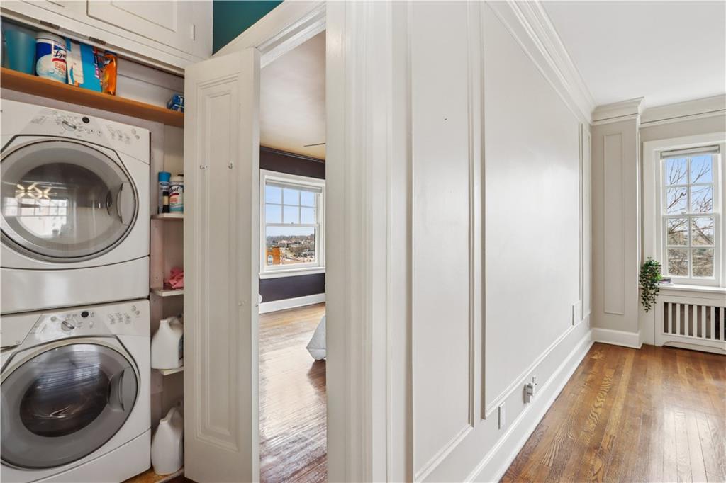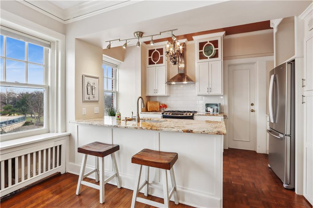 Fall in love with this beautifully updated 2-bedroom, 1-bath corner unit in the iconic Sophian Plaza. Flooded with natural light, this unit features rich hardwood floors, crown molding, and oversized windows with views in multiple directions. The updated kitchen is both stylish and functional, offering granite countertops, stainless appliances, a gas range, pantry, and spice cabinetry. Kitchen layout is open to the main living space, making it ideal for hosting or simply enjoying everyday life. The spacious primary bedroom is a wonderful retreat! Thoughtful touches like in-unit laundry and custom window treatments for convenience. Unlike many Plaza condos, the bedrooms are large enough to easily accommodate wardrobe pieces or armoires if someone wants additional closet space. Private basement storage included — perfect for seasonal items and extra belongings. Sophian residents enjoy a newly upgraded patio, private storage, secure exterior parking, and dues that include gas and water. Set in one of Kansas City’s most architecturally celebrated buildings, this location places you moments from the Country Club Plaza, Nelson-Atkins Museum of Art, parks, shopping, dining, and entertainment. If owning a piece of iconic architecture is on your bingo card for 2026, this one is worth it!