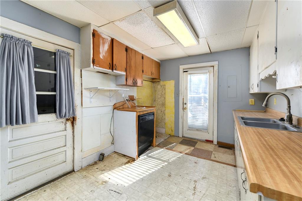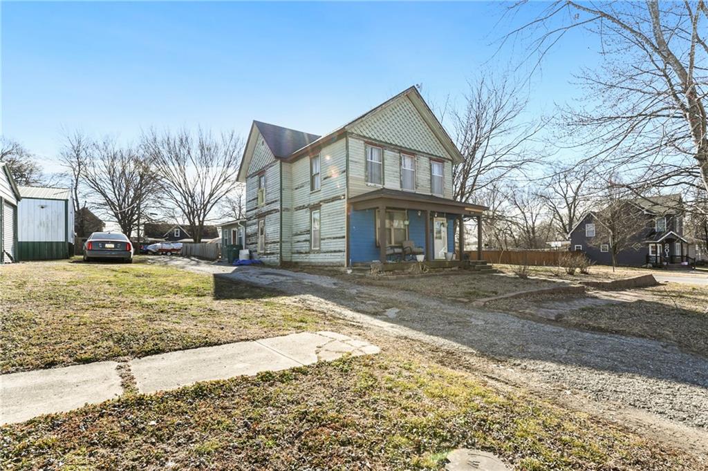 This 1.5-story home features 4 bedrooms and 2 baths and is priced to sell. Located just one block from the square, it sits in the heart of Paola. The main level includes the laundry room, the primary bedroom and full bathroom. Upstairs you'll find three secondary bedrooms and an additional full bathroom. Enjoy plenty of off-street parking thanks to the pass-through driveway. The stove hookup is electric. The extra-large fenced backyard includes a shed and a clubhouse. Attractive brick hardscaping accents the patio and front sidewalks. The roof is approximately 10 years old, the HVAC system is about 12 years old, and the water heater is roughly 4 years old. This home has good bones and is ready for some updates and repairs.