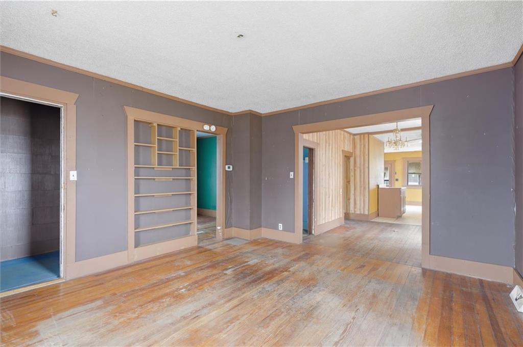 Unfurnished living room featuring ornamental molding, light wood-style floors, a textured ceiling, and hanging lights