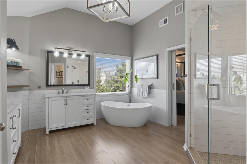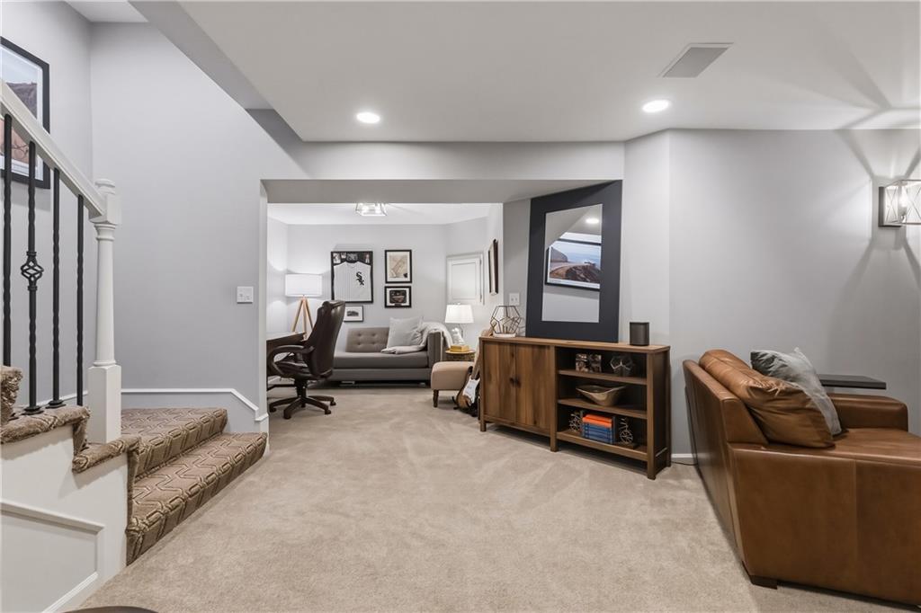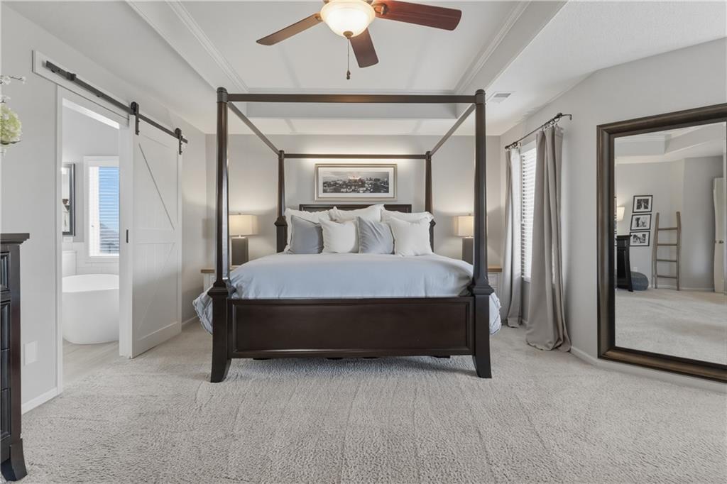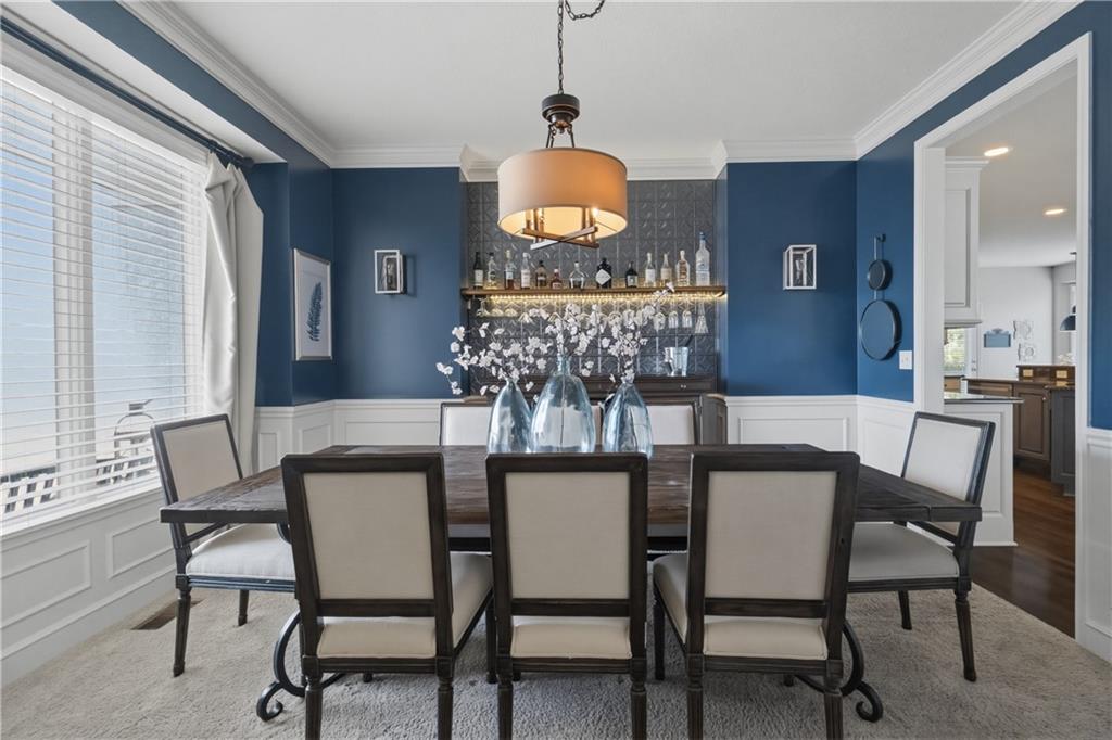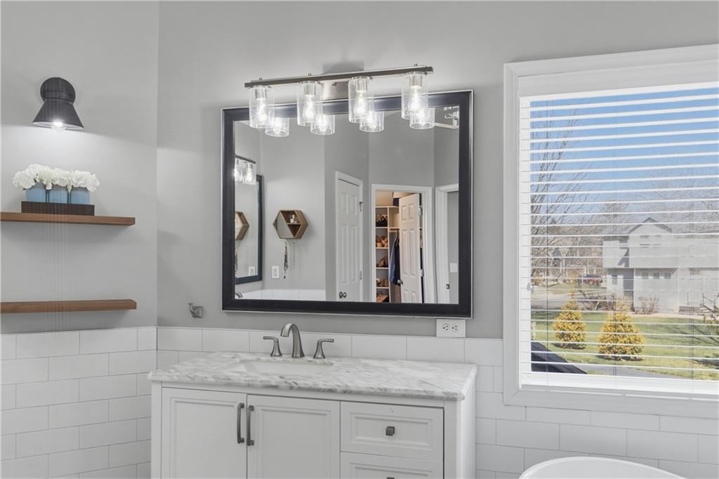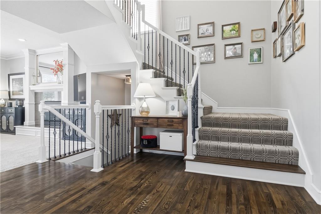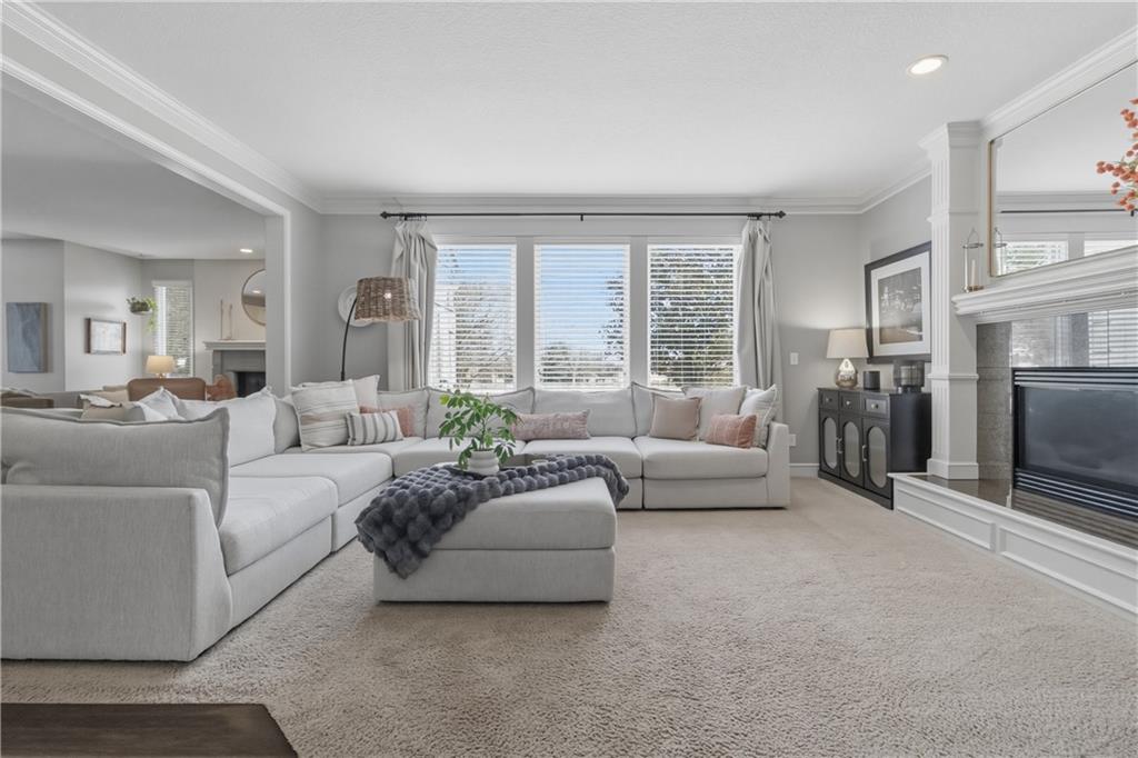 Backs to peaceful greenspace and trails, this beautifully updated home is truly move-in ready. The main level features hardwoods, fresh paint, updated lighting, and designer carpet. The great room with fireplace flows into a stunning remodeled kitchen with enameled cabinetry, granite countertops, stylish backsplash, stainless appliances, and gas range. Cozy hearth room with second fireplace, built-ins, and striking wood accent wall. Spacious primary suite includes a sitting area and an oversized walk-in closet. Lower level adds fantastic extra living space with modern finishes and accent wall. Enjoy the private deck and paver patio with firepit—perfect for relaxing or entertaining. Neighborhood amenities include walking trails, stocked pond, play area, and community pool, all just minutes from the elementary and middle schools. Home is surrounded by a 400 acre nature preserve with lakes, paved trails and abundant wildlife. Located in award winning Blue Valley Schools and convenient to shopping, dining, parks and quick highway access. Don't miss this AMAZING home.