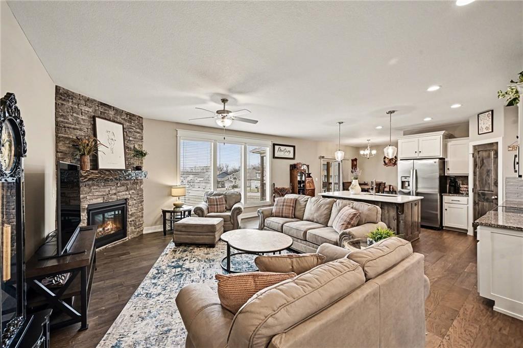 The covered front porch welcomes you home and invites you to slow down while sipping your morning coffee or enjoying a quiet evening sunset. Step inside and you’ll find a newer build designed for both everyday living and easy entertaining. The open-concept great room feels bright and welcoming, with a stone corner fireplace and a stunning quartz island that anchors the kitchen as its natural gathering place. A spacious corner walk-in pantry keeps everything tucked neatly away, while thoughtful finishes elevate the space from functional to beautiful. A smart and versatile layout elevates this home above the typical. The primary suite, laundry room, guest bedroom, and a dedicated office—offset with French doors—are all conveniently located on the main level, creating a floor plan that adapts seamlessly to work, rest, and hosting. Throughout the home, granite countertops, thoughtfully selected tile, and engineered hardwood flooring add layers of texture and timeless style. Downstairs, the family room and expanded bar area create the ultimate hangout zone—perfect for game days, movie nights, or weekend gatherings. All three bedrooms on this level with walk-in closets! Walk out to the patio for fresh air and added entertaining space, while the covered back deck—with added stairs to yard—offers yet another spot to unwind. Window blinds already in place add both comfort and convenience. Tucked into a quiet subdivision, you’ll enjoy quick access to shopping and dining at Zona Rosa, nearby airport access, and countless restaurant and entertainment options. Location, layout, and lifestyle—all wrapped into one beautifully designed package in the Park Hill School District!