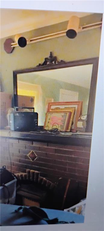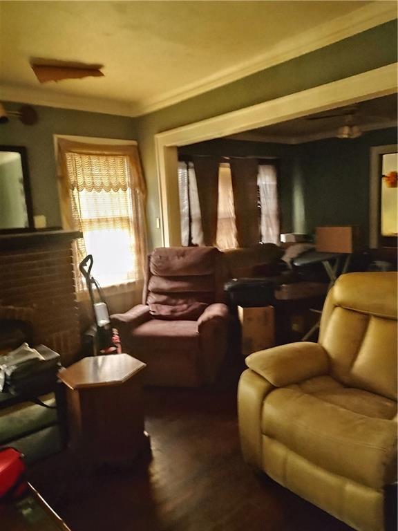 Living room with crown molding and a brick fireplace