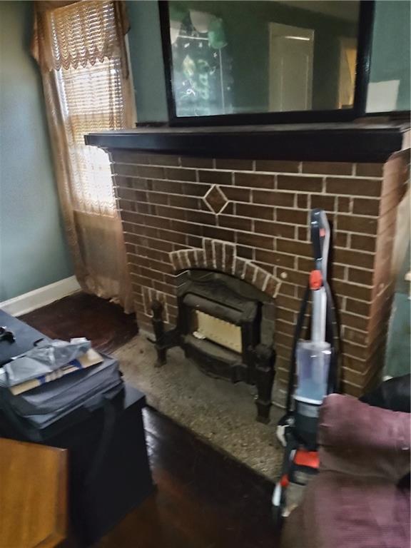 Detailed view of wood finished floors and a fireplace