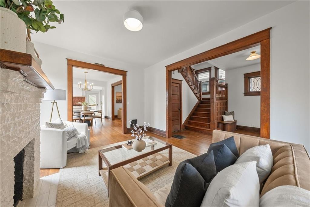 Welcome home! This newly-renovated, historically-preserved Hyde Park shirtwaist is ready for its next chapter. Lovingly restored by a local contractor, this home boasts three new bathrooms, a brand new kitchen, with custom cabinetry made by Lime and Lumber, a new driveway and new back deck. Original charm shines through in the detailed woodwork and covered front porch that define this classic home. This home offers a thoughtfully designed layout with two spacious living areas, a large dining room, and a kitchen that seamlessly opens into the main gathering space—creating an ideal flow for both everyday living and entertaining. While officially listed as a three-bedroom home, it also features a fourth non-conforming room that can easily serve as an additional bedroom, home office, or flex space to fit your needs. Additional updates include new exterior and interior paint throughout, newer windows on the sun porch and third floor, along with a mini-split system that provides efficient, zoned heating and cooling for the upper level—adding comfort and versatility throughout the home. Two blocks from Gillham Park and a short walk to The Nelson and several street car stops, this home boasts city living, with lovely green spaces nearby. Square footage figures are provided as a courtesy estimate only via floor plans and have not been independently verified. Buyer to verify all square footage information.
