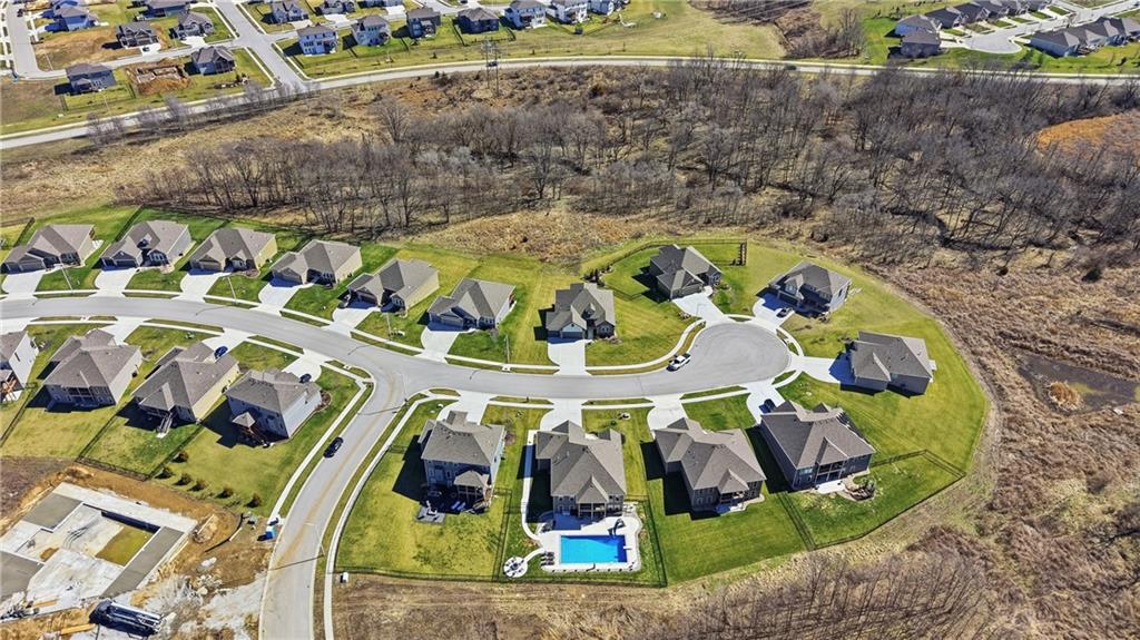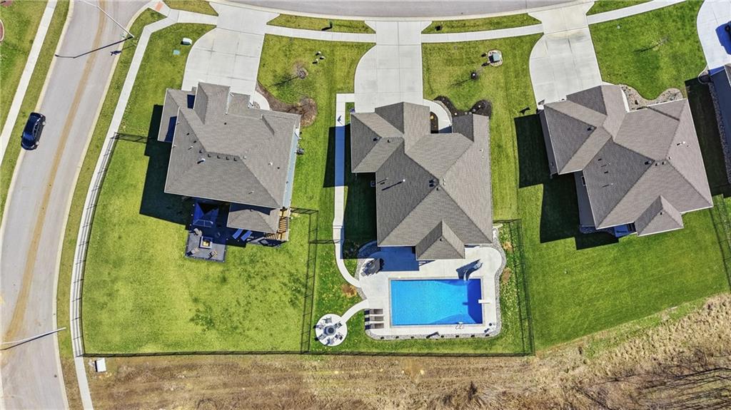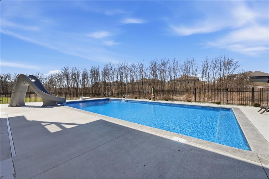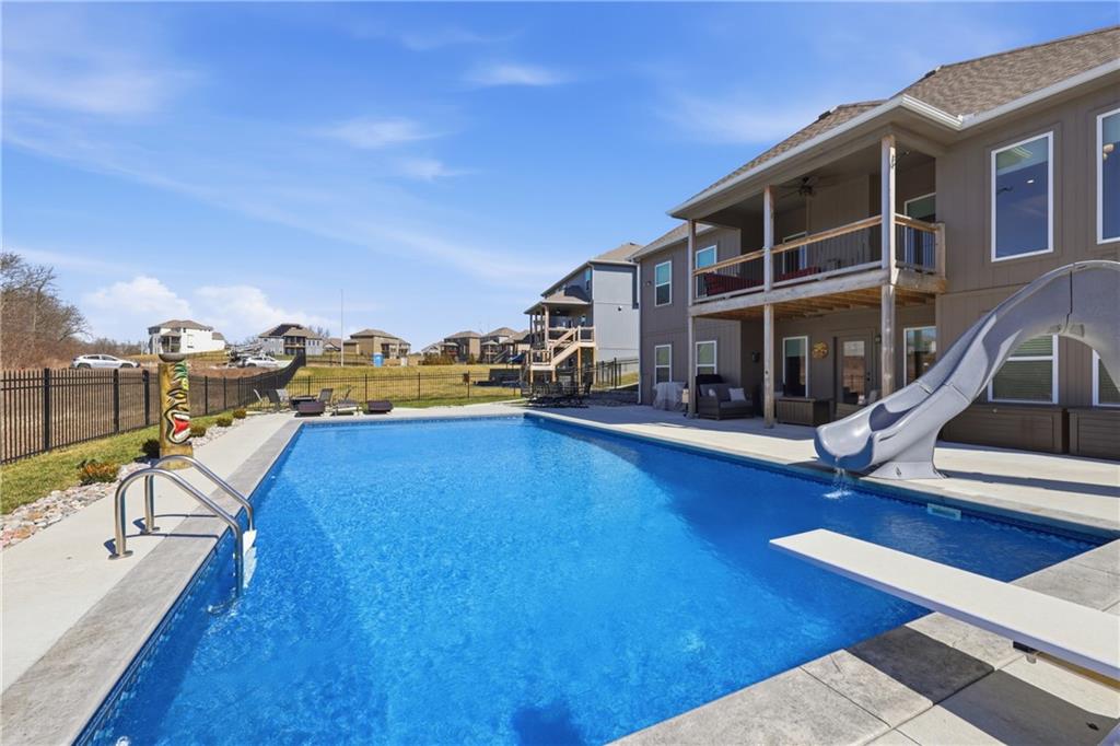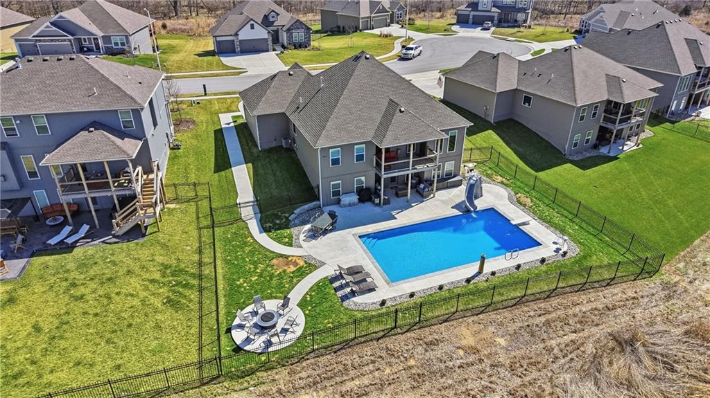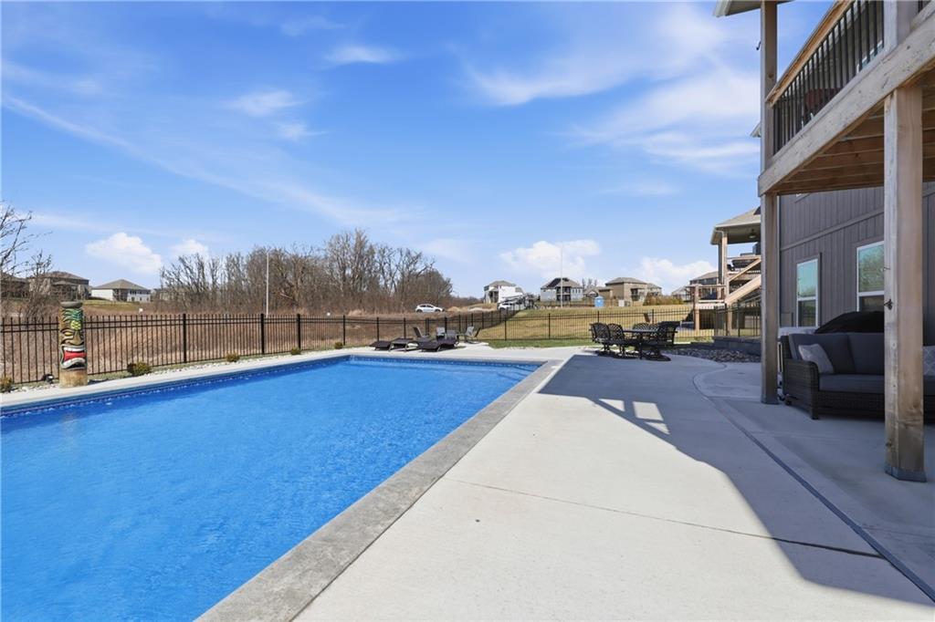 Private back yard oasis featuring a stunning 20 x 40 heated inground pool with diving board, slide and seating bench across shallow end with expanded concrete patio, and fire pit area! The pool and patio area allow you to enjoy a resort style back yard without the wait or any additional expense. All the upgrades and finishing touches have already been completed for you, including custom window coverings, upgraded trim package, and a high quality fencing valued at approximately $13,000.Built with two storage rooms for all your needs. Enjoy peaceful wildlife views in your own backyard. This reverse 1.5 story home is less than 3 years new and located in one of the Northlands most sought after new homes subdivisions. This prime location is just minutes from restaurants, shopping, easy Hwy access, and KCI Airport. Only 1/2 mi. away are NKC and Staley's most highly regarded schools. Thank you for showing our property, we are Dotloop friendly and please submit all contracts PDF.