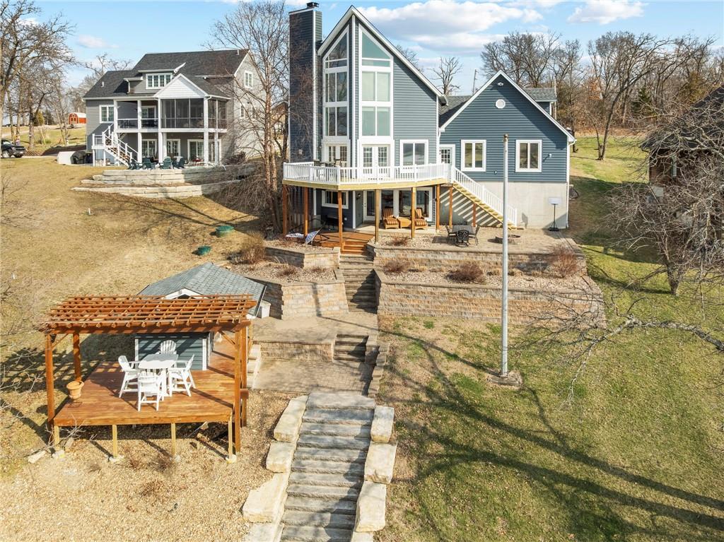 Attention Lake Lovers! Get ready to dive into the ultimate waterfront retreat with this incredible turn-key home featuring breathtaking views and everything you need to start living the lake life immediately. Just bring your suitcase and your lake clothes, the fun starts on day one. This home has been thoughtfully updated with a new roof, new siding, two new HVAC systems zoned for maximum comfort, and some new windows, giving you peace of mind and efficiency year-round. Outside, the concrete boat dock is ready for action with a lift, swim platform, and jet ski port and yes, 2 jet skis are included! A new stone retaining wall frames the lakeside patio, complete with landscaping, a pergola for shaded summer afternoons, and a lakeside shed to store all your water toys. Inside, you’ll find 3 spacious bedrooms plus a bonus bunk room on the main level and a non-conforming 4th Bedroom in the finished basement. With 4 full bathrooms this is perfect for hosting family and friends. The cathedral vaulted ceiling soars 30' high making a stunning first impression, while fireplaces in both the great room and the finished basement create cozy spaces to unwind. The basement wet bar is ready for entertaining after a full day on the water. Need garage space? The nearly 40-foot-deep 4-car garage provides exceptional room for vehicles, boats, and all your lake gear. Beautifully maintained, move-in ready, and packed with upgrades — this lakefront gem truly has it all. Start living the lake lifestyle you’ve been dreaming about!
