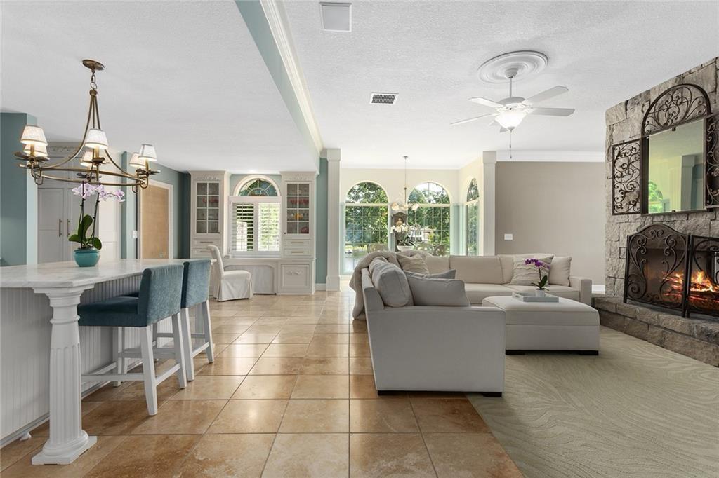 Tucked away on one of the most coveted lakefront lots in the Northland, this one-of-a-kind, custom-built home was thoughtfully designed by an interior designer to take full advantage of its breathtaking views. Nearly every room in this meticulously maintained residence has water views. Step into the grand foyer where soaring columns and faux marble accents set an elegant tone. From there, a second entry welcomes you with a barrel-vaulted, hand-painted ceiling and sweeping lake views that draw you further into the heart of the home. The French country-inspired kitchen is a dream for any entertainer or home chef, featuring a hand-selected marble island, custom cabinetry, a cozy stone fireplace, built-in entertainment center and desk, and an all-glass breakfast room with arched windows overlooking the lush, landscaped yard with multiple water features. The hearth room flows into a spacious living room with a see-through fireplace, a wall of glass framed with plantation shutters. The primary suite is a peaceful retreat with patio access, high ceilings, custom built-ins, upgraded carpet, and plantation shutters. The ensuite bath offers a spa-like experience with a dome ceiling over the soaking tub, walk-in shower, and dual vanities. A second bedroom also has direct patio access and features elegant travertine floors. Recently added second living quarters include a full gourmet kitchen, living area with built-ins, breakfast nook, second master suite with luxurious bath, large walk-in closet, and even a second laundry room—perfect for guests, in-laws, an adult child, or anyone looking for privacy and independence. The space also features its own private entrance. Additional highlights include a spacious three-car garage with high-end epoxy floors, a private dock with a pontoon boat included, full irrigation system, expansive patio and deck spanning the length of the home, and professional landscaping throughout. This is more than just a home—it's a lifestyle.