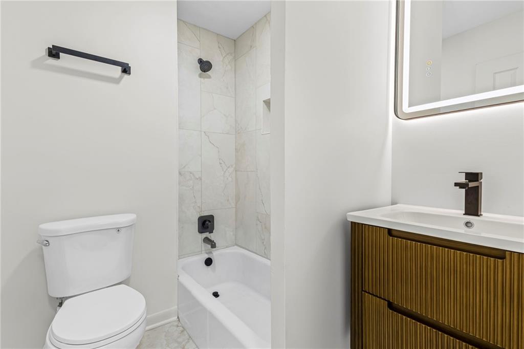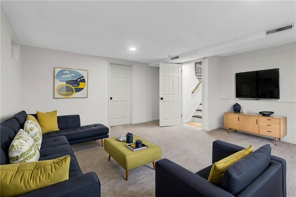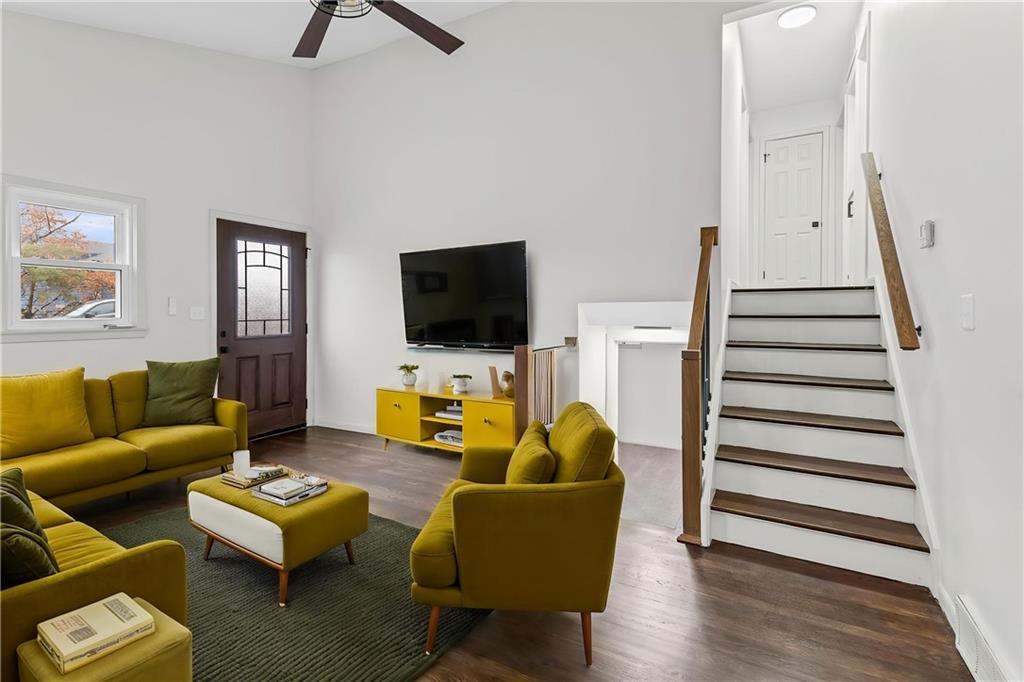 Stylish mid-century inspired home with a unique tri-level layout and beautifully updated interior.This 3 bedroom, 2 bathroom home offers vaulted ceilings, rich hardwood floors, and abundant natural light throughout the main living space. The updated kitchen includes white shaker cabinets, quartz countertops, stainless steel appliances, and modern tile backsplash with dining space nearby. Upstairs you'll find three bedrooms and two fully renovated bathrooms with stylish tile surrounds and modern vanities. The finished lower level provides a spacious second living area or family room, perfect for entertaining, a home office, or media space. Additional highlights include an attached garage with epoxy flooring, updated finishes throughout, and a large yard with mature trees. Move-in ready with style, function, and character.