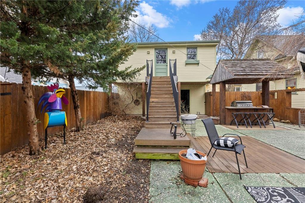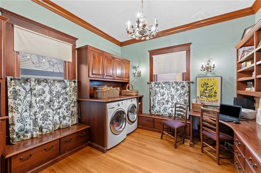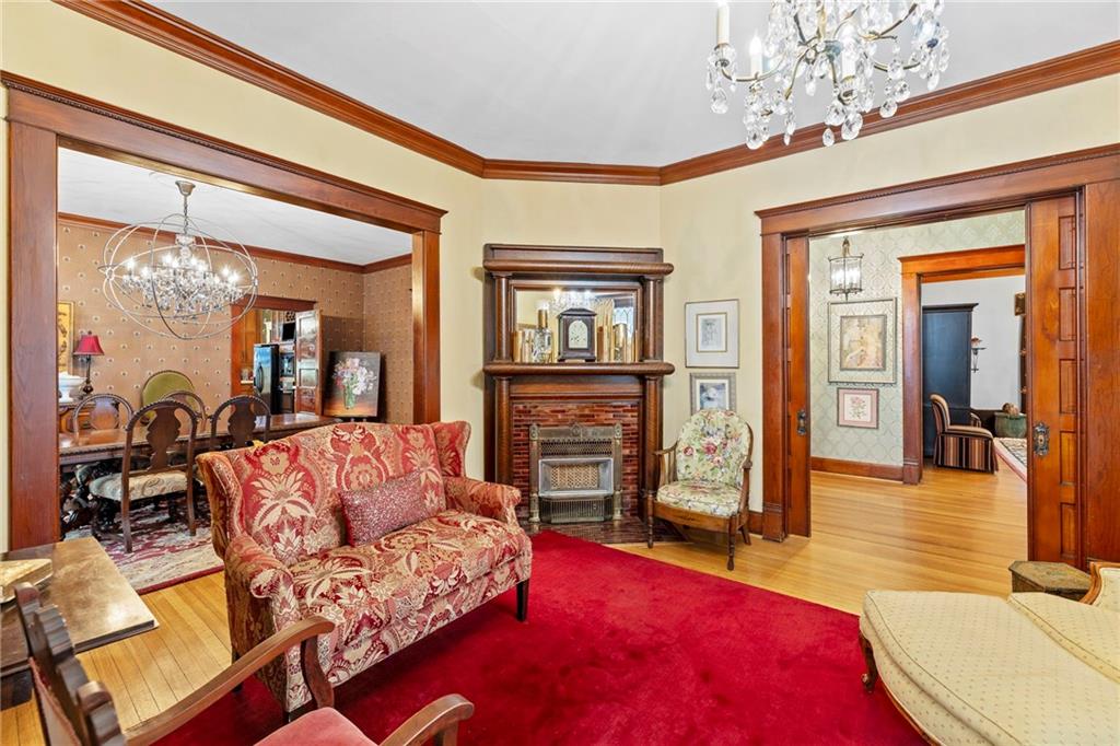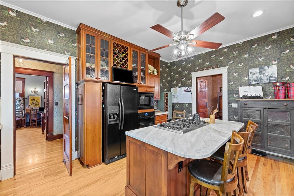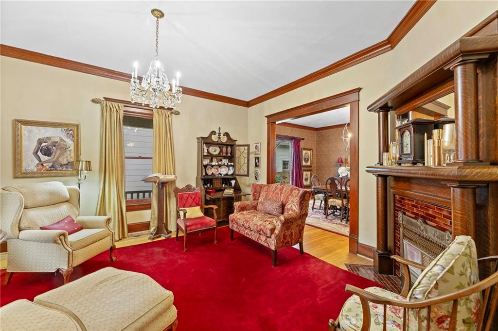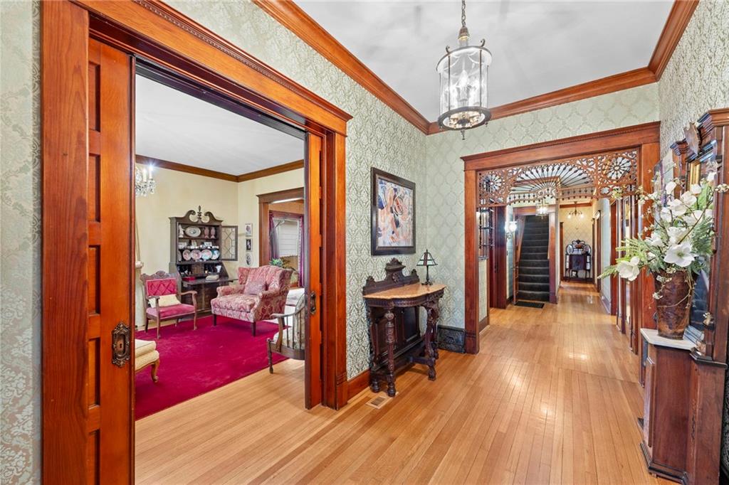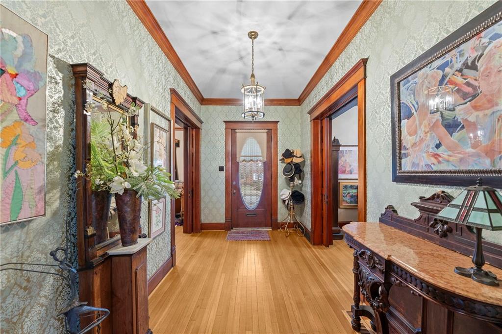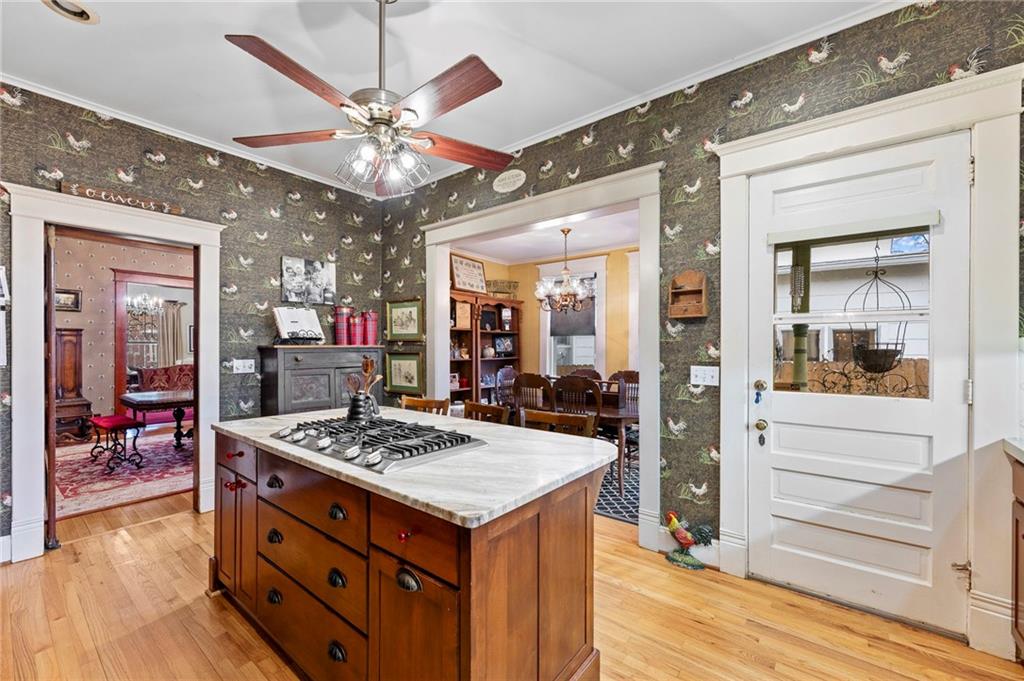 Expect to be impressed as you step into the timeless elegance of the "Washburn" house, a rare residence that masterfully blends old-world charm with sophisticated modern comfort. Meticulously updated while preserving its historic integrity, this home showcases authentic craftsmanship through unique chandeliers, ornate trim, wide crown and baseboard moldings, and original solid wood interior doors. The architectural character shines in the 3 sets of beautiful pocket doors and the lead glass windows that grace the front of the home, while modern peace of mind is provided by newer windows throughout the rest of the house and a central heat and air system installed within the last 5 years. A large, covered front porch invites you into a grand entry room, flanked by an elegant living room featuring an original fireplace and a lovely, sunlit parlor. The gourmet kitchen is a chef's dream, boasting cherry cabinetry, a quartz island, and high-end appliances including a gas stove and a new convection oven with air-frying capabilities. Two butler doors offer seamless flow into the massive formal dining room, perfect for hosting memorable gatherings. The main level features gorgeous hardwood floors and houses 3 spacious bedrooms—including a primary suite —all equipped with walk-in cedar closets and accompanied by 2 full. bathrooms. Upstairs you will find a fourth bedroom, a third bathroom, a cozy den, and a sprawling unfinished area brimming with potential for additional living space. With laundry hookups available on both the main floor and the basement, a detached garage with a finished room above, and a courtyard-style yard ideal for summer barbecues, this property is truly one of a kind. Located within walking distance of the historic Paola square, this home is ready for its next chapter—schedule your private tour today!