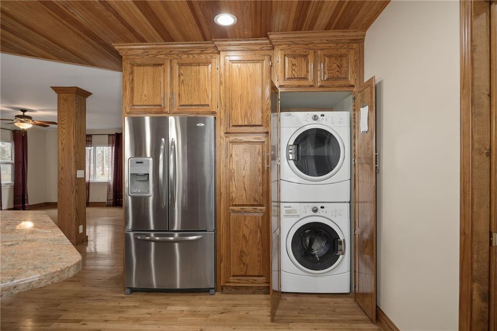 Step into timeless character and modern comfort in this beautifully preserved 1948 historic brick home offering 1,676 square feet of finished living space on the main floor - plus a stunning 17x8 sunroom with heated tile floors for year-round enjoyment. The main level features 3 bedrooms and 1 1/2 bathrooms, all accented by rich oak hardwood floors that carry warmth and charm throughout the home. The full bathroom is a true showpiece, showcasing a luxurious onyx walk-in shower and a matching onyx vanity countertop - elegant, durable, and unforgettable. The heart of the home presents a bright open-concept kitchen and living space, blending classic craftsmanship with modern upgrades. You'll love the oak cabinetry, high-end appliances, and European-import "New Lady's Dream" countertops that make a statement both in style and function. Main-floor laundry adds everyday convenience, and all appliances - including the stackable washer and dryer - remain with the property. Downstairs, the full unfinished basement provides exceptional potential and includes an additional laundry hookup, plus a shower and water closet. Major updates have already been completed, and the original blueprints, manuals, and paperwork have been meticulously preserved - a rare and valuable bonus for a home of this era. Outside, a 28x40 three-car detached garage (added in 1995) offers abundant space for vehicles, hobbies, or storage. Step onto your expansive 20x18 wooden deck and take in views of the beautifully landscaped .67-acre yard. The current owners have thoughtfully designed an outdoor oasis featuring mature Oak, Ash, Pecan, and Cherry trees, vibrant perennial flowers, and winding stone walkways that create the feeling of your own private secret garden. Historic charm. Thoughtful updates.
