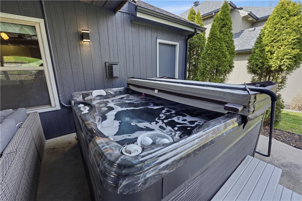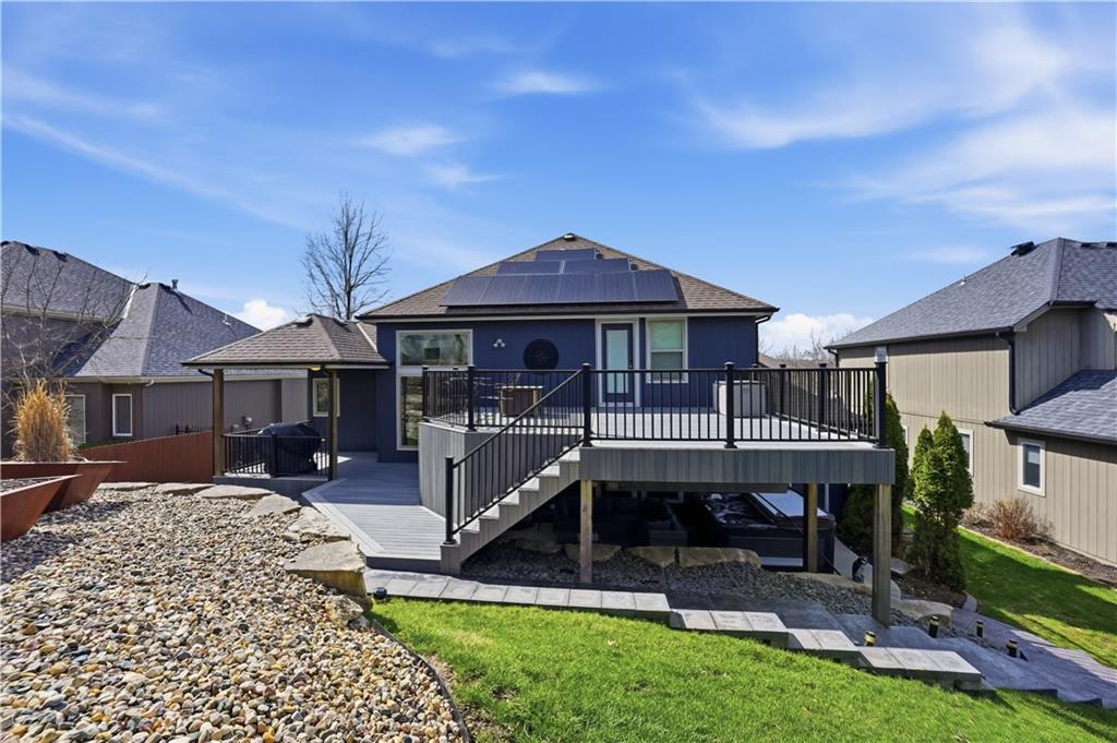 You’ll find modern luxury & unbeatable convenience in this move-in ready 4 bed, 3 ½ bath home packed with extra features. Experience the perfect blend of high-tech sustainability and resort-style living. Ideally situated on a quiet dead-end street in the highly rated Park Hill School District, this home is a commuter’s dream. Reach downtown in just 10 minutes and KCI in 15 min. The interior is designed for both grand entertaining and quiet comfort. The gourmet kitchen features a large center island, granite counters, gas cooktop and walk-in pantry for lots of storage. The spacious primary suite features a spa-like ensuite bath and direct access to the deck and play area. The flexible lower level features a full private suite with its own private bath—ideal for a home office or long-term guests. The outdoor living space is a true year-round retreat with a massive composite deck that spans the back of the house, featuring a covered section and a built-in natural gas grill with easy access to the kitchen. Below the deck is a private, stamped concrete patio with a "dry ceiling" system. Stay comfortable and dry in any season with a gas heater, outdoor TV, and a relaxing hot tub. The patio adjoins the large family room with fireplace, a half bath and convenient laundry room. All bedrooms have ceiling fans and generous closet space. More storage in the dedicated storage room accessed from the patio for all your seasonal gear and tools plus an additional storage room in the basement. Extensive professional landscaping includes durable poured concrete edging. The oversized 3-Car garage has two garage door openers & insulated steel doors. It is prepped for your EV charger and even more storage. Washer and dryer stay, and the solar panels are fully paid off, offering immediate energy savings. Enjoy the community amenities of this vibrant neighborhood with a huge community pool and a playground. Nearby is access to the Line Creek Trail system. This home checks all the boxes!