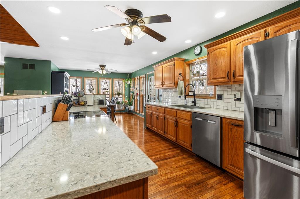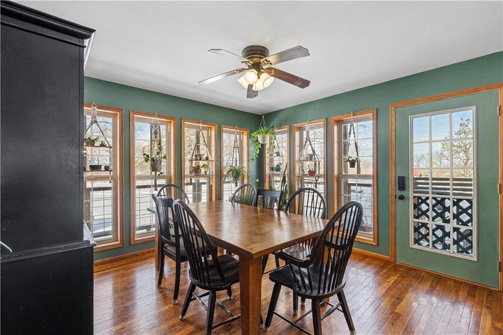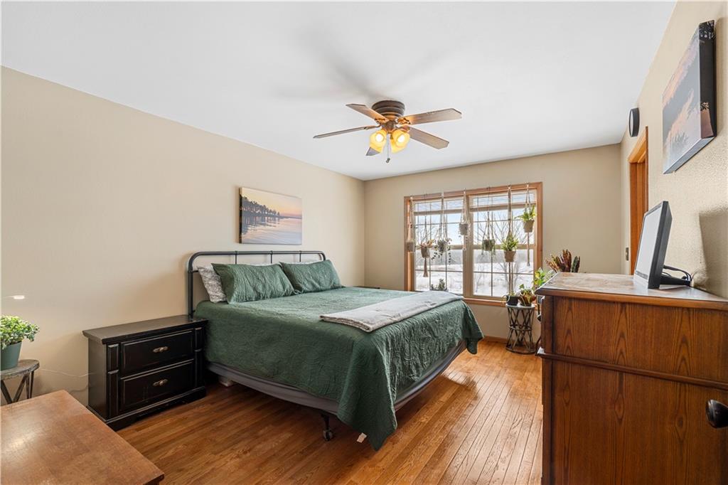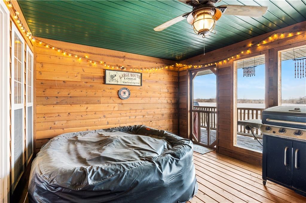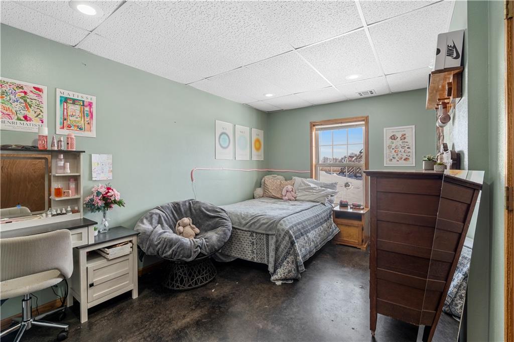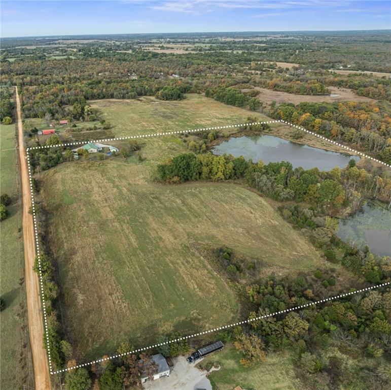 Pasture, ponds, timber, and a 4,000+ square foot home on 33 acres m/l to be determined by survey. This property offers a mix of open ground and mature timber along with two ponds, creating a private rural setting with room for livestock, recreation, or simply enjoying the outdoors while still a short drive from town. The ranch-style home features a full walk-out basement and more than 4,000 square feet of living space. Cedar siding, stone accents, and a metal roof provide lasting curb appeal. A wraparound covered front porch, finished screened-in porch, and covered rear porch overlook the surrounding acreage and ponds. Inside, the home welcomes you with a dedicated entry foyer and an open living concept with a vaulted wood-plank ceiling and large windows providing excellent natural light. Hardwood floors run throughout the main level along with wood trim and interior wood doors.The kitchen flows into the living and dining areas and includes granite countertops, ample cabinetry, and a stainless steel appliance package. The main level offers 4 bedrooms and 2.5 bathrooms, including a primary suite with a garden tub, walk-in shower, and walk-in closet. A laundry and mudroom provides convenient access from the attached garage into the kitchen. Storage and closet space is abundant throughout. The fully finished walk-out basement includes two additional bedrooms, a full bathroom, and a large recreation and living area with stained concrete floors. Mechanical and storage rooms are also located on this level with direct access to the backyard. A circle drive provides ample parking for trailers or recreational vehicles. Rear access to the attached two-car garage maintains a clean front elevation. RV utility hookups are located just south of the home, and an outbuilding sits behind the house. Property is also available with less acreage. See MLS #2599037 for an alternate listing including the home with approximately 10 acres m/l to be determined by survey.
