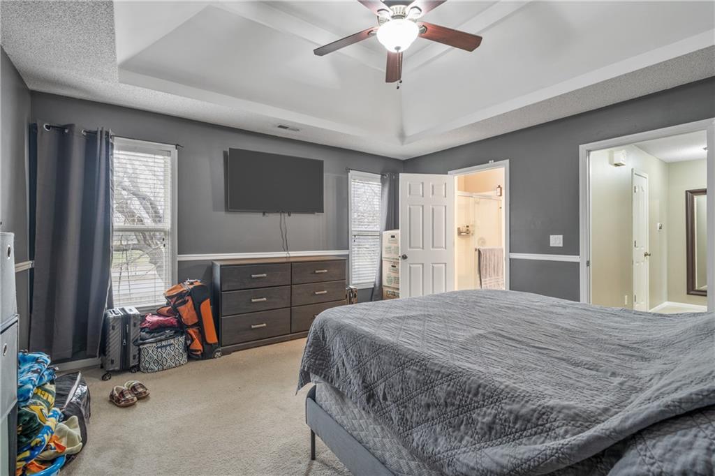 Welcome to this beautifully maintained 2-story home, move-in-ready gem nestled in the highly sought-after Parkhill Manor subdivision! Offering a bright and inviting layout, this home perfectly balances everyday comfort with fantastic entertainment potential in one of Olathe's most prime locations. Step Inside Your New Home: Open & Bright Living: Walk through the front door and be greeted by a spacious living room bathed in natural light, seamlessly flowing into a cozy dining space. The modern kitchen features a convenient breakfast bar, ample cabinetry, and an intuitive layout designed for both quick morning coffees and hosting family feasts. Private Master Retreat: Head upstairs to unwind in your primary suite, complete with a dedicated en-suite bath. Two additional generously sized bedrooms and a full bath provide plenty of space for family, guests, or hobbies. The fully finished basement is a versatile blank canvas—ideal for a home theater, a secluded home office, a playroom, or your personal fitness gym! Outdoor Living & Unbeatable Amenities: Your Private Backyard Oasis: Step out onto the patio overlooking a large, fully fenced backyard—the perfect setting for summer BBQs, letting the pets roam, or peaceful weekend relaxation. Enjoy warm summer days with exclusive access to the neighborhood swimming pool and playground. Location is everything! You are just a 2-minute stroll from Olathe's premier Black Bob Park and few mins to Heritage Park. Your family will love having instant access to miles of walking and biking trails, baseball and soccer fields, picnic shelters, playgrounds, and the beloved Black Bob Bay Water Park right in your backyard! Top-Tier Schools & Convenience: Zoned for the award-winning Olathe School District (Arbor Creek Elementary, Chisholm Trail Middle, and Olathe South High). Plus, you are just minutes away from fantastic shopping, local dining, the Olathe Farmer's Market, and easy highway access for a breezy commute.