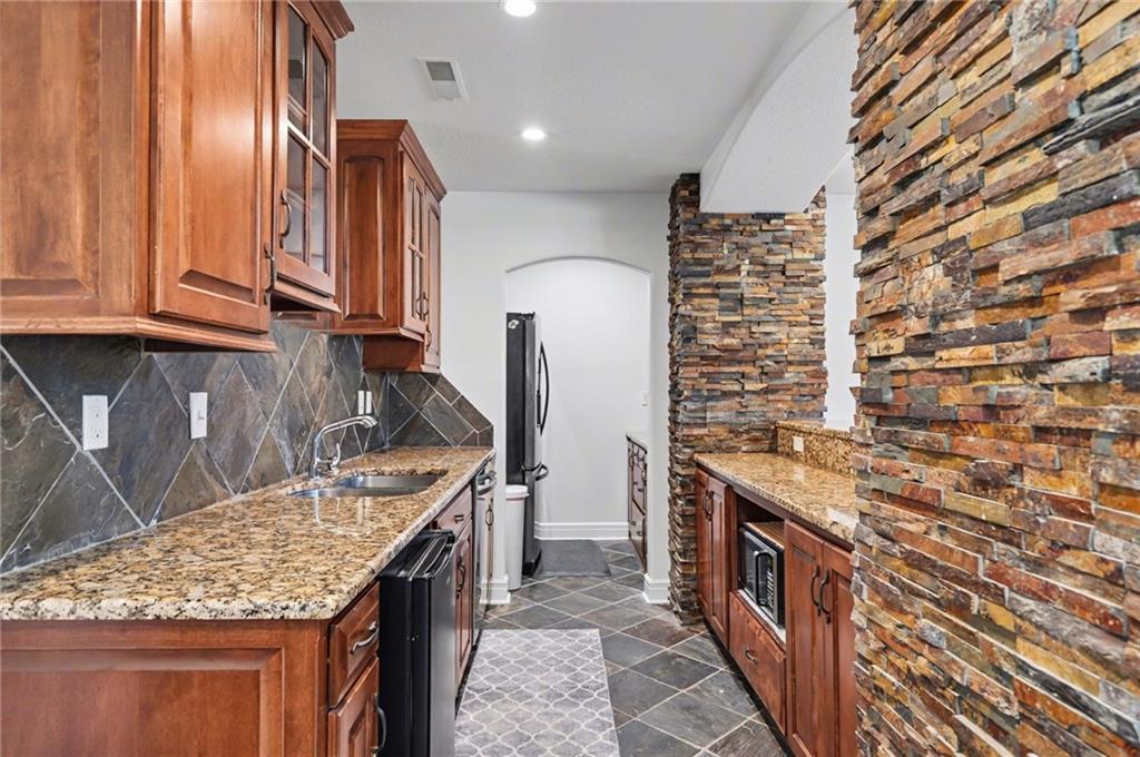 Unique opportunity to own an expertly crafted luxury home located in a quiet neighborhood. Soaring ceilings, high end finishes, 1,380 sq ft of unfinished storage with natural light and windows everywhere. Major expense updating trim & cabinet paint, double HVACs, flooring, lighting, etc. Kitchen has double wall ovens, gas cooktop, a large kitchen island next to a screened in deck overlooking all of the land going down to the lake that the neighbor owns. Formal dining room offers a refined space for entertaining or hosting special holiday gatherings. Guest room on the front and office/3rd bedroom on the back. The full walkout basement has even more living space with 2additional bedrooms and a large second living area. A wet bar complete with a pantry, refrigerator, dishwasher, and microwave perfect for hosting guests or watching movies. Enjoy colorful Kansas sunsets in your back yard with no HOA to answer to.