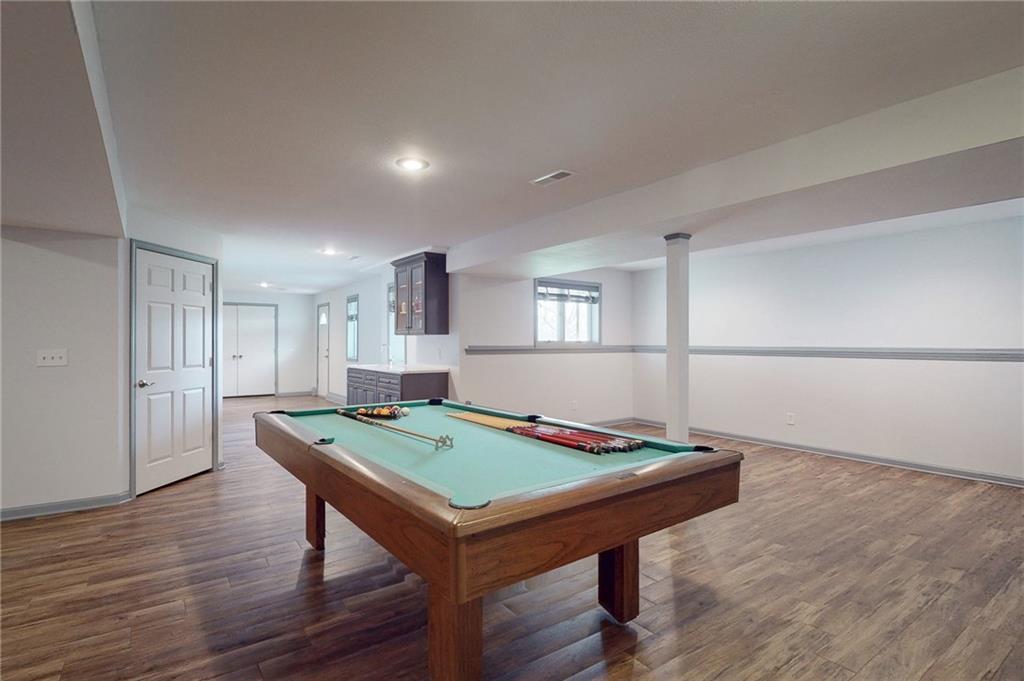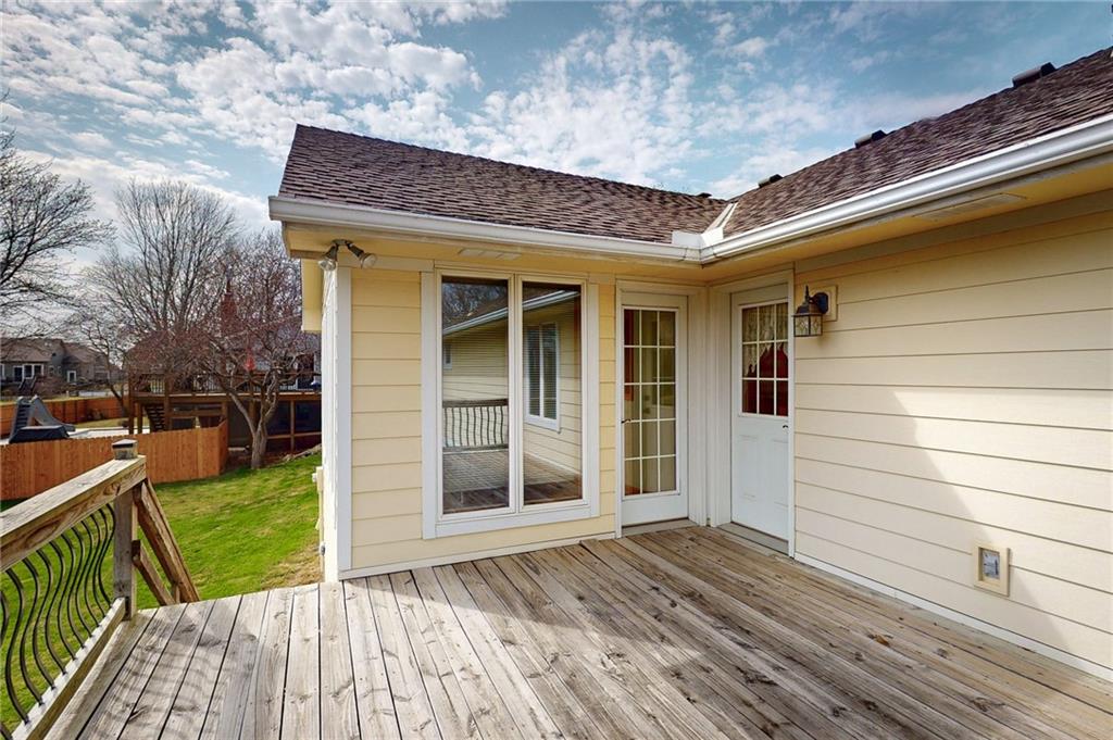 This meticulously maintained one-owner ranch home sits on a large corner lot and is truly move-in ready! The main level features three spacious bedrooms and two full bathrooms, with a fourth non-conforming bedroom and third full bath in the finished lower level. The home also offers a 3-car garage (2 on the main level 24x25 and 1 in the lower level 13x23). Inside, you’ll find beautiful hardwood floors in the living room, kitchen, and hallway. The inviting living room features a stunning fireplace with built-in shelving on both sides, creating a warm and welcoming focal point. The main level also showcases solid wood six-panel doors throughout. The updated kitchen features Cambria quartz countertops and opens to a wonderful sunroom that is heated and cooled with the rest of the home, complete with Anderson windows—perfect for enjoying year-round views of the backyard. Step out onto the 15x15 deck overlooking the spacious backyard, which includes a garden area ready for planting and a mature pear tree. The exterior boasts James Hardie fiber cement siding and a 50-year GAF Timberline Ultra HD Class 3 impact-resistant roof. Gutters are equipped with leaf guard covers for low maintenance. The finished walkout lower level features LVP flooring, a wet bar with quartz countertops, and plenty of flexible space for a family room, game area, workout space, or entertaining. It also provides access to the third garage and includes a concrete safe room located under the front stoop. Conveniently located just one block from the Raymore Recreation Center, park, playground, walking trails, pickleball courts, and more!