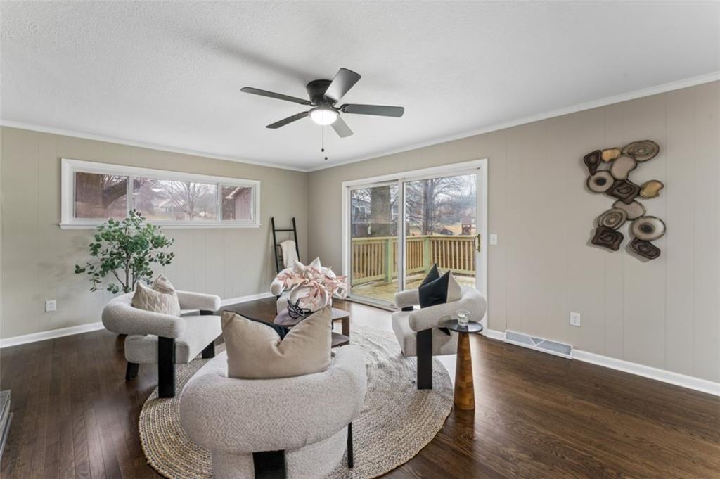 Beautifully remodeled 5 bedroom, 2.5 bath home offering over 3,500 finished square feet of living space. The main level features refinished hardwood floors, a spacious living area with a striking brick fireplace, and an open layout that flows into the fully updated kitchen with quartz countertops, custom cabinetry, stainless steel appliances, and subway tile backsplash. Sliding doors lead to a deck overlooking the backyard, perfect for relaxing or entertaining. The finished lower level provides over 1,400 additional square feet of flexible living space ideal for a family room, office, or guest area. Move-in ready with modern updates throughout and conveniently located near shopping, dining, and major highways.