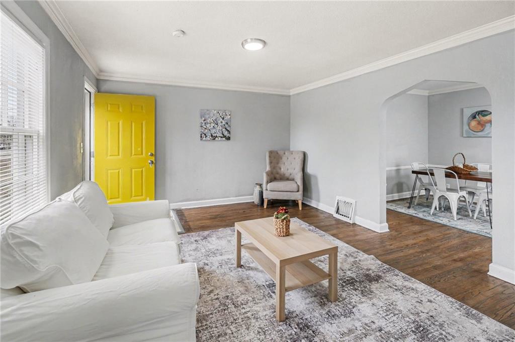 Updated home with a bright living room and arched opening to the dining area, plus neutral interior paint and white trim. The kitchen features granite-look countertops, subway-tile backsplash, double-bowl sink with gooseneck faucet, stainless electric range, and LVP-style flooring, plus a rear door to the yard. Hardwood flooring runs through the main living areas. The refreshed bath offers a tub/shower surround, pedestal sink, and updated lighting. The unfinished basement with painted stone foundation provides a large open area for storage and hobby space with easy access to mechanicals/utilities. Spacious front yard with mature shade trees. Buyer to verify all info and measurements.