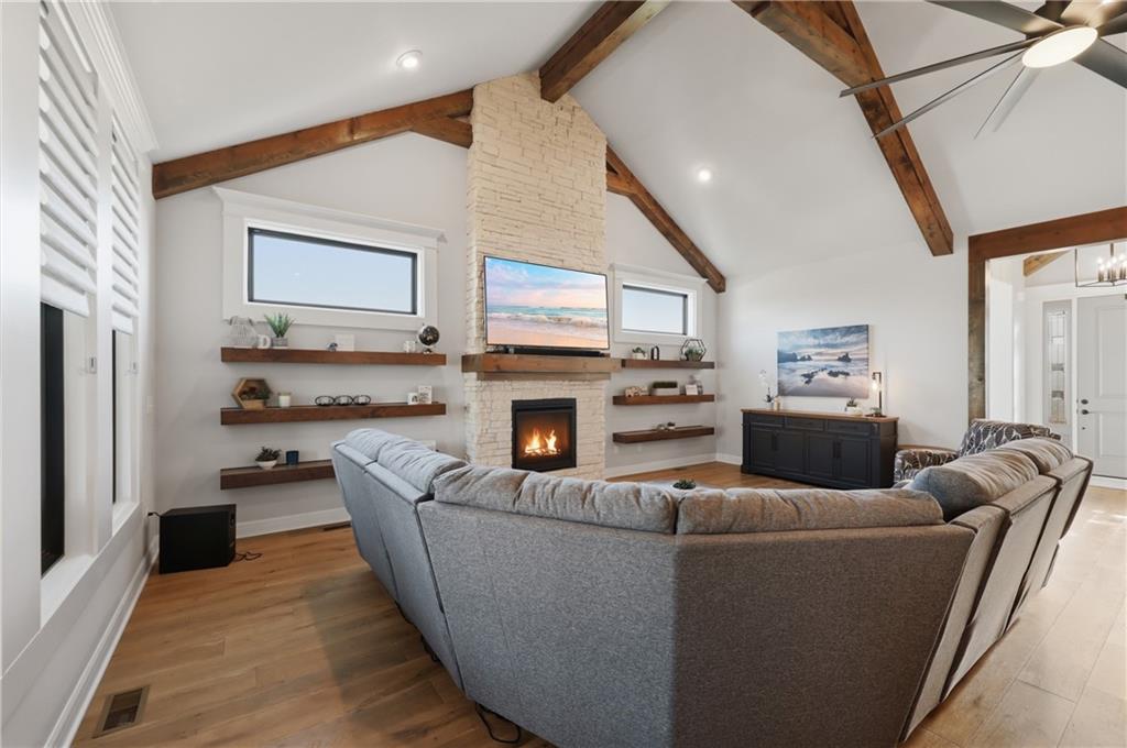 Beautiful custom-built, one-owner reverse 1.5 story offering quality craftsmanship and thoughtful upgrades throughout. This stunning home features soaring ceilings with exposed beams, creating a warm and inviting open floor plan. The spacious kitchen is equipped with high-end KitchenAid appliances, ample cabinetry, and flows seamlessly to an enclosed deck just off the kitchen—perfect for relaxing or entertaining. Enjoy the comfort of heated floors, custom blinds, tankless hot water, and dual-zoned HVAC for year-round efficiency. The main level offers generous living space while the finished walkout basement expands the home with additional living areas, bar, and plenty of room for guests or entertaining. This home includes 3 bedrooms and 4 bathrooms, providing space and privacy for everyone. You will appreciate the oversized 3-car garage featuring durable epoxy floors. Enjoy a lush, well maintained lawn made easy with a full ground sprinkler system. A rare opportunity to own a beautifully maintained custom home with premium upgrades and exceptional attention to detail.