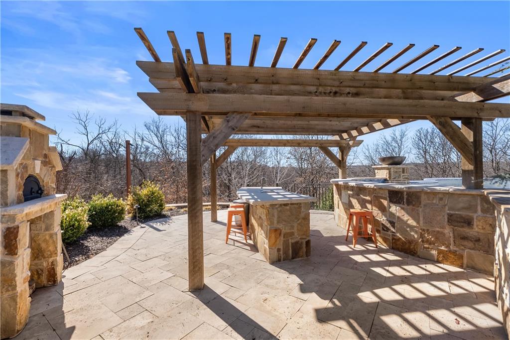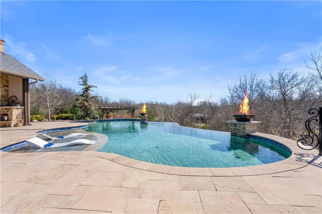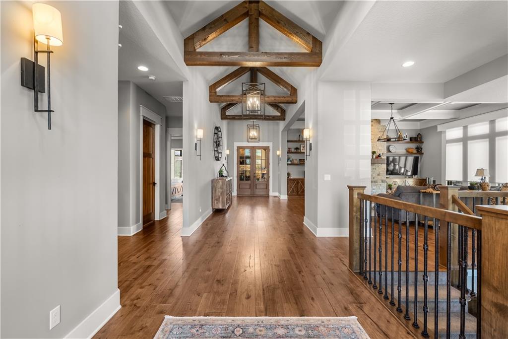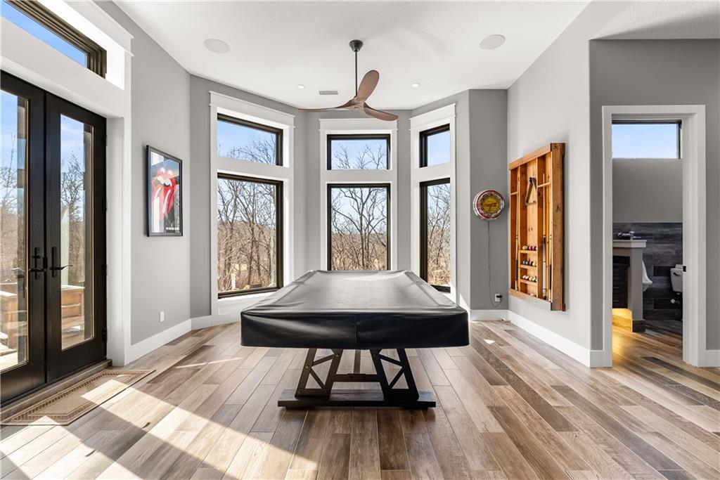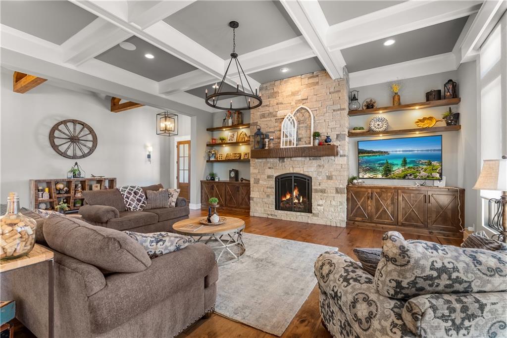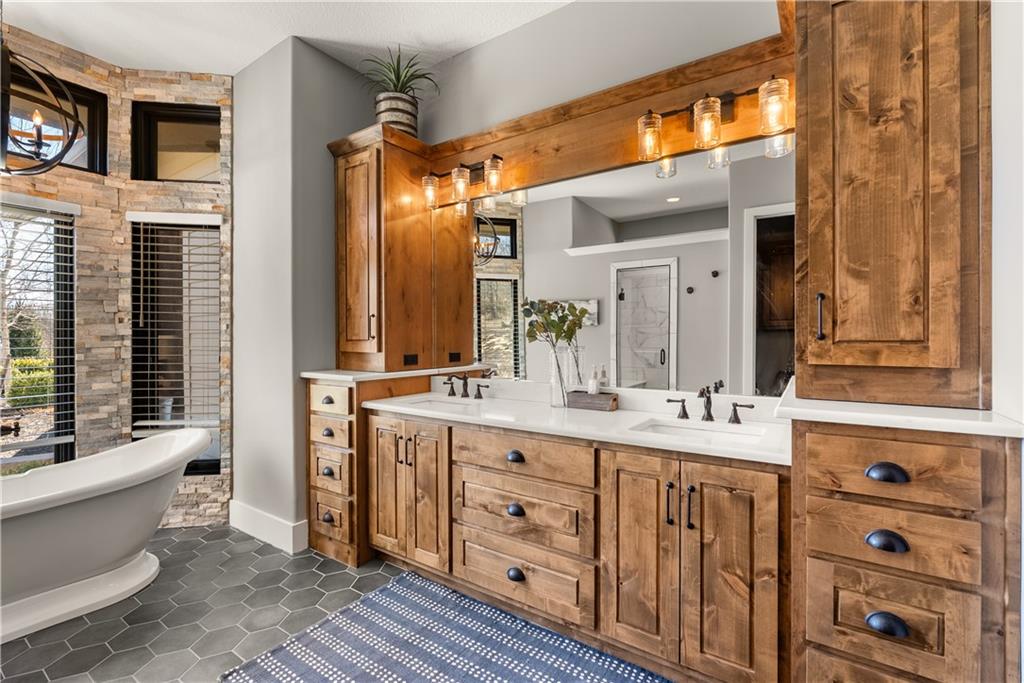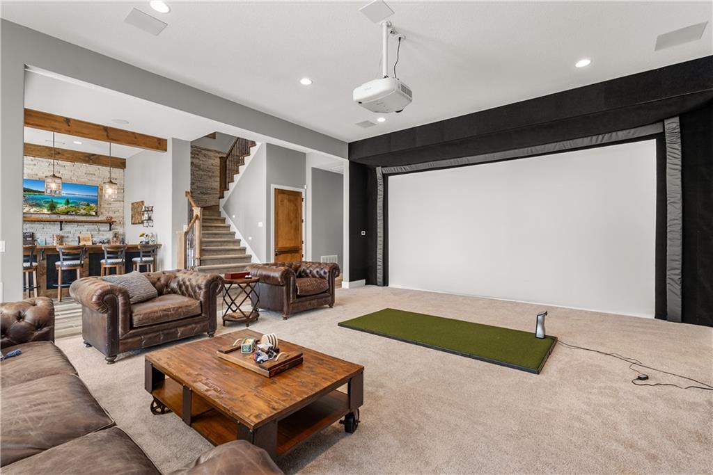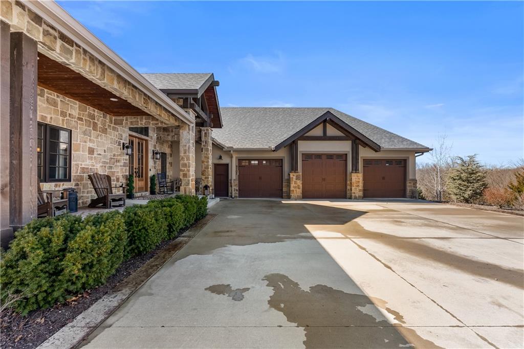 Dreams truly come alive in this one-of-a-kind custom Reverse 1.5 Story estate nestled on 9+ breathtaking acres in unincorporated Jackson County within the Lee’s Summit School District. This private retreat offers unmatched craftsmanship, panoramic treetop views & resort-level amenities that cannot be replicated. A grand front porch w/stone accents & custom doors welcomes you into a stunning interior featuring soaring 12-foot ceilings on both levels & architectural detail throughout. The main level showcases a dramatic living area w/west-facing views and a chef’s kitchen designed for everyday luxury and entertaining—complete with oversized island, custom shelving, walk-in pantry, double refrigerator/freezer combo, & oversized gas range. Light filled dining space, coffee bar-perfect for morning routines. The primary suite is a private sanctuary w/direct access to the covered patio for seamless indoor/outdoor living. The spa inspired bath features dual vanities,deep soaker tub, walk-in shower, & a generous walk-in closet w/custom built-ins. A main-level den (or 2nd bdrm) & convenient laundry complete the layout. The finished lower level is an entertainer’s dream featuring an oversized golf simulator & projector ,full wet bar, media/rec space, pool table area, exercise room w/sauna, & 2 additional bedroom suites each w/private baths & walk-in closets. A suspended garage provides rare lower-level 4th garage access—ideal for workshop, car collection, or storage. And then…This resort-caliber setting rivals luxury destinations. The vaulted covered patio w/stone FP creates year-round ambiance. Step outside to a spectacular infinity-edge pool with swim-up bar, tanning ledge, outdoor kitchen, & unobstructed treetop views offering 100% privacy. Entertain in your custom silo bar, practice on the putting green, unwind beside three cascading rock waterfalls surrounded by professional landscaping & custom exterior lighting. A signature property offering an unmatched lifestyle.