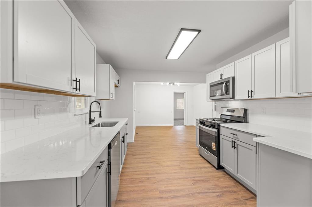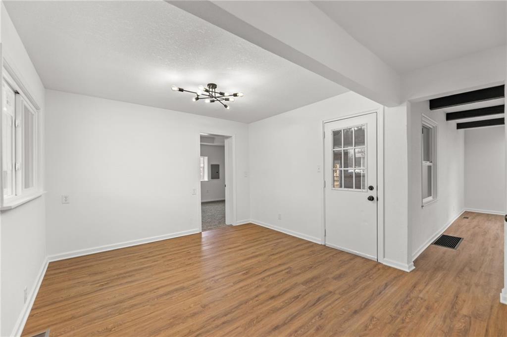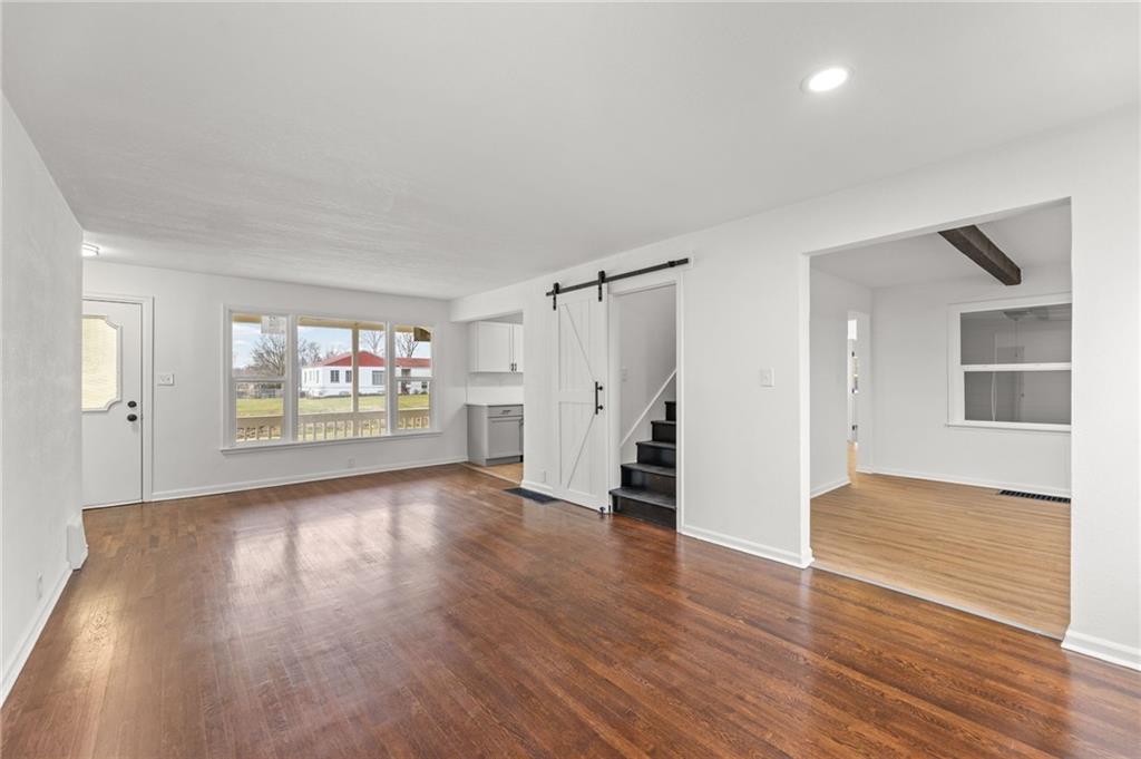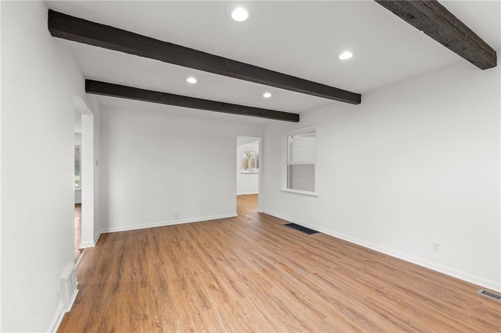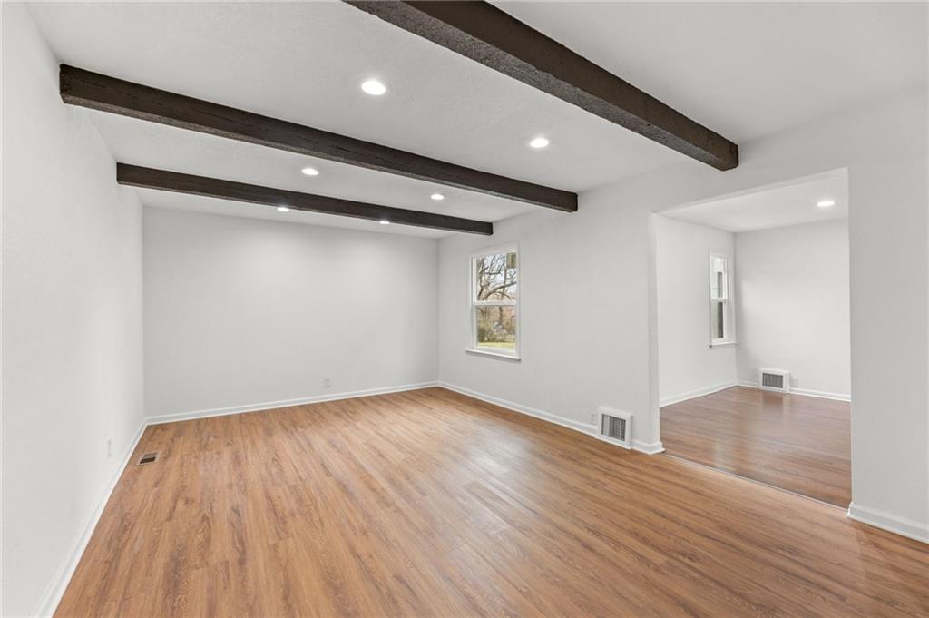 Completely renovated and move-in ready, this beautifully updated home blends classic charm with modern finishes on an expansive lot. Nearly every surface has been refreshed, including new flooring, fresh interior and exterior paint, brand-new windows, updated kitchen cabinetry, and new appliances, creating a bright and welcoming space throughout. The main level features a spacious living area with striking exposed beams and an open flow that connects seamlessly to the dining area and updated kitchen—perfect for everyday living or entertaining. Large windows fill the home with natural light, while multiple living areas offer flexibility for a formal living room, family room, or home office. Upstairs you'll find a private oversized bedroom suite complete with its own full bathroom, creating an ideal retreat for a primary bedroom, guest space, or quiet work-from-home setup. Step outside to enjoy nearly half an acre of yard space, offering room to garden, entertain, or simply relax. The large detached garage provides excellent storage, workshop potential, or additional parking. Conveniently located near shopping, dining, parks, and major highways, this home offers both space and accessibility. Schedule your showing today. Homes with this much space, land, and renovation rarely last long.