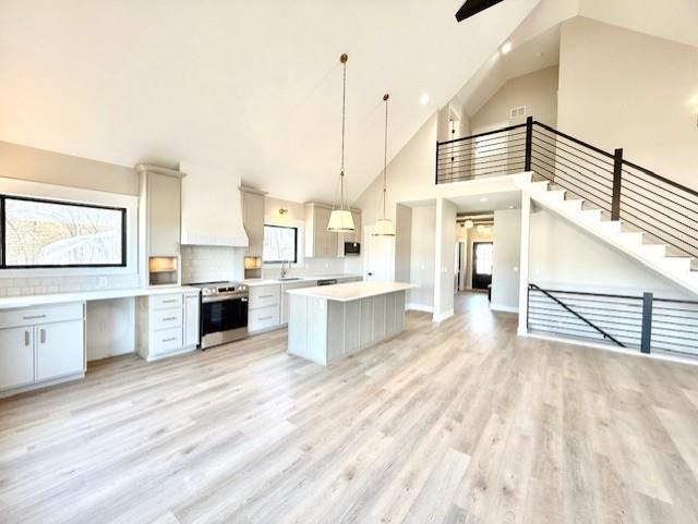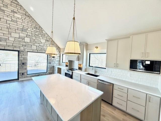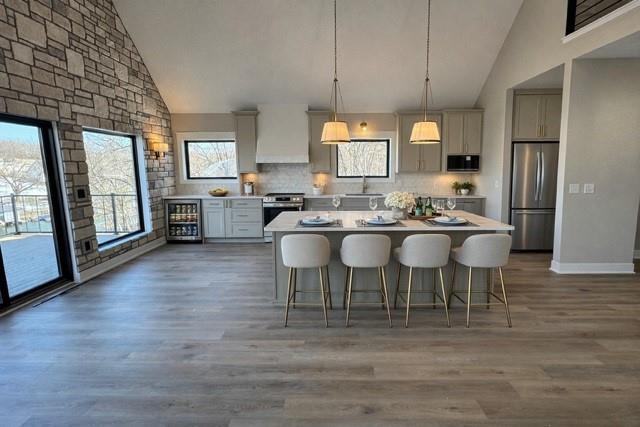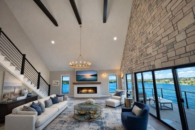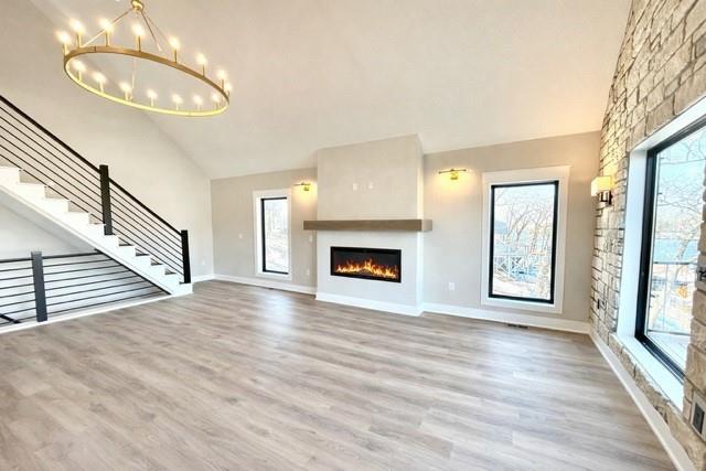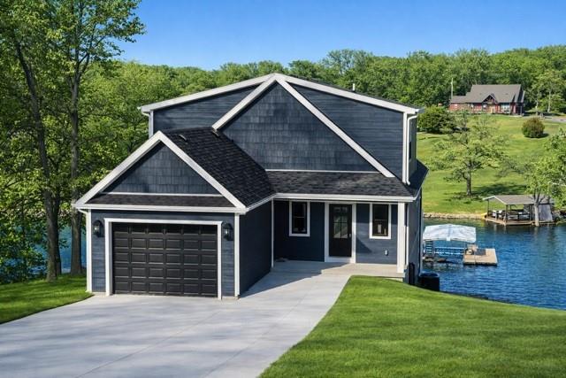 Brand-new luxury lakefront retreat located on Lot 163 with approximately 96 feet of shoreline, perfectly positioned in one of Lake Viking’s most highly sought-after coves. This stunning home offers 3 bedrooms, a spacious bunk room, and 3.5 baths, thoughtfully designed to capture the beauty of lake living while showcasing high-end finishes, exceptional craftsmanship, and effortless functionality. The expansive great room features a dramatic 25-foot floor-to-ceiling stone accent wall, creating a striking architectural centerpiece. The designer kitchen is both elegant and functional, featuring quartz countertops, stainless steel appliances, oversized island perfect for gathering, and a walk-in pantry. The main-level primary suite offers a private lakeside retreat with a large closet and a spa-inspired bathroom that delivers with a tiled wet room. Upstairs, you’ll find a large bedroom, a full bathroom, and an impressive built-in 6-person bunk room. The lower level expands the home’s entertaining possibilities with a spacious family room that opens to the covered deck, a bar and wine rack, an additional bedroom and full bath, and a large unfinished storage/flex space. The property also features a one-car garage, covered dock with lift, and a lakeside fire pit area where nights are spent around the fire sharing stories and creating lifelong memories. With its premium cove location, 96 feet of shoreline, luxury finishes, and thoughtfully designed living spaces, this home offers the perfect setting to fully embrace the Lake Viking lifestyle. This brand-new home includes a 12-month builder warranty from the contractor, providing peace of mind as you begin your next chapter at the lake. This is more than a home—it’s a place to wake up to water views, gather with friends on the deck, and experience lake life the way it was meant to be lived.