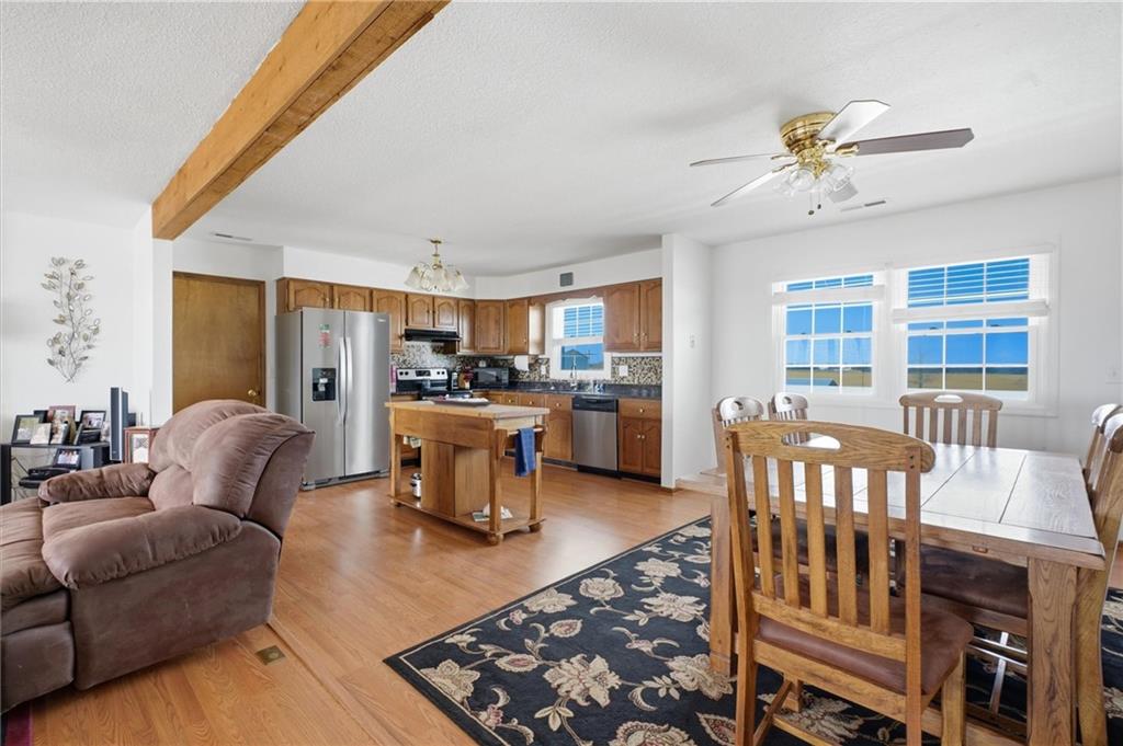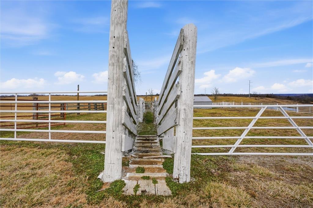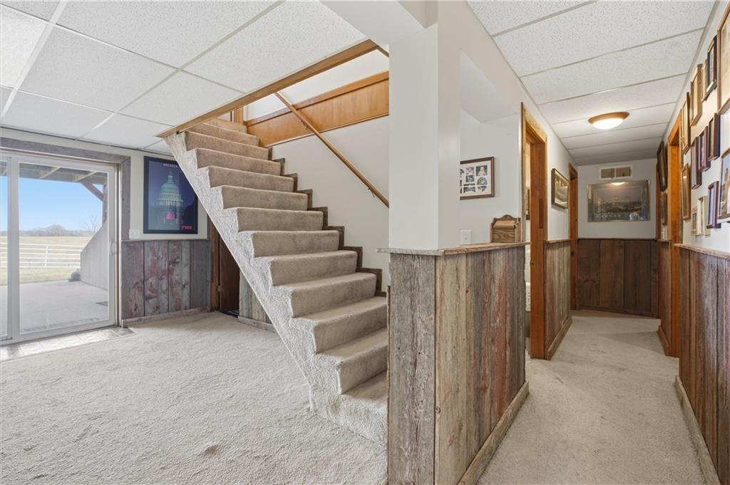 Beautifully maintained ranch home on 19+/- rolling acres featuring 2 main level bedrooms plus 3 non-conforming bedrooms in a fully finished walkout basement complete with a large second kitchen and spacious living room. Meticulously prepped for your comfort and located just 25 minutes from Kansas City, this property delivers the perfect mix of comfort, function, and wide open space. As you drive up, scenic views unfold across your land, buildings, fencing, and stocked pond. The large covered front porch is made for conversations that turn into lasting memories. The main level offers an open concept layout filled with natural light. The kitchen has northern exposure to the property, while the living room features large south-facing windows. Two oversized bedrooms sit on the main floor, including a spacious primary suite with private bath and pond views. A full hallway bath adds convenience. The kitchen includes granite countertops and space for a full size dining table. The walkout basement expands the living space with three additional non-conforming bedrooms and direct outdoor access, ideal for multi-generational living, guests, or entertaining. Formerly a cattle farm, the property is well suited for horses and includes recently painted fencing and gates, refreshed barns, and five total outbuildings. The 40x60 shop with concrete floors and power offers serious workspace. Fencing supports multiple farm animals, including that sought after Highland cow. An additional acreage directly north is available to expand your farm life even more. In the spring, the land comes alive with lush grass and vibrant views. Peaceful country living with city access within minutes. Well cared for. Move in ready. Built for lifestyle and legacy.