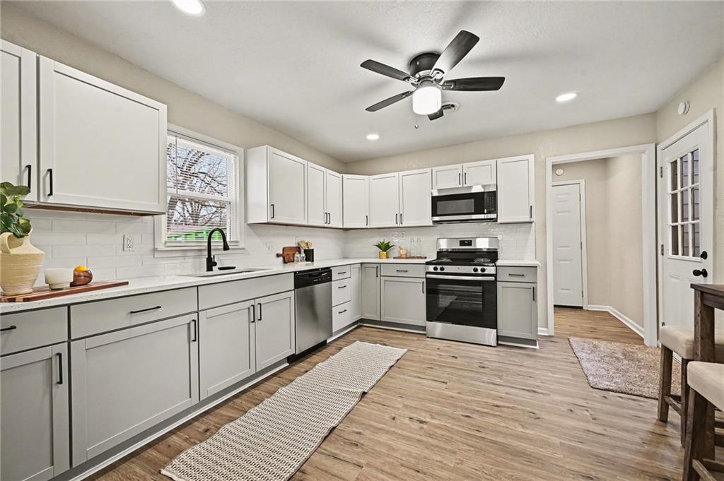 **BACK ON MARKET, NO FAULT TO SELLER** Owner-Agent. Nestled in the Bolling Heights neighborhood, you'll feel right at home in this Absolutely Charming 3 Bed 2 Bath Ranch in the Northland! This home has been completely remodeled from a Newer Roof, New Windows, New Paint inside & Out, New LVP & Fresh Carpet, New Kitchen Cabinets, Kitchen Backsplash, New Quartz Kitchen Countertops, Both Bathrooms are completely new with Modern & Stylish Vanities, Light-Up Mirrors and New Bathtub/Showers! HVAC recently inspected and is in great, working condition. Backyard is open, inviting, fully fenced and includes an oversized concrete patio for outdoor seating, grilling and entertaining. One Car Garage opens into the home for easy access and features fresh concrete paint. Enjoy one level, low maintenance living!