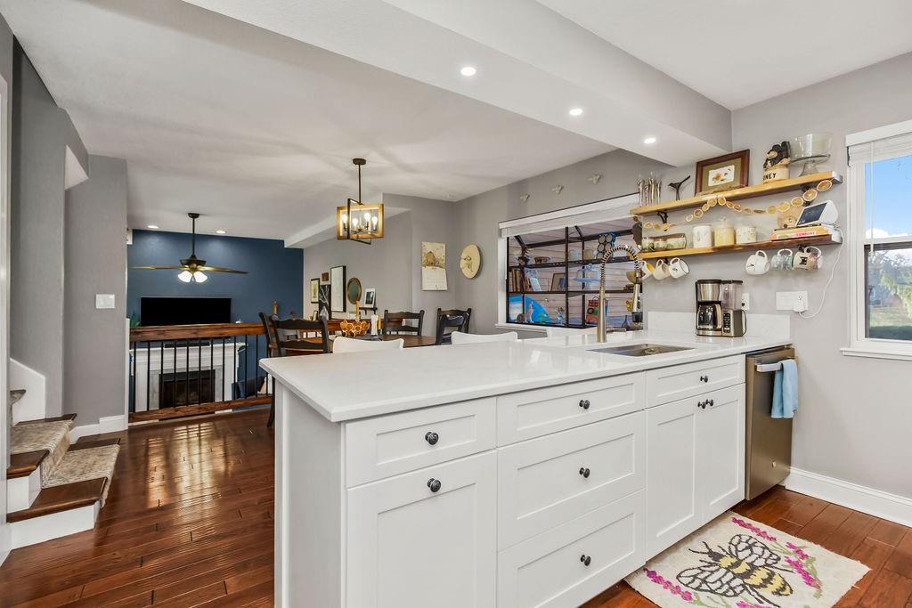 This beautifully updated townhouse offers stylish upgrades, great natural light, and low-maintenance living. Large windows throughout the home fill the space with natural light, highlighting the vaulted living room ceilings, cozy fireplace, and unique steel beam detail that adds character to the space. The fully renovated kitchen features new cabinets, countertops, sink, faucet, backsplash, lighting, and appliances, along with a convenient laundry and pantry area just off the kitchen. Smart switches have been added throughout the home for modern convenience, and all interior paint has been refreshed. Upstairs you'll find two bedrooms, including a spacious primary suite with new carpet, paint, and ceiling fan, plus a walk-in closet and private bath with double vanity. The primary bedroom also features its own private balcony. An additional full bathroom was added upstairs, making the layout even more functional. The finished walk-out basement offers flexible space that can easily serve as a third bedroom, complete with a closet, plus new flooring, trim, and paint. Outdoor spaces include an updated deck with new lighting and fan, perfect for relaxing or entertaining. Monthly HOA covers snow removal, lawn maintenance, tree care, leaf removal, and trash, making this a great option for easy, low-maintenance living.