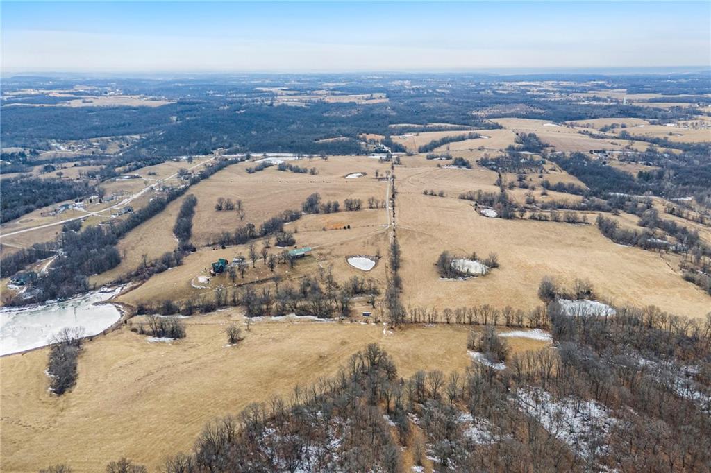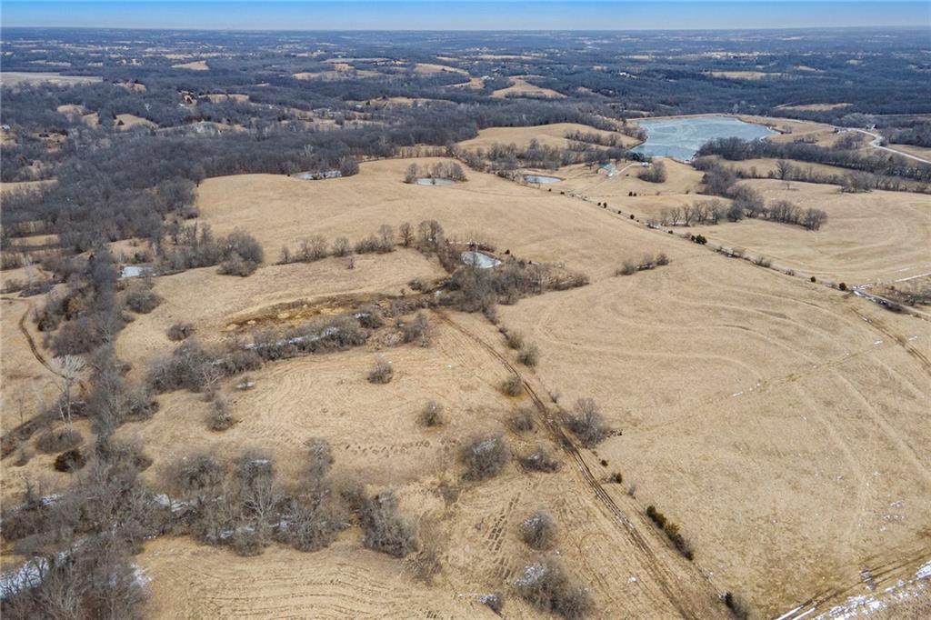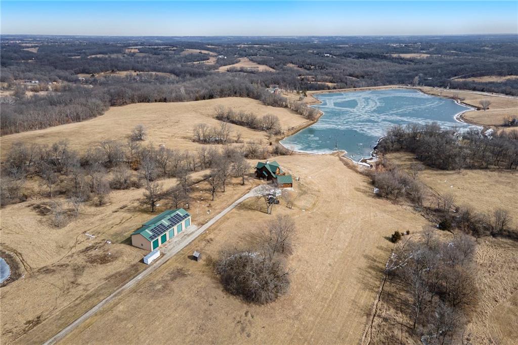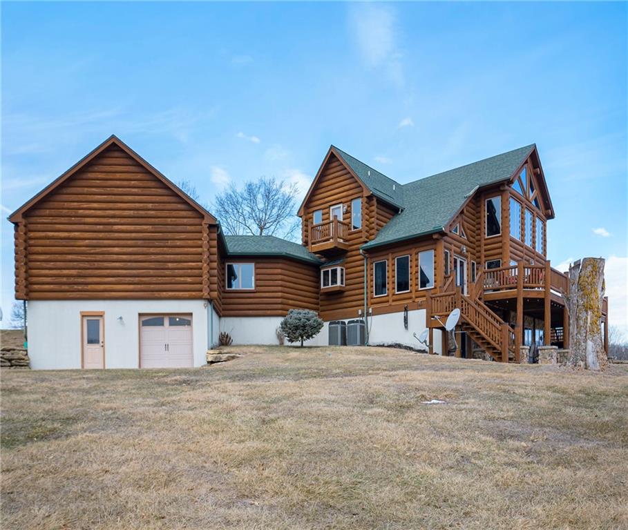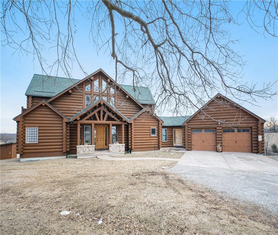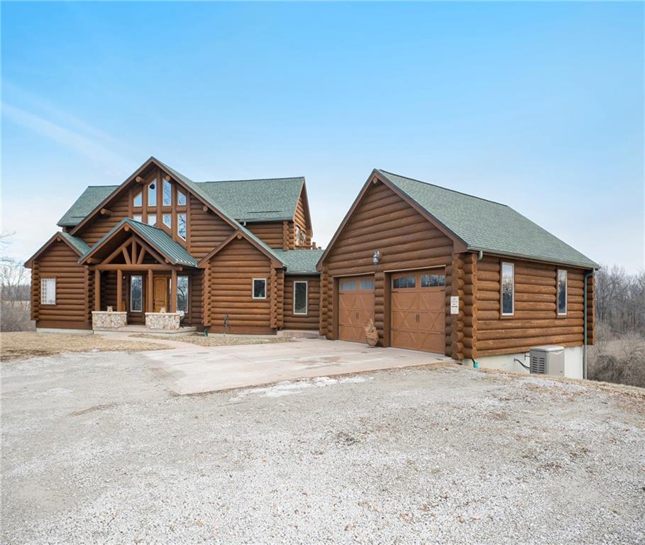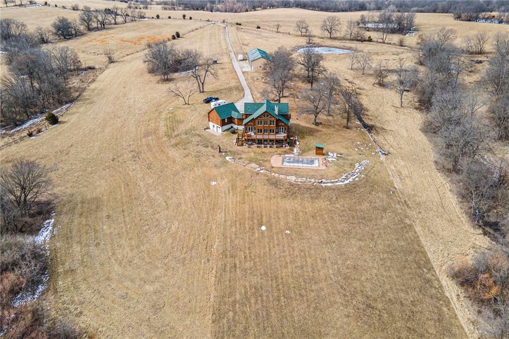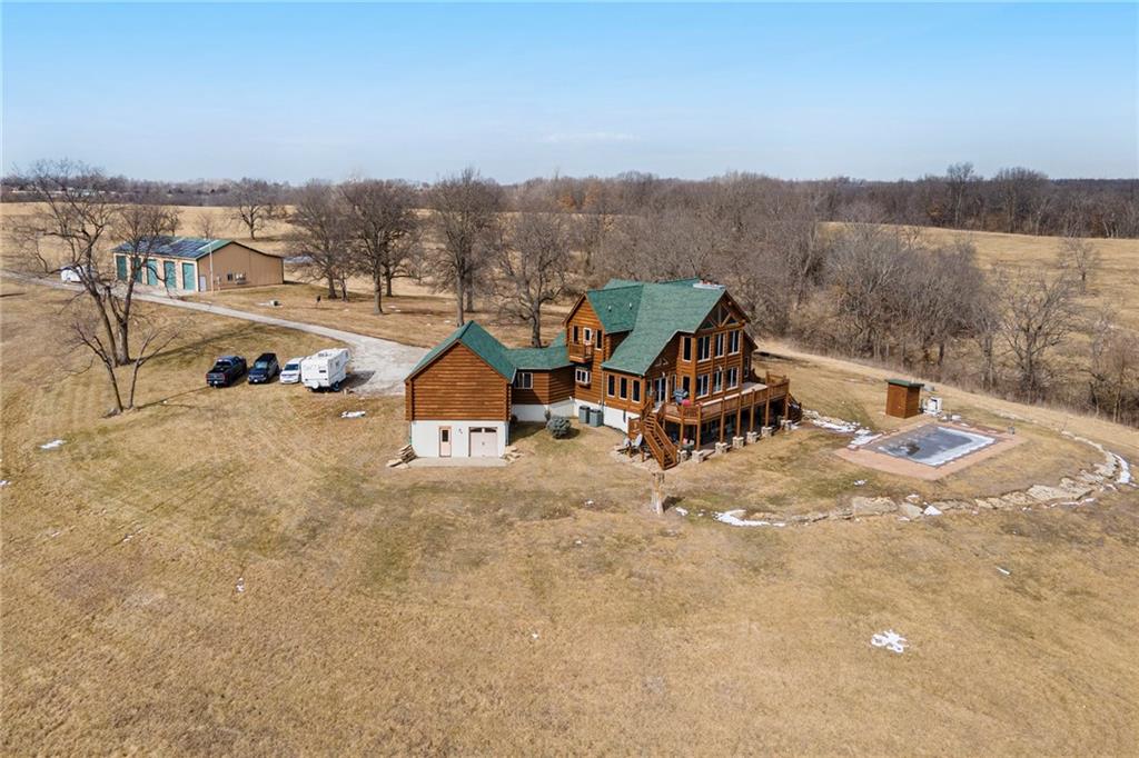 STUNNING CUSTOM LOG HOME located on 67+/- acres FULLY FENCED & cross fenced featuring a GORGEOUS LAKE!! 40x98 OUTBUILDING & lean to w/solar panels. PASTURE GROUND for your LIVESTOCK & HAY PRODUCTION along with timber. This RURAL RETREAT offers loads of RECREATIONAL OPPORTUNITIES for you and your family! The 4 bedroom 4.5 bath home offers an OPEN PLAN perfect for entertaining! CHEF'S KITCHEN features HUGE ISLAND, granite tops, CUSTOM CABINETS w/roll outs, pantry, dining space & more! SOARING CEILINGS & so many windows to take in the VIEWS! Main level primary suite w/SITTING ROOM & BEAUTIFUL STONE FIREPLACE! Don't miss the spacious laundry and mud room space for convenience. The upper level has 2 SECONDARY BEDROOMS with their own PRIVATE BATHS, walk in closets and balconies. The LOFT SPACE overlooks the EXQUISITE GREAT ROOM, STONE FIREPLACE and WALL OF WINDOWS! Finished walk out LL has the 4th bedroom & full bath, 16x8 SAFE ROOM, bonus room, REC ROOM W/3RD stone fireplace and WET BAR and 2 storage spaces. RELAX and watch the SUNSETS & WILDLIFE from the low maintenance deck overlooking the SALT WATER IN GROUND POOL & LAKE! This is a ONE OF A KIND meticulously maintained property 30 minutes from Kansas City. Square footage, acreage, schools, taxes, etc are approximate...buyer and buyer's agent to verify