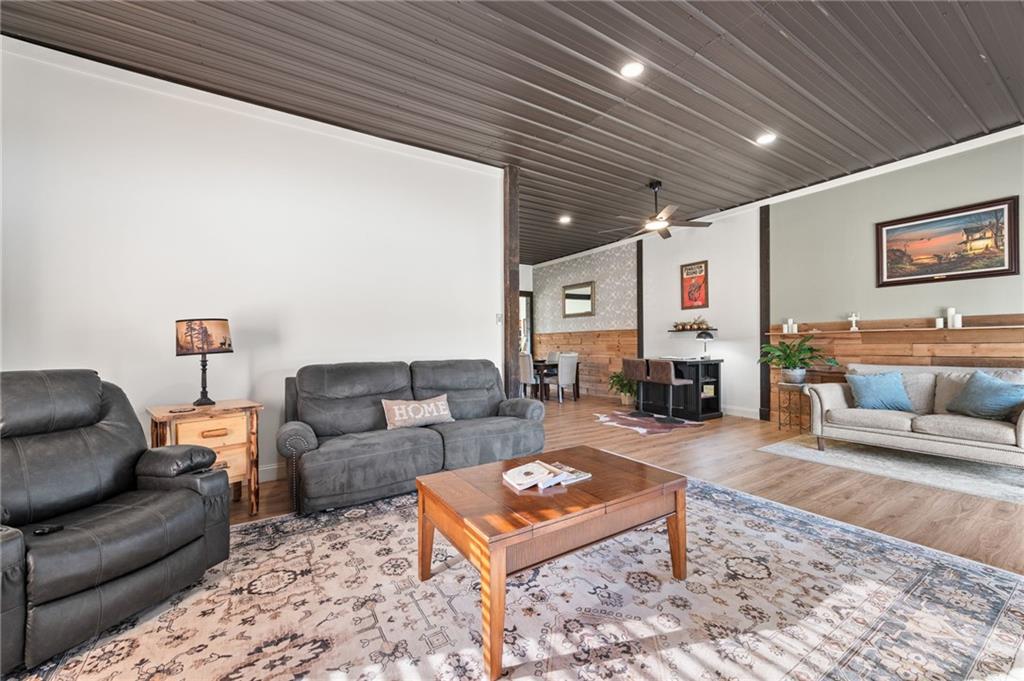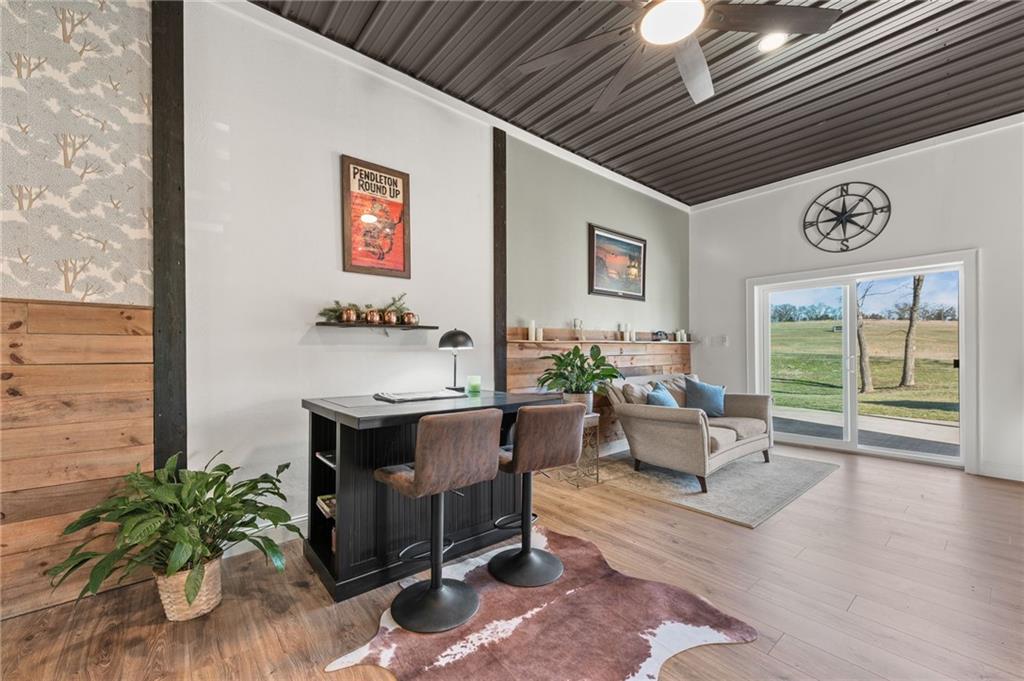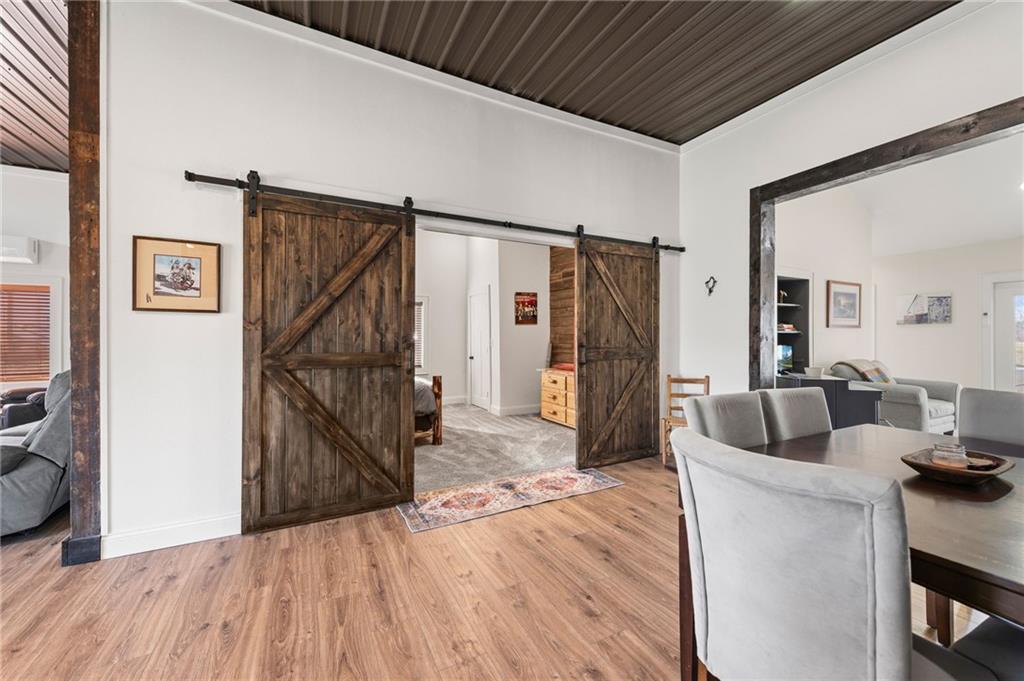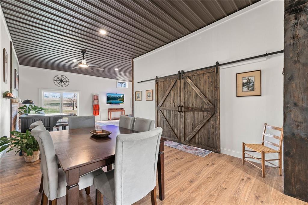 Welcome to your private slice of country paradise! Nestled on over 7.5 acres, this stunning barndominium has been thoughtfully expanded and upgraded to offer the perfect blend of charm, functionality, and wide-open space. Now featuring over 2,100 square feet, the home includes an additional bedroom, living area, and dining space—giving you room to spread out while maintaining that cozy, inviting feel. The newly added space is truly stunning, showcasing rustic lap siding accents, sliding barn doors, and an abundance of natural light pouring in through sliding glass doors that open to peaceful views of the pond. Whether you're sipping coffee at sunrise or unwinding at sunset, this space delivers. Fresh interior paint, brand-new carpet and LVP flooring make the home feel crisp and move-in ready, while the open-concept layout keeps everyday living easy and connected. Outside, the property is ready for your hobby farm dreams with newly added fencing for horses and a charming outbuilding featuring two stalls. With plenty of room to roam, garden, or simply enjoy the quiet countryside, this property offers a lifestyle that’s hard to find. With these thoughtful additions and updates, it truly delivers the best of both worlds: modern comfort paired with peaceful country living. This is more than just a home—it’s a lifestyle.