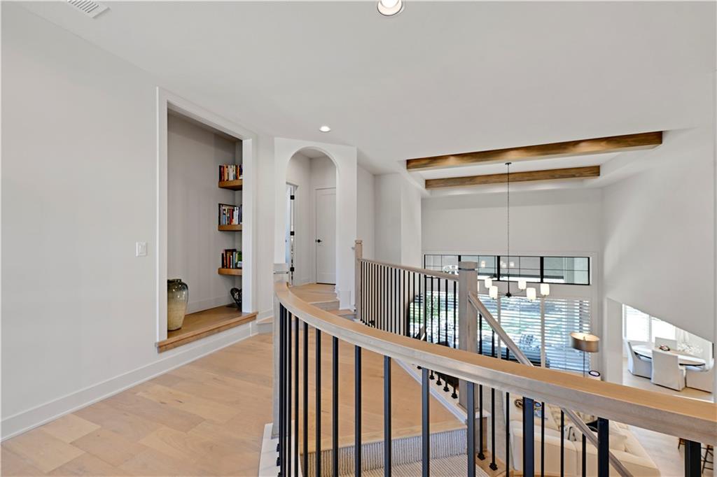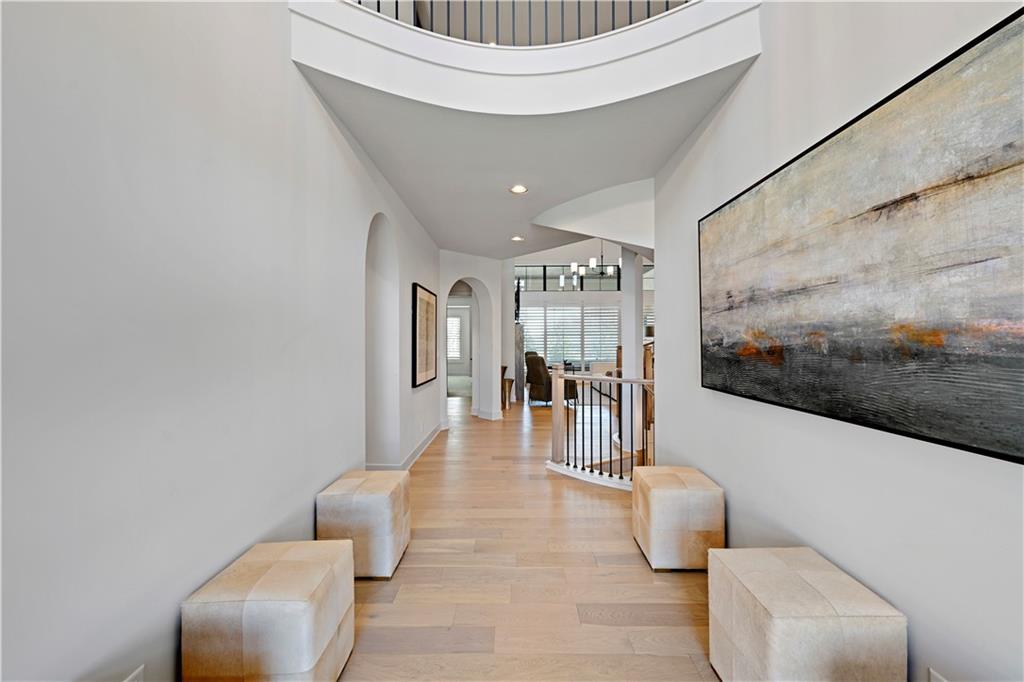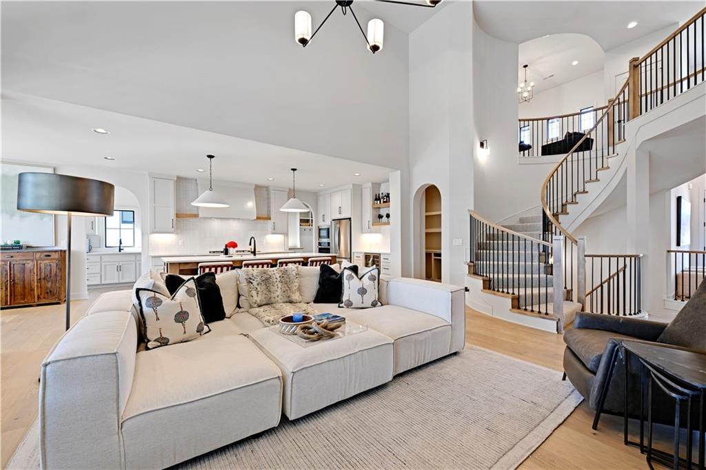 Step inside a home designed to impress, where a dramatic circular staircase and soaring ceilings create an unforgettable first impression. A grand double-door, two-story entry opens to a stunning great room featuring exposed beams, a beautiful fireplace, and expansive vertical space filled with natural light. The great room flows seamlessly to a covered deck—perfect for relaxing or entertaining year-round. The heart of the home offers both style and function, with a spacious kitchen and dining area conveniently connected to a generous pantry and prep space. A well-designed mudroom adds everyday practicality with ample storage. Thoughtful details elevate the main level, including 8-foot doors, prefinished hardwood floors in the office/study, and continued hardwoods in the second-floor hall. An open staircase leads to the basement, while a charming kids’ hideout tucked beneath the stairs adds a playful touch. Designed for modern living, the open floor plan includes four bedrooms, each with its own full bath, offering comfort and privacy for everyone. A convenient second-level laundry area serves the secondary bedrooms. Situated on a .28-acre cul-de-sac lot in a beautiful neighborhood, this home showcases extensive landscaping and a spacious fenced backyard—ideal for outdoor living, play, or pets—along with a covered deck that extends your living space outdoors. This home blends elegance, functionality, and everyday convenience in one exceptional package.
