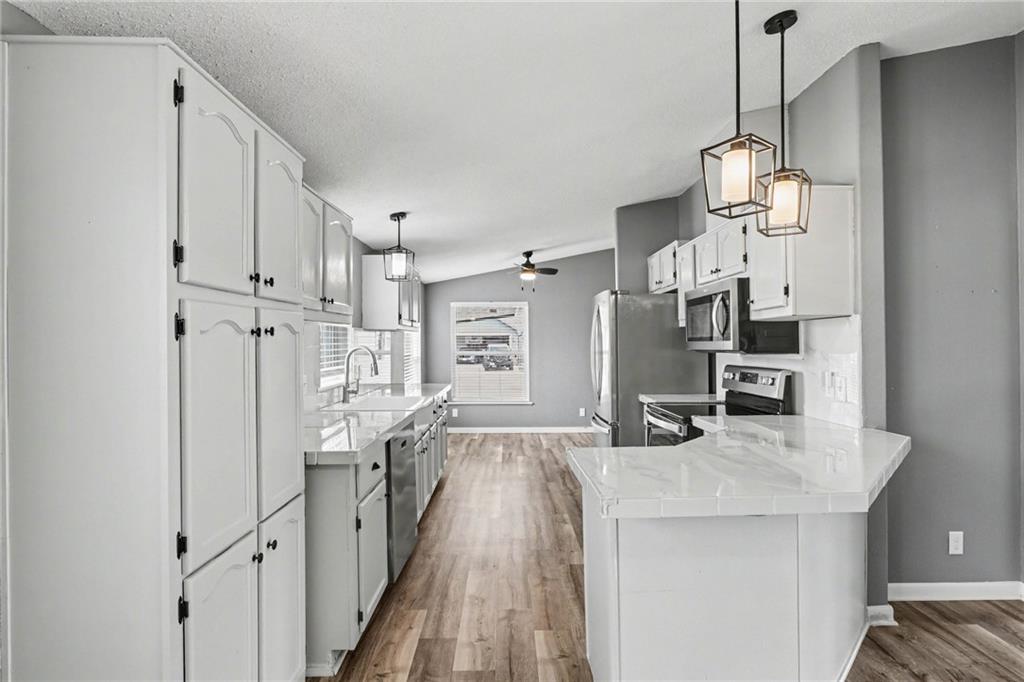 Clean, updated, and move-in ready—this one is easy to love. Step inside to a bright, open layout with vaulted ceilings, exposed beams, and durable flooring that flows throughout the main living spaces. The kitchen has been refreshed with white cabinetry, solid surface countertops, stainless appliances, and modern lighting, opening seamlessly to the living area—perfect for everyday living or entertaining. Spacious bedrooms offer flexibility, including a primary suite with private access and comfortable finishes. Outside, enjoy the covered carport, low-maintenance exterior, a deck for relaxing, and a storage shed for added convenience. If you’re looking for something that feels fresh, functional, and ready to go without the work—this is it. Schedule your showing before someone else grabs it.