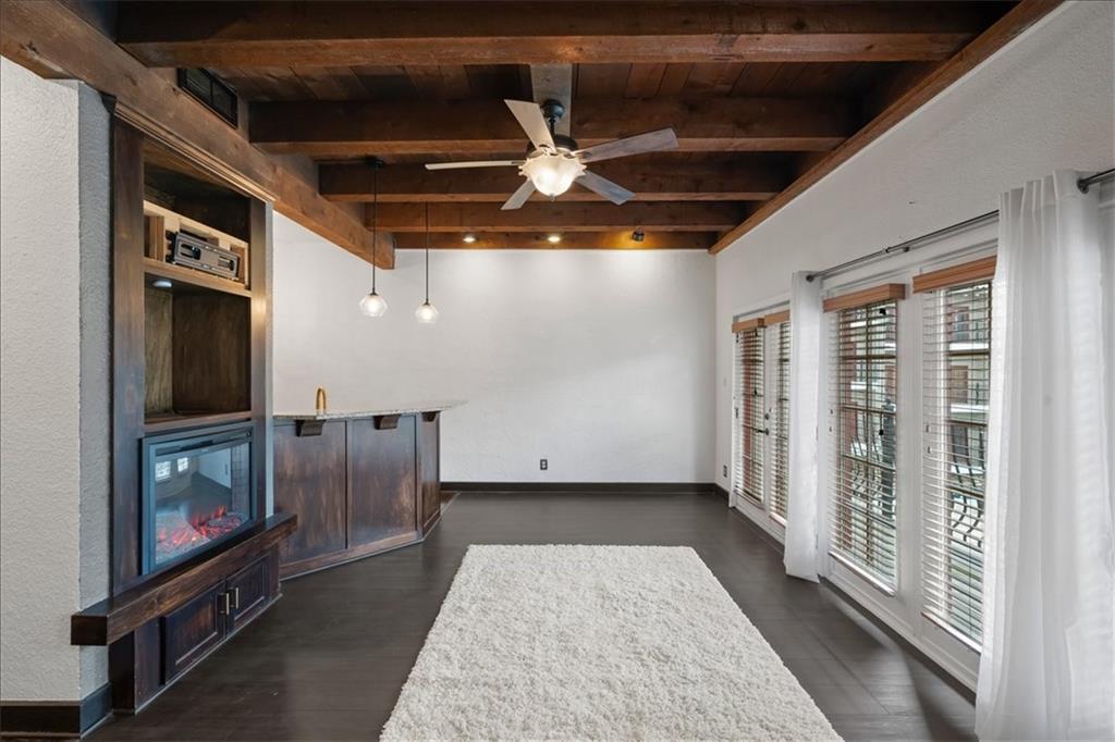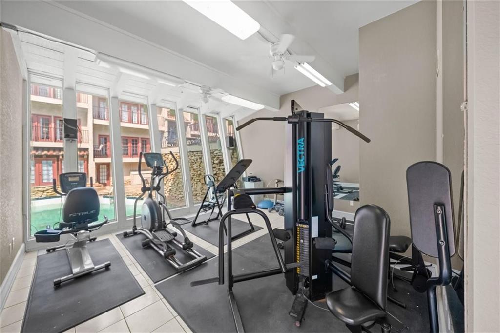 Bella Condominiums offers a lifestyle-focused living experience just moments from the Country Club Plaza. This charming Spanish-style community is centered around a resort-style pool, creating a relaxed, low-maintenance setting in a highly desirable location. This second-floor unit features true single-level living with a blend of character and thoughtful updates throughout. Interior highlights include exposed beams, wood floors, and an electric fireplace that anchors the main living space. The updated kitchen is equipped with modern finishes, ample cabinetry, and all appliances remain, including the in-unit washer/dryer combo. A standout feature of the home is the double French door entry leading to a covered deck with views overlooking the community pool—offering a seamless extension of the living space and a great spot to unwind. The unit includes two bedrooms with flexible use, along with an updated bathroom featuring quality finishes. One gated off-street parking space is included. Residents of Bella enjoy secured access and amenities such as a clubhouse, fitness center, poolside entertaining areas, and maintained grounds—ideal for a lock-and-leave lifestyle. Move-in ready and perfectly positioned near premier shopping, dining, and entertainment, this is an excellent opportunity to enjoy comfortable, convenient living near the Plaza.