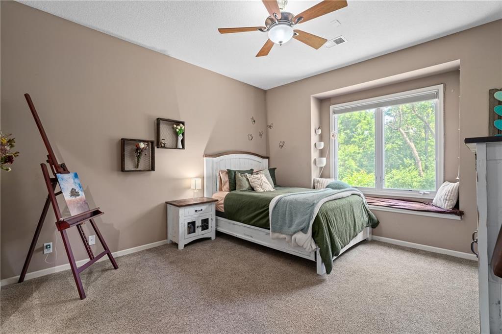 Welcome home to this stunning Don Julian reverse 1.5-story tucked on a wooded half-acre at the end of a quiet cul-de-sac in Woodland Reserve. Soaring ceilings and oversized windows frame peaceful, tree-filled views and fill every room with natural light. The main level offers formal dining, a living room with see-through fireplace, hearth room, home office, and a well-appointed kitchen with custom cabinetry, quartz counters, stainless appliances, double ovens, and walk-in pantry. A four-season sunroom opens to the deck. The primary suite features a tray ceiling, built-ins, and a two-way fireplace into a luxurious en suite bath with heated tile floors, dual vanities, soaking tub, oversized shower, and walk-in closet. A second main floor bedroom with private bath, powder room, and laundry round out the main level. The finished walkout basement includes three additional bedrooms, two with private baths, a family room with fireplace and wet bar, media room, second powder room, and second laundry. The climate-controlled 4-car garage is a dream for hobbyists and car enthusiasts alike. A built-in shed adds even more storage. Enjoy the pool, pond, walking trails, play area, and beautifully maintained common spaces this community has to offer. Tranquil setting just minutes to Oak Park Mall, Lenexa City Center, Shawnee Mission Park, K-7 and I-435.Buyer/Buyer's Agent to verify square footage.